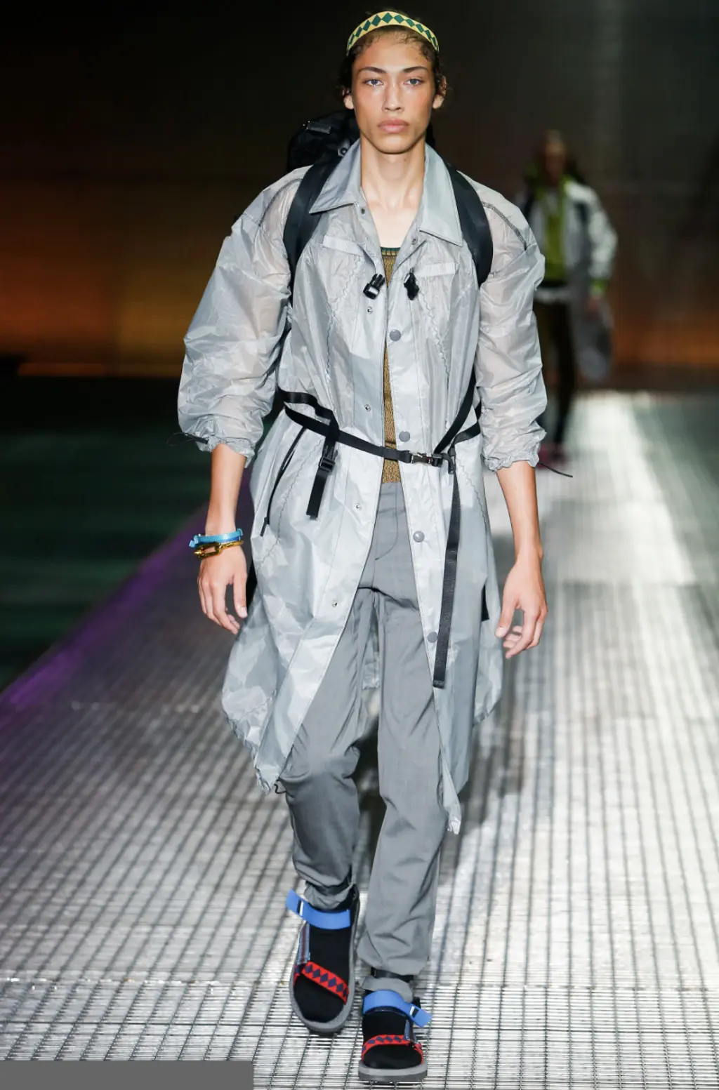 But sometime in 2017, camping got serious with Prada’s SS17 menswear collection. Making a case for otherworldly ravers, the brightly-hued collection went beyond the trail, featuring printed windbreakers, waterproof jackets, clip-on water bottles and, mostly brazenly, socks and sandals. Prada’s boys were off to a world unknown, backpacks slung. It was a collection exploring travel and followed Miuccia Prada’s previous AW16 collection, a beautifully jagged interpretation of historic, askew sailors travelling far and wide. This second-coming of travel, though, was optimistic: the orange, wide-brimmed camping hats, jackets nerdily tied to the waist and socks pulled up all pointed to a new, casual way of dressing.