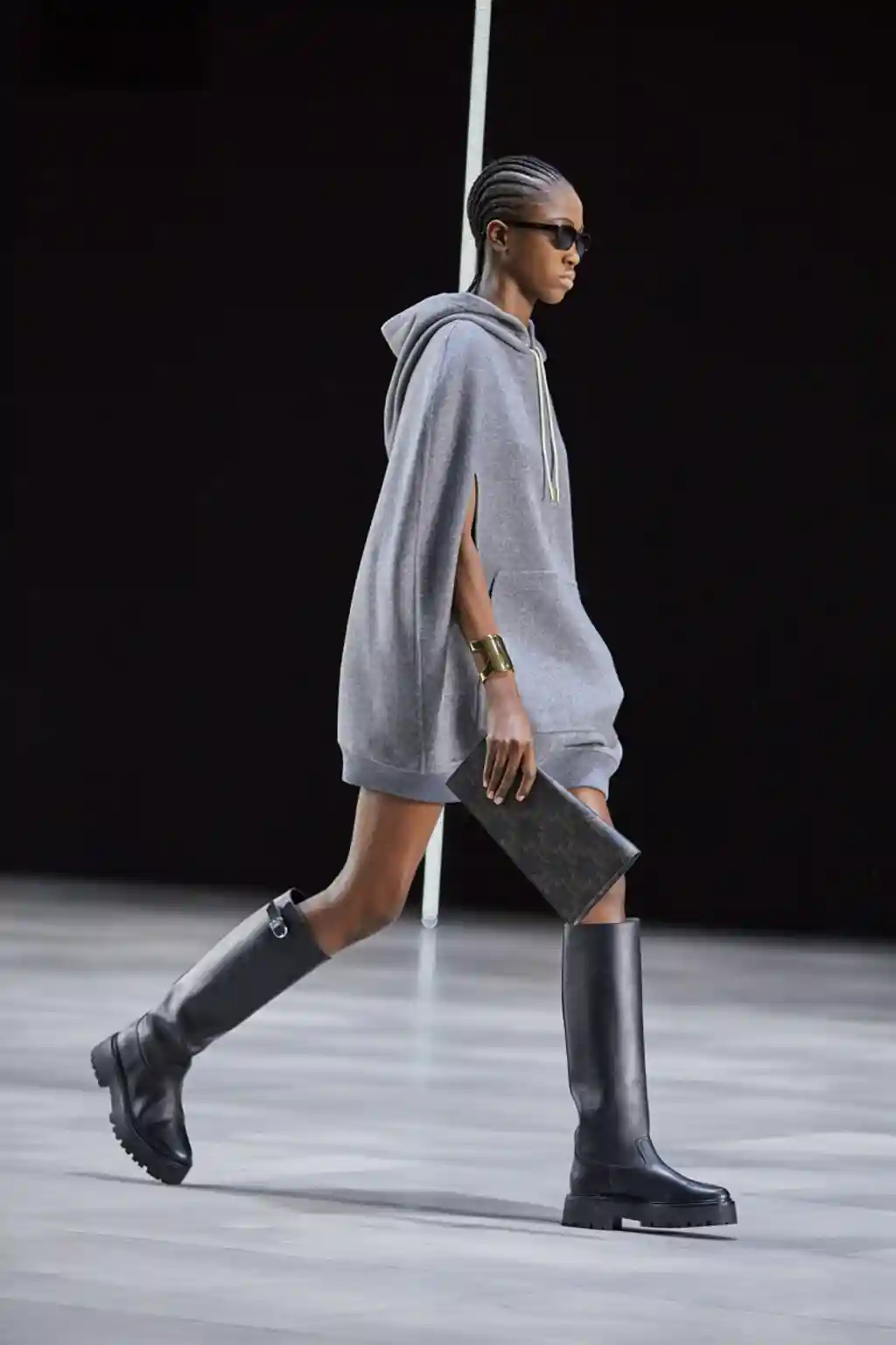 Looking at the first half of the collection, you’d be forgiven for thinking that Slimane opted to pare down any notion of extravagance – a tricky feat given the setting. Strolling below the golden ceilings came jeans – lots of ’em – and everyday wardrobe staples like a cream roll-neck jumper, a jersey zip-up and an oversized grey hoodie so large it extended into a dress. Comfort first, Hedi? Not quite.