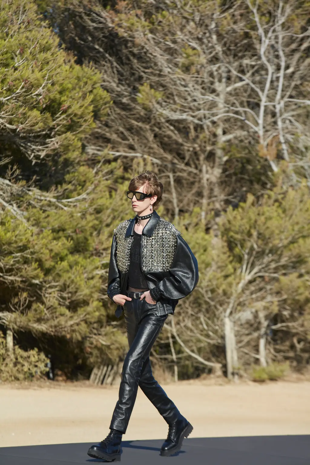 Set in the sandy Archipel des Embiez, an island in the South of France, Slimane recruited a host of motocross cyclists – who he first met and documented in LA in 2011 – to perform stunts on various ramps as the digital show progressed. And he tapped his new favourite DJ, Izzy Camina, to put together a thumping, sweat-soaked medley of house tracks, which sounded like a mash-up between Grimes, Peaches and Orbital.