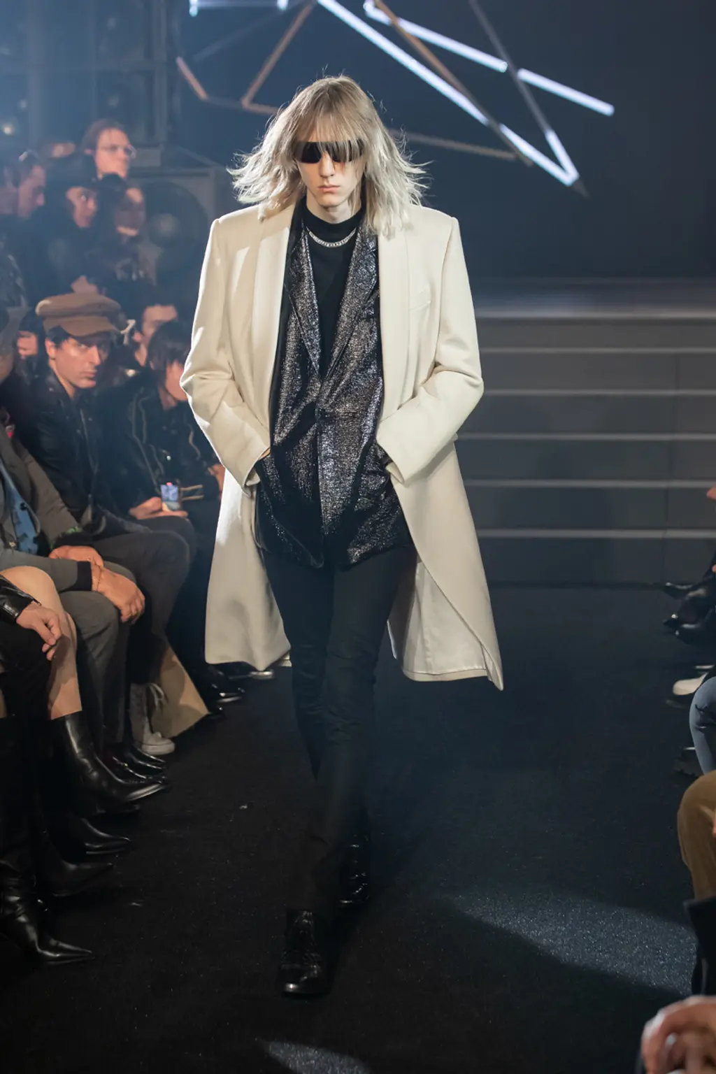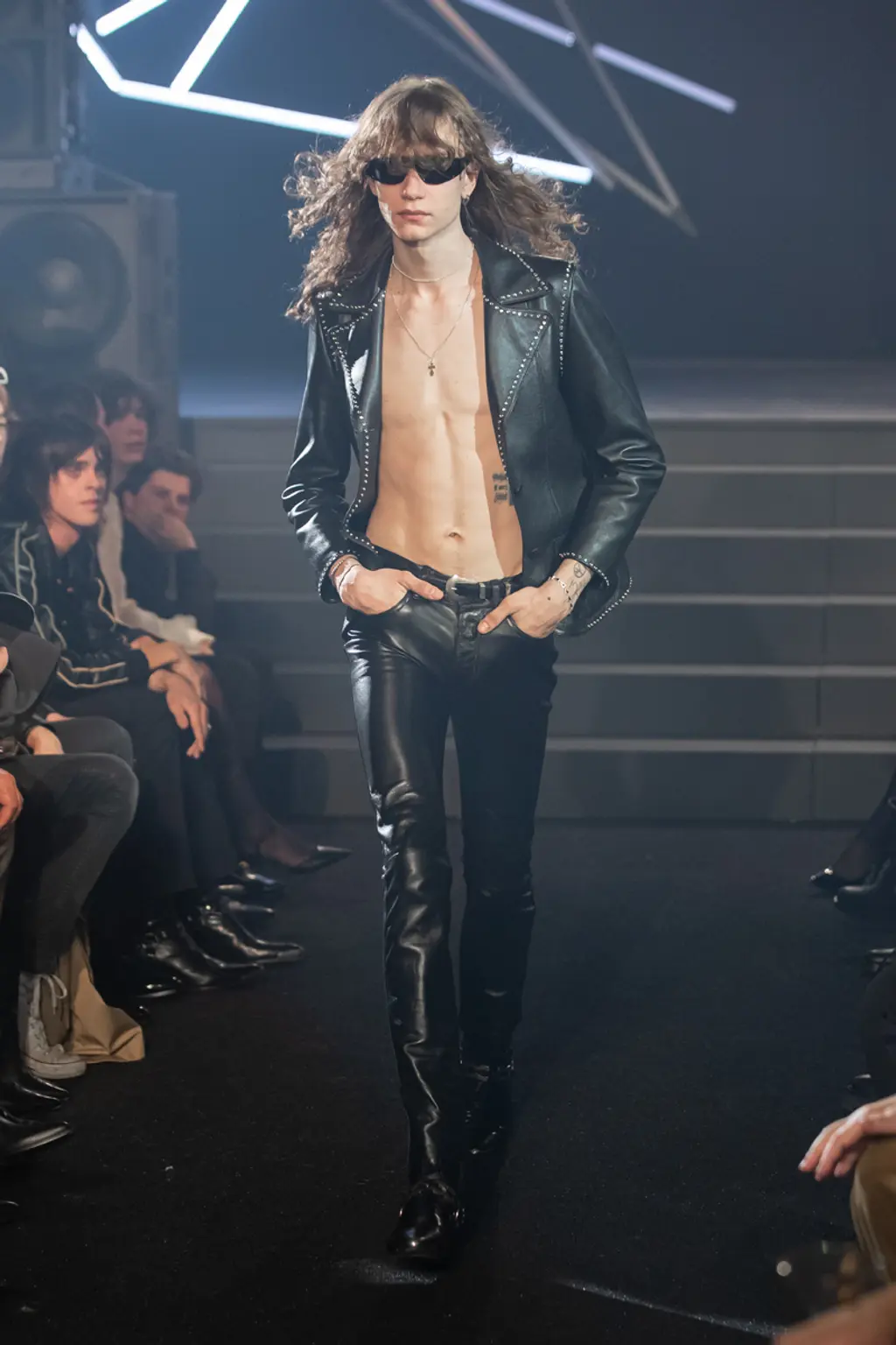 Taking place at legendary Parisian nightclub Le Palace – a venue once considered the city’s answer to Studio 54 – rock ‘n’ roll sex appeal permeated the room as shaggy-haired models sauntered down the runway to a soundtrack of iconic proto-punker band Suicide, to an audience including Jane Birkin, Jack White and Pete Doherty, who sat front row with his pet husky.
