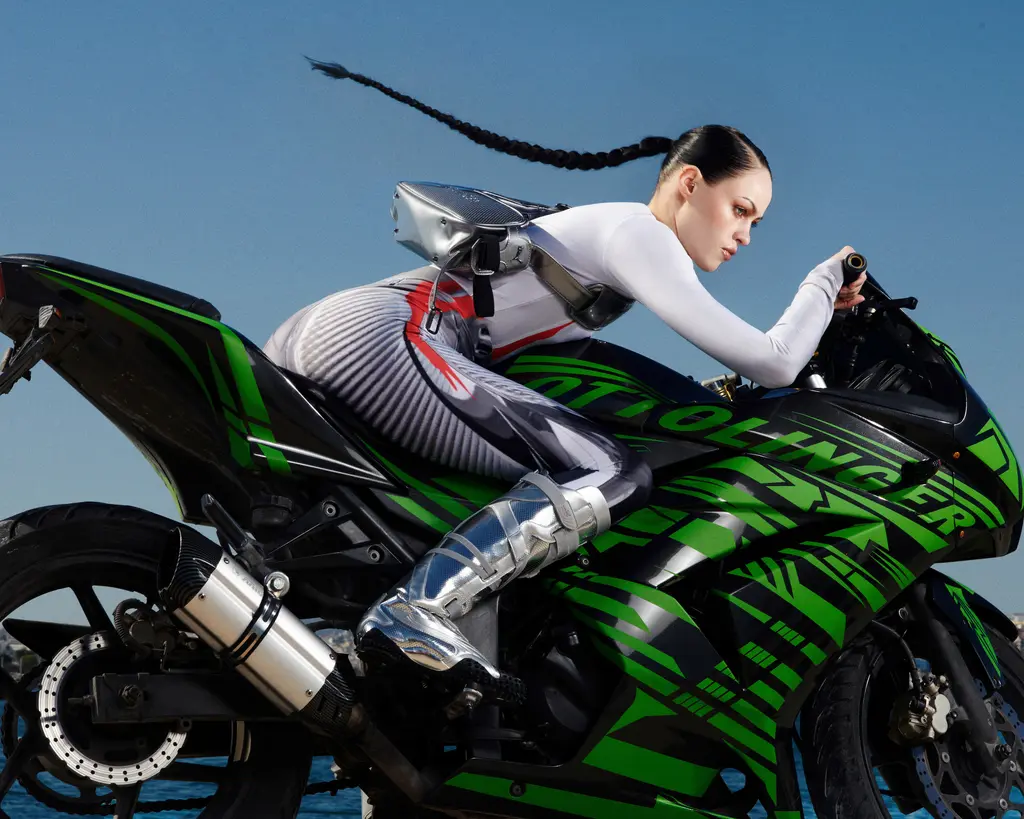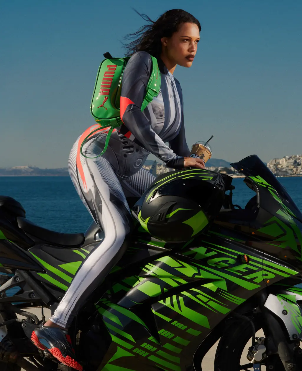 Ottolinger first collaborated with Puma in March 2023 for its AW show. Now, the friendship blossoms with a brand-new line. For its campaign, the duo brought model of the moment Alva Claire into the fold, riding a motorbike through the streets of Athens while showing off the Mini Bag, Big Bag, brand-new Mostro Lo’s and protective knee-length Mostro Boots. Hi-ya.