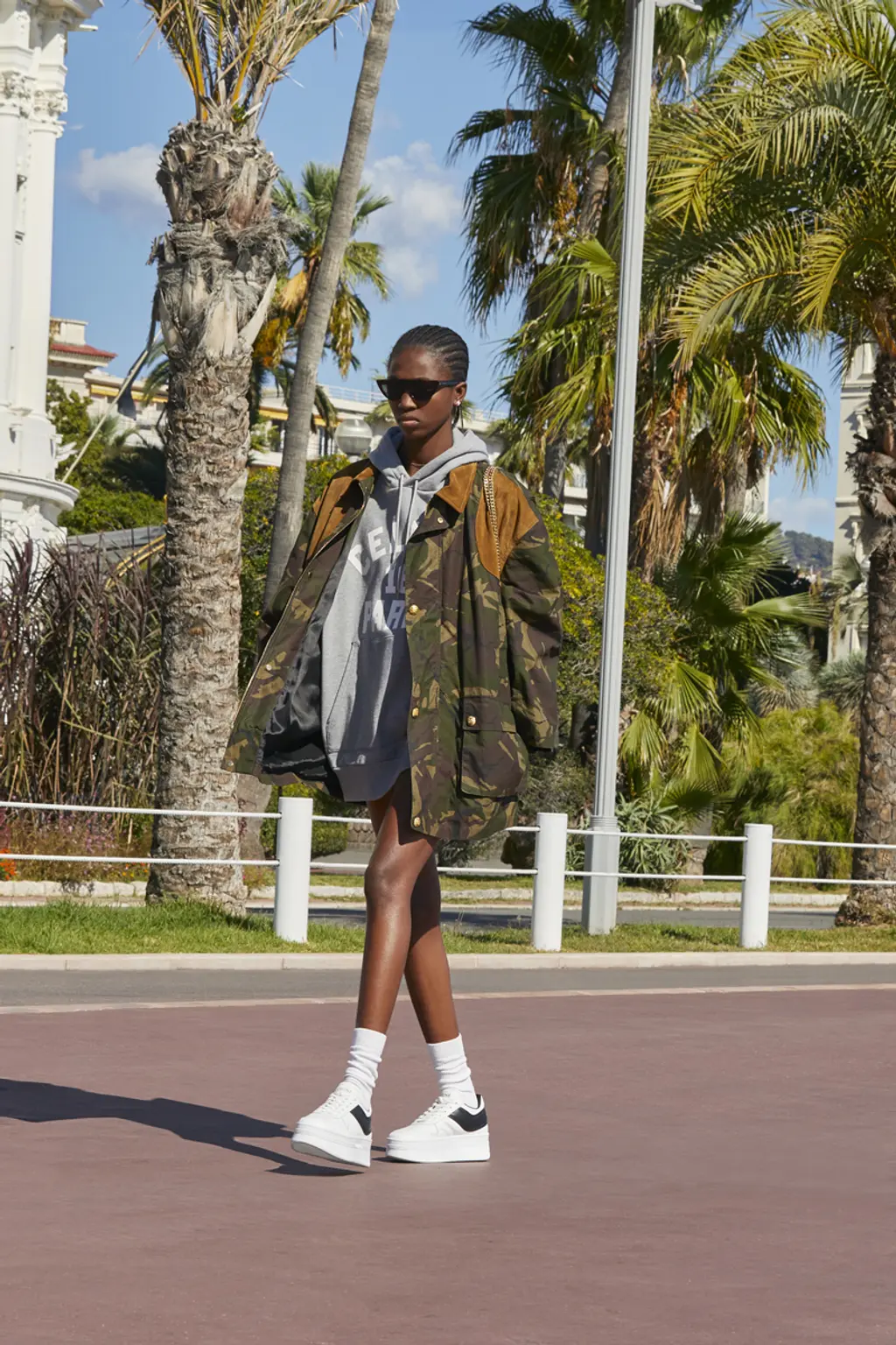 Meanwhile, a gold bomber jacket shimmers in the sunlight, paired with a leopard-print chiffon skirt blowing in the (presumably) warm wind. Ivory crocheted tunics and explorers’ hats are emblazoned with Celine’s logo, allowing the collection to segue into more sporty territory, via oversized, logoed hoodies, varsity-style bomber jackets and camo parkas.