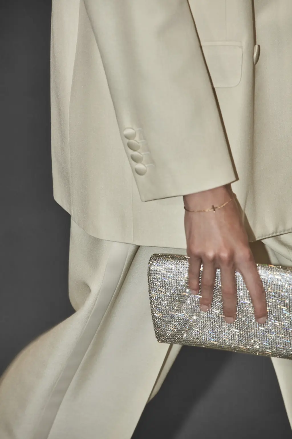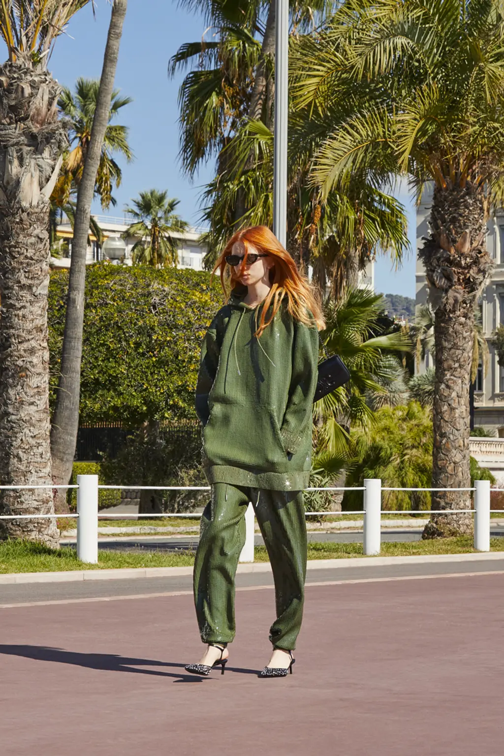 Sequins are a recurring theme throughout the collection. Not only do they adorn a khaki loungewear hoodie and tracksuit co-ord, but also a figure-hugging, cowl-neck dress with a matching clutch bag, and golden pussybow shirts with bouffant sleeves, worn with knee-length jersey shorts.