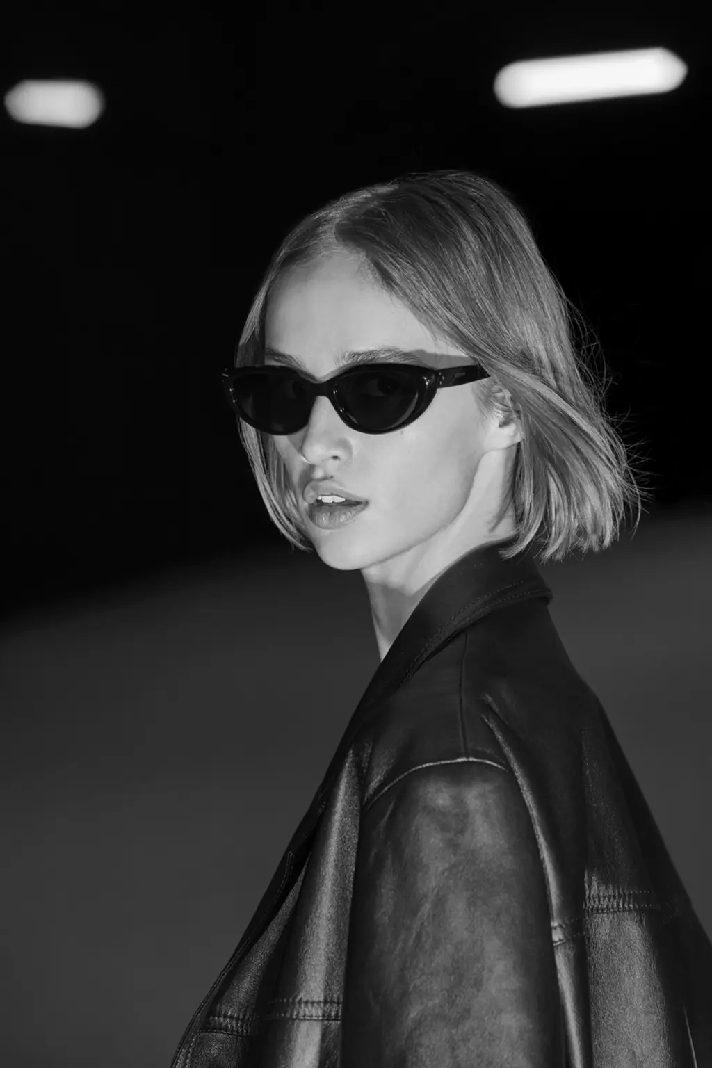 Double-breasted, bolero-style cardigans with structured shoulders help to elevate skin-tight, off-the-shoulder crop-tops, often paired with leather pencil skirts and jackets. Some are mohair and pastel coloured, accessorised with plenty of signature sunnies. Lightweight crimson leathers, trench coats and denim give the collection a casual edge, contrasted with charming peplum tops and a floral dress with a gathered, asymmetrical hem.