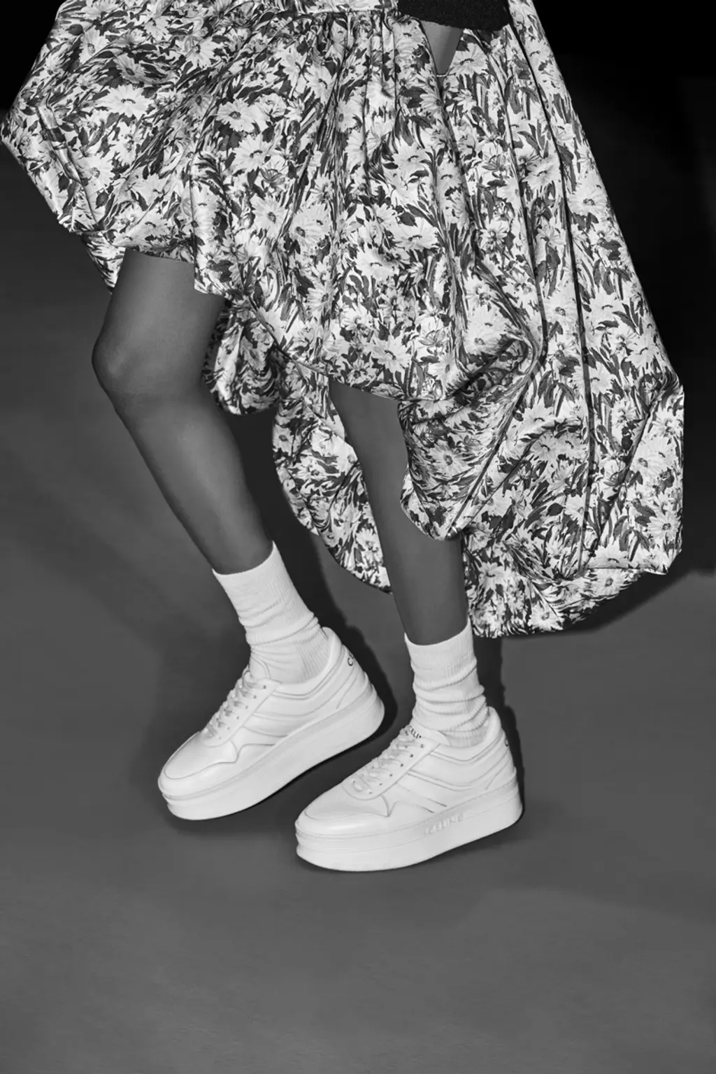 To the endlessly cool strains of Can’s 1972 deep cut Vitamin C, rapid-fire images of spinning vinyl and landscapes are interspersed with black and white shots of Celine regulars Kaia Gerber and Blackpink’s Lisa Manobal. Along the riviera, a sharp black blazer is paired with a bralette, a bodycon sequin skirt and platform trainers, setting the scene for a collection filled with glamour and shine.