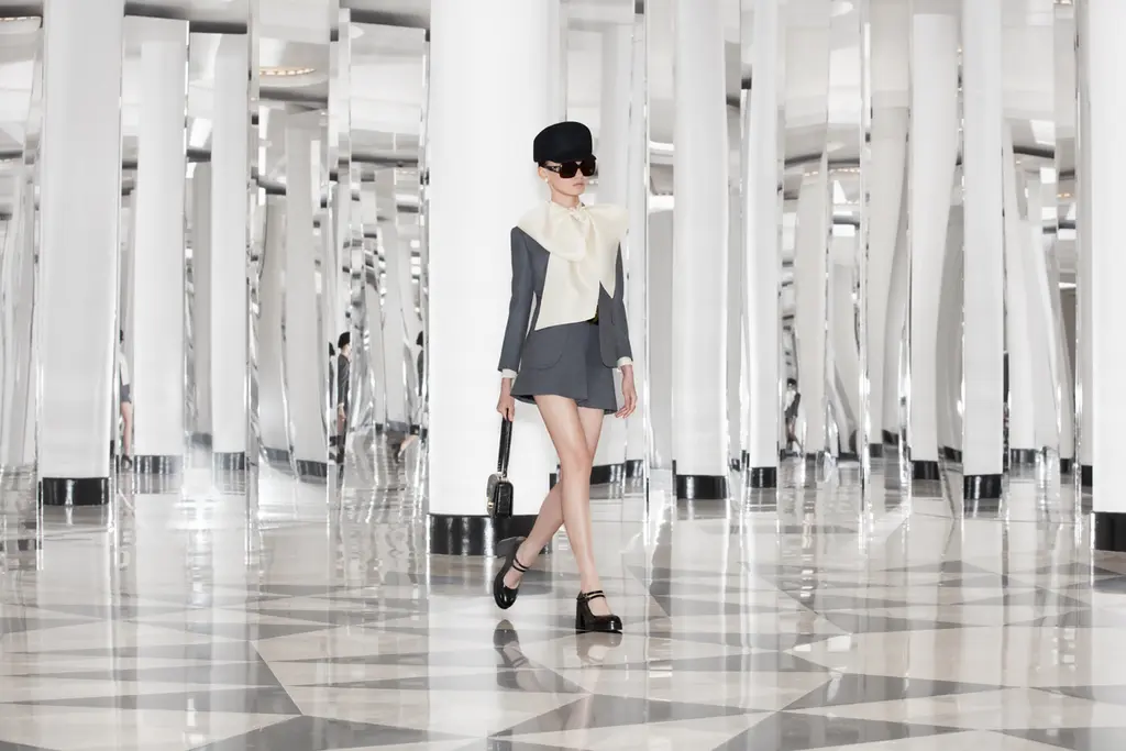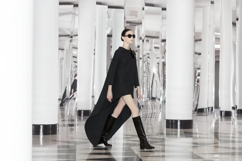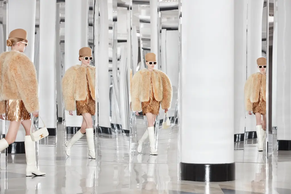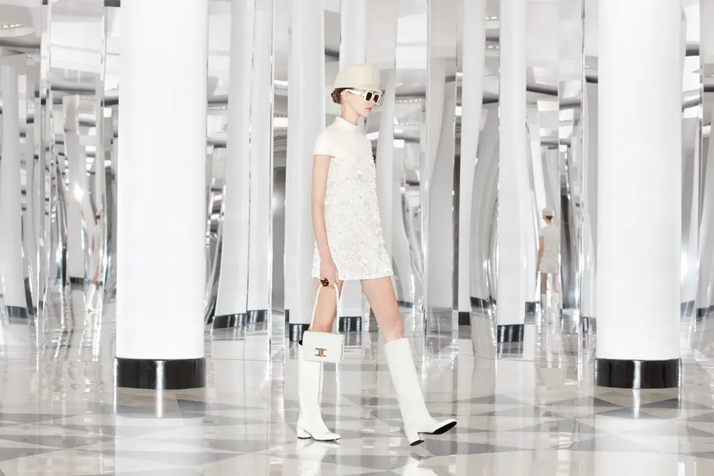 It’s worth noting that throughout the 55 looks on show, there wasn’t a single pair of trousers in sight. The first look of Celine’s Winter 24 collection, then, approached the ’60s with careful consideration: a black, boxy shift dress, a trio of pearls and Mary Jane low-rise heels; a referential depiction of the decade’s rule-breaking. The freedom that shorter hemlines offered was continued in a sharp, strapless mini dress – modern in its layered structure – and later in a heavily embellished white shift dress, paired with white go-go boots.