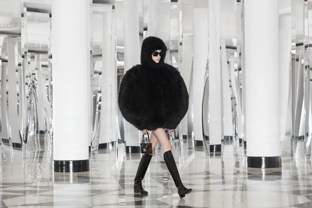 While Slimane pares things back somewhat, the designer is aware of the power of virality. And the scene-stealing white fur coat, quite literally in the shape of a snowball, will no doubt attract attention on our newsfeeds very soon. After all, Slimane might be looking back over five decades, but this is a collection for the modern rebel.