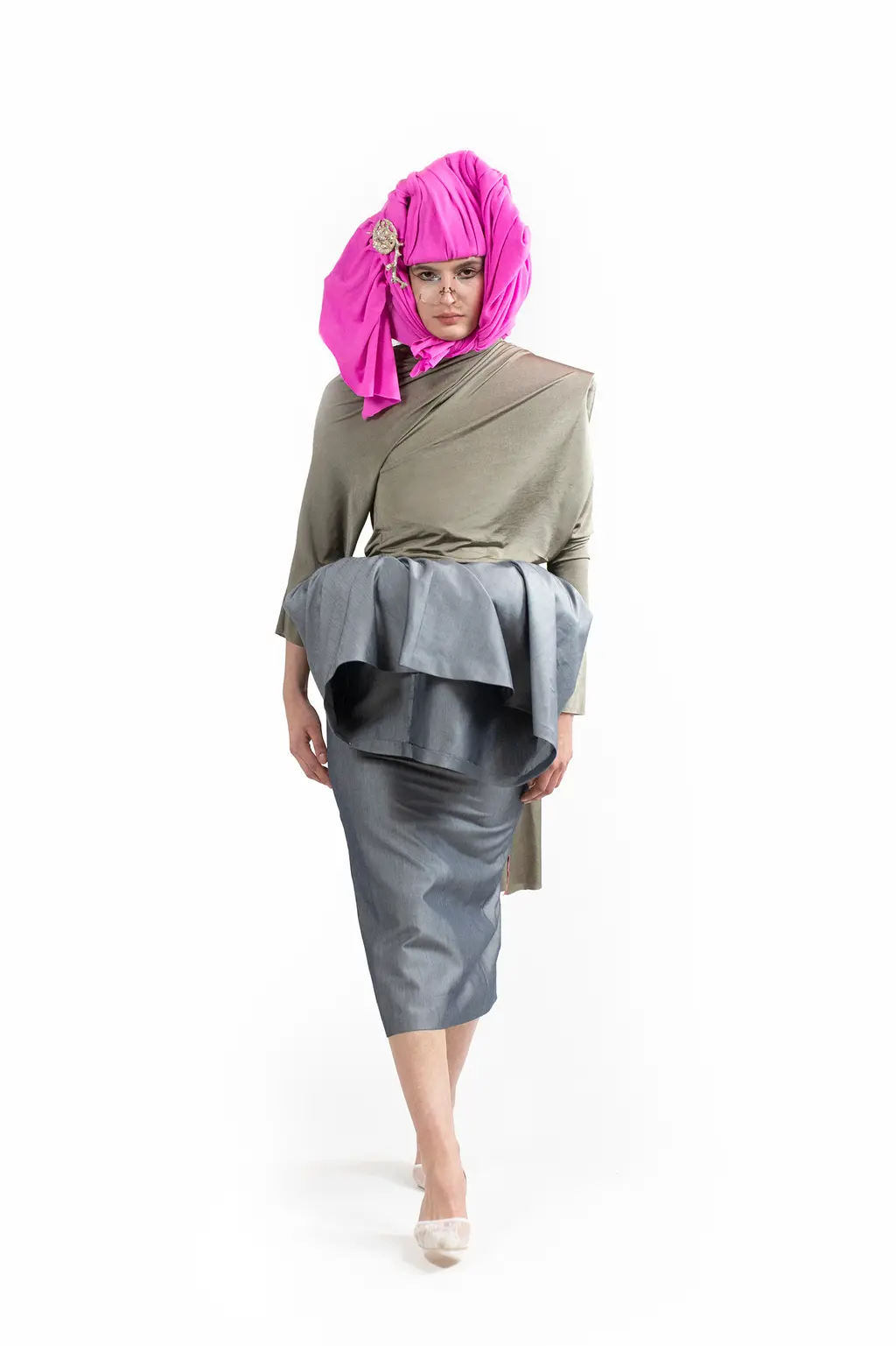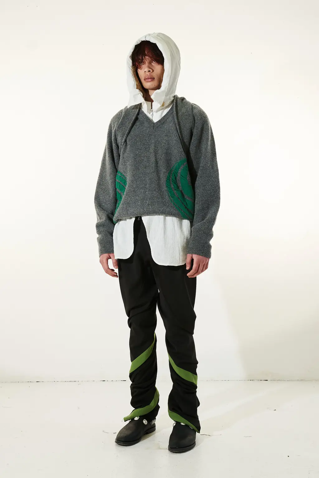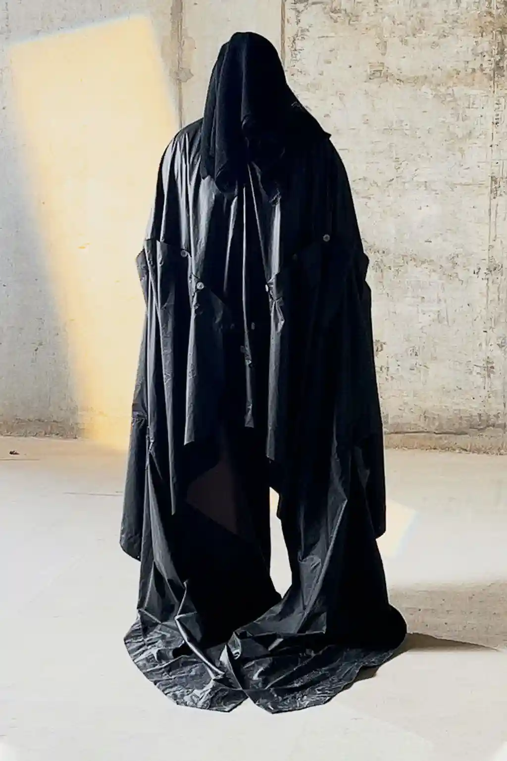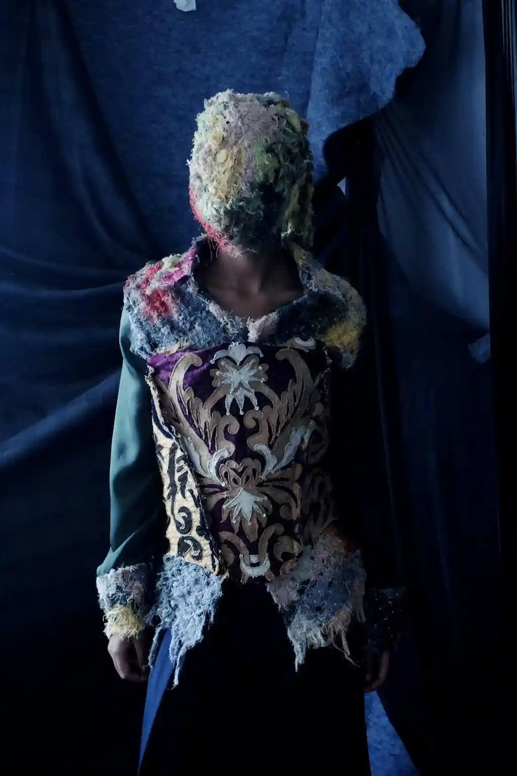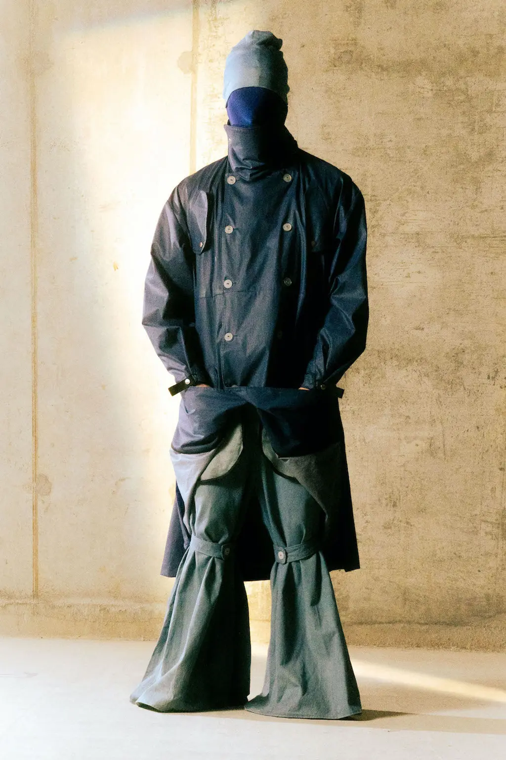 Like Adam Alaoui Elyassé, menswear designer and recipient of The British Fashion Council Dior Men MA Scholarship and The Theory Scholarship Award. Born and raised in East London, Elyassé is of Moroccan heritage. With a multi-dimensional approach to design, his final collection was a compelling conversation exploring dual identities: the diaspora of Africa and being multi-racial. The essence of the collection took its notes from traditional Muslim dress – concealing of the body and hooded veils covering the face. But Elyassé flexes his fashion muscles through the oversized, padded jackets and dramatic, floor-sweeping trousers in the name of anonymity.