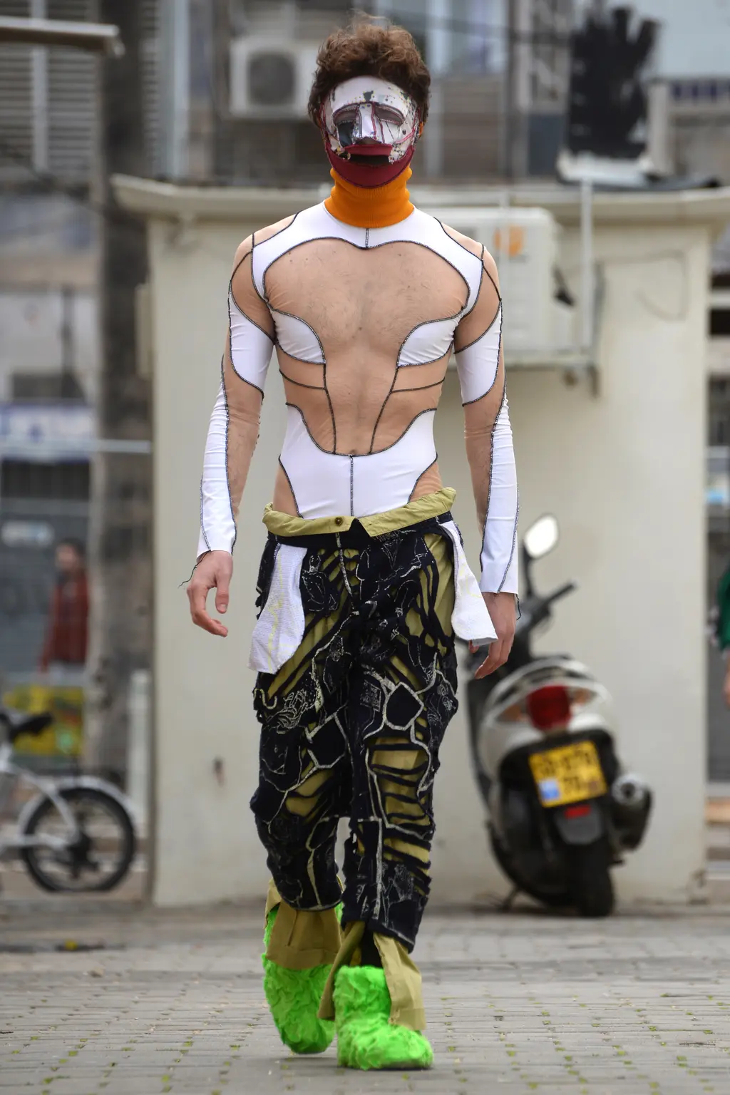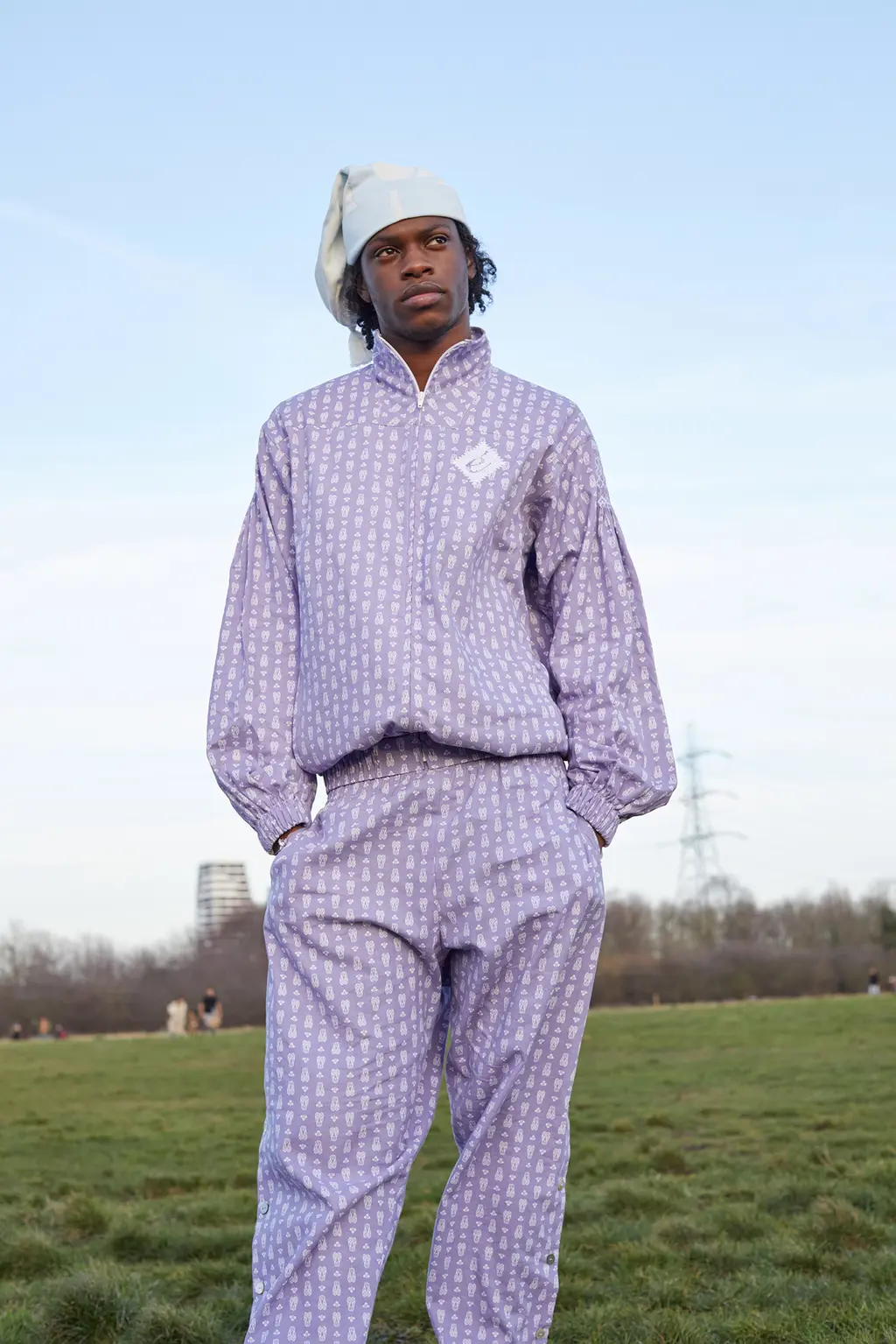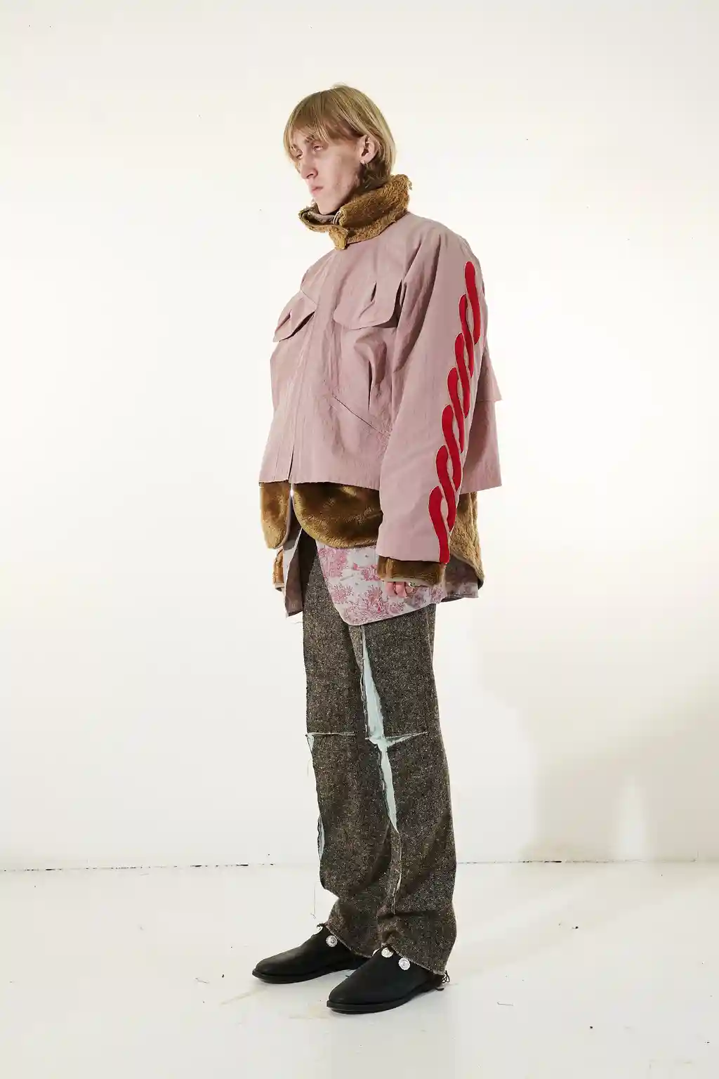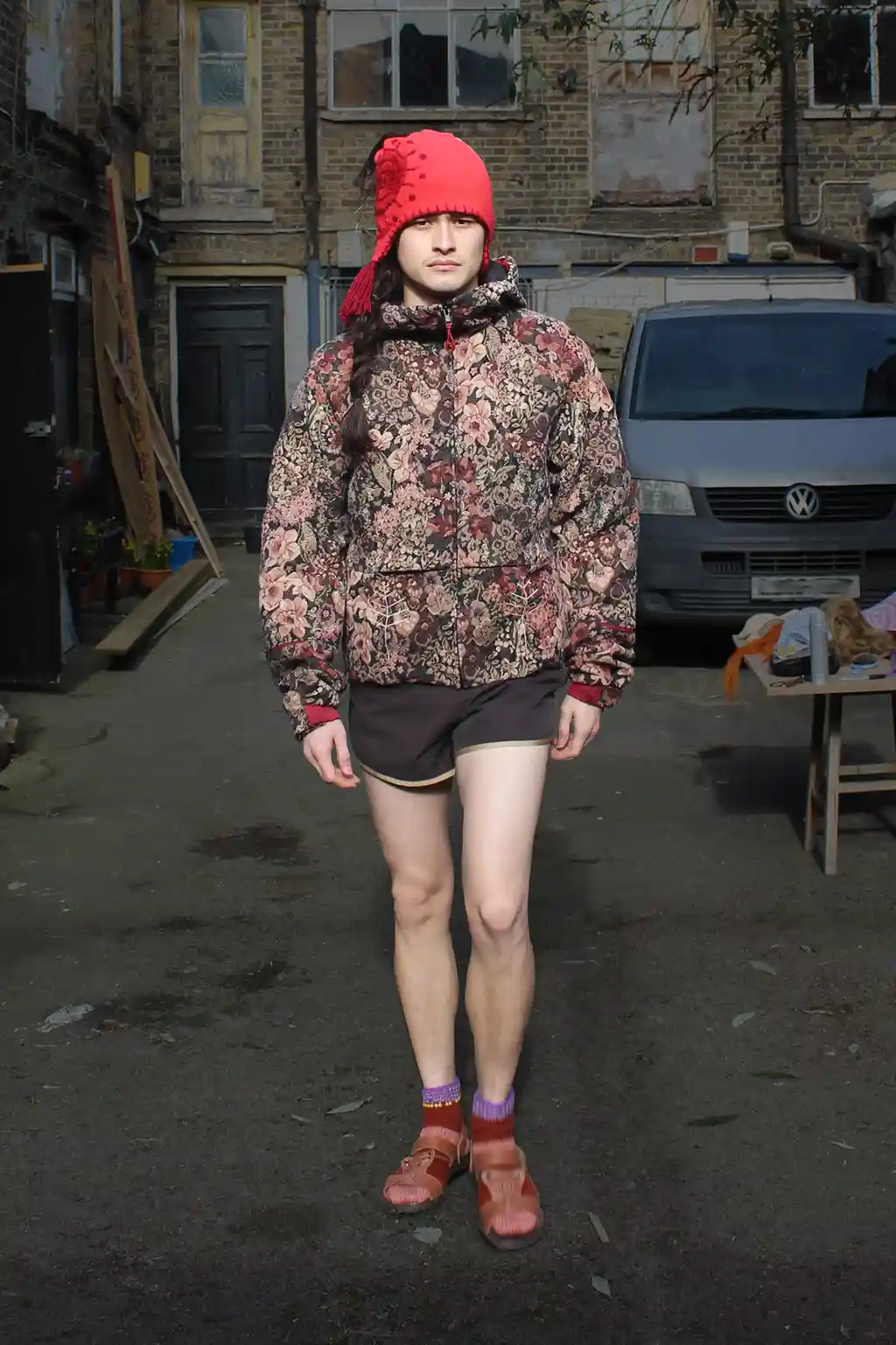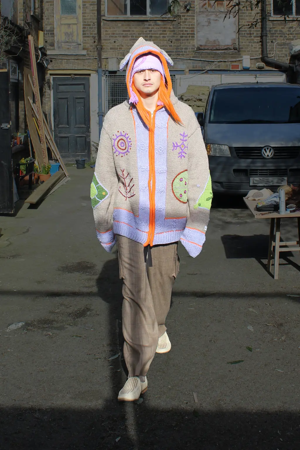 A standout? Jimmy Howe. Since his BA reveal in 2019, where the menswear designer sent his boys down a runway in teeny-tiny cycling shorts, crop tops and bollock-wincing trousers, Howe – the recipient of The Grand Prix LVMH Scholarship and The British Fashion Council MA Scholarship – has been embarking on a one-man-mission to deconstruct traditional masculinity. The toxic kind. What Howe proposes is “men who care”. Out with machismo, in with environmental altruism and selflessness. His collection, then, makes men uncomfortable, embarking on a world unknown in “feminine” palettes and, again, the teeny-tiny shorts. Like a psychedelic hit to the system, Howe’s rationale is a sobering reminder that it’s time for men to give a shit. “Emotional responsiveness makes men uncomfortable as they fear the prescriptions of their masculinity would unwind,” Howe writes in his collection’s notes.