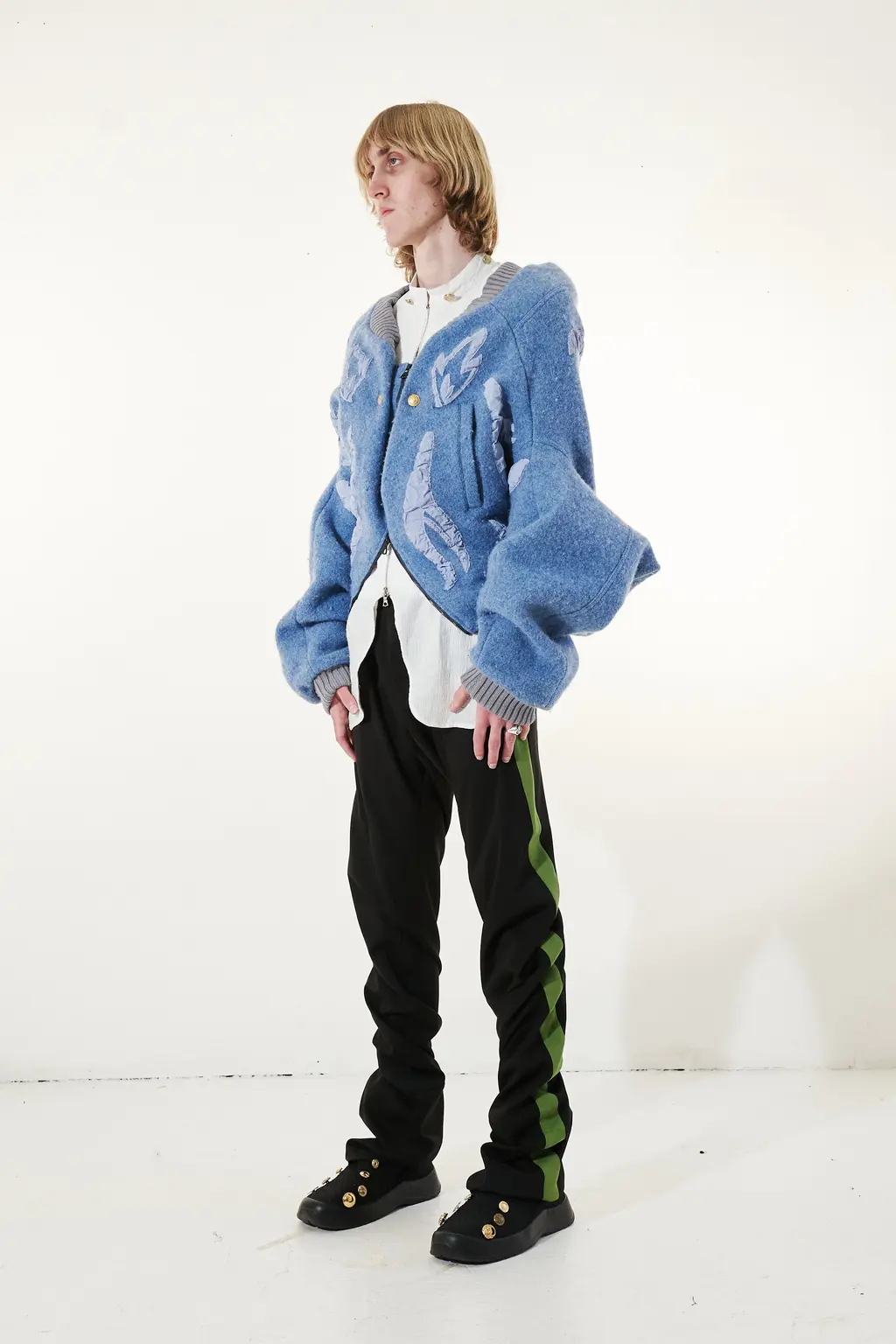 Tasha Sweeney also took cues from home – this time, up North. As a recipient of The British Fashion Council MA Final Year Scholarship, the knitwear designer took her approach a little more literally. Inspired by the Sweeney family’s obsession with Everton Football Club, her work became a hybrid of patchworked knits, taking the blue and white of the team kit and reworking it into considered checked patterns. For those who have felt the absence of their family homes in the past year, this is a homecoming – a tribute to mum, dad, and the family Labrador.