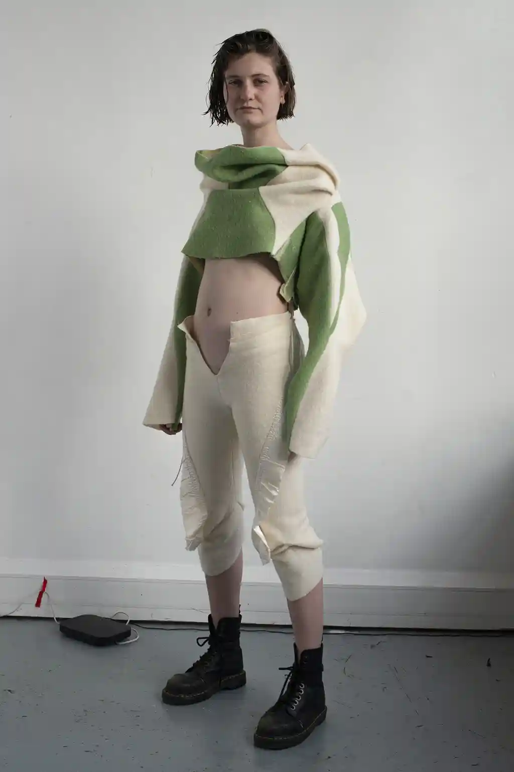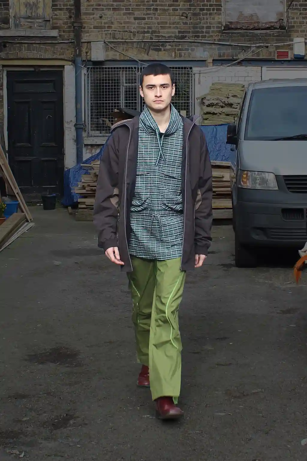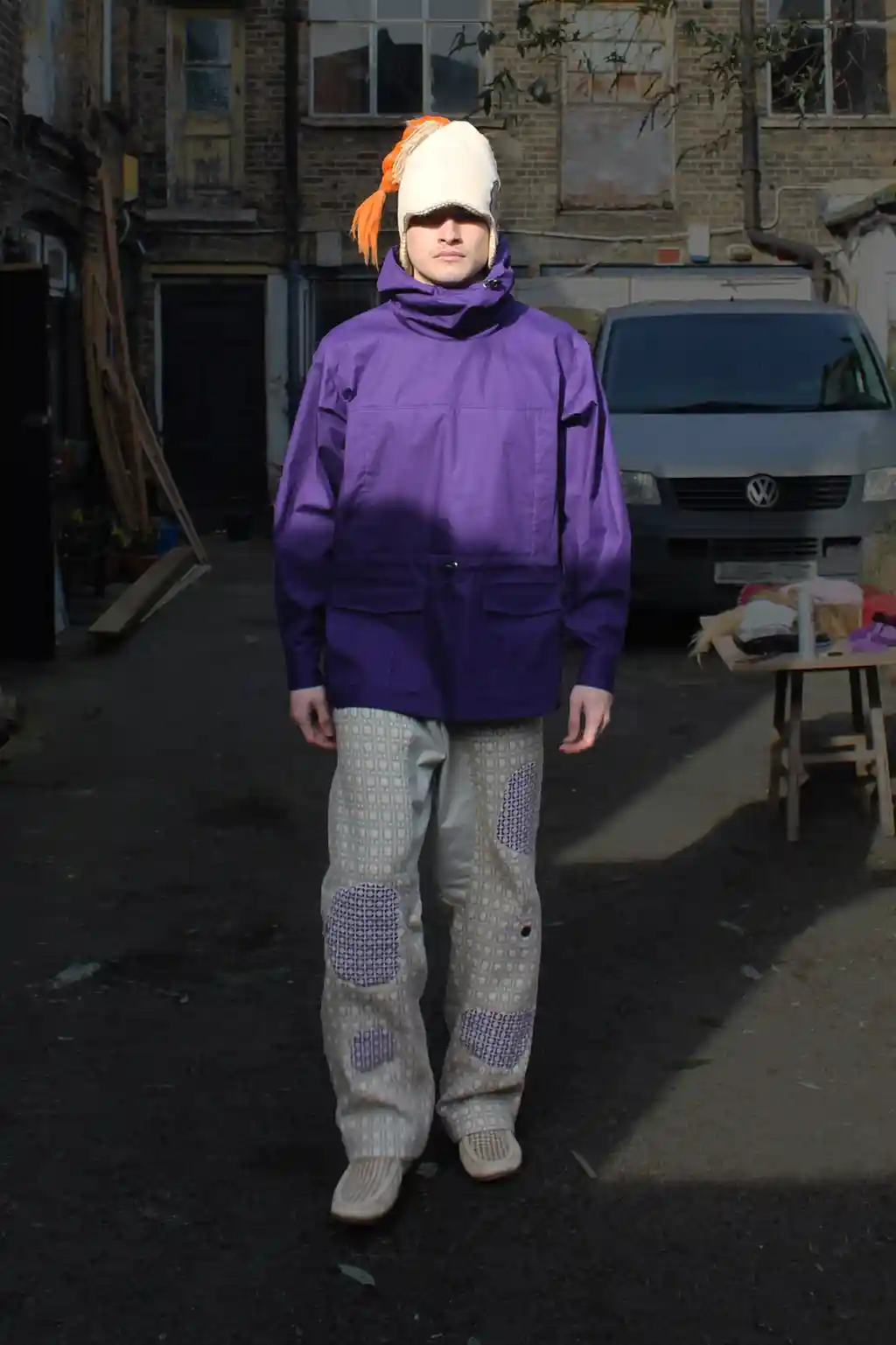 On the whole, the students were lapping up the prospect of a post-Covid future. Where abstract shapes, generous volume and rich colour celebrates the impending prospect of freedom. Take Vivien Canadas, whose womenswear collection escapes to the country – “A sip of fresh air,” as per its title. Similarly, menswear designer Horace Page opted for a grass is greener approach, with emblems of British countryside dress like Donegal tweeds and nylon windbreakers. He reinterpreted them by way of cutting, slicing and shrinking – a breakdown of status markers in occasion clothing, presented through recycled cashmere, too. Page’s approach questions class divisions in the UK, weeding out the formalwear in manor houses to assimilate to a casual style worthy of the city.