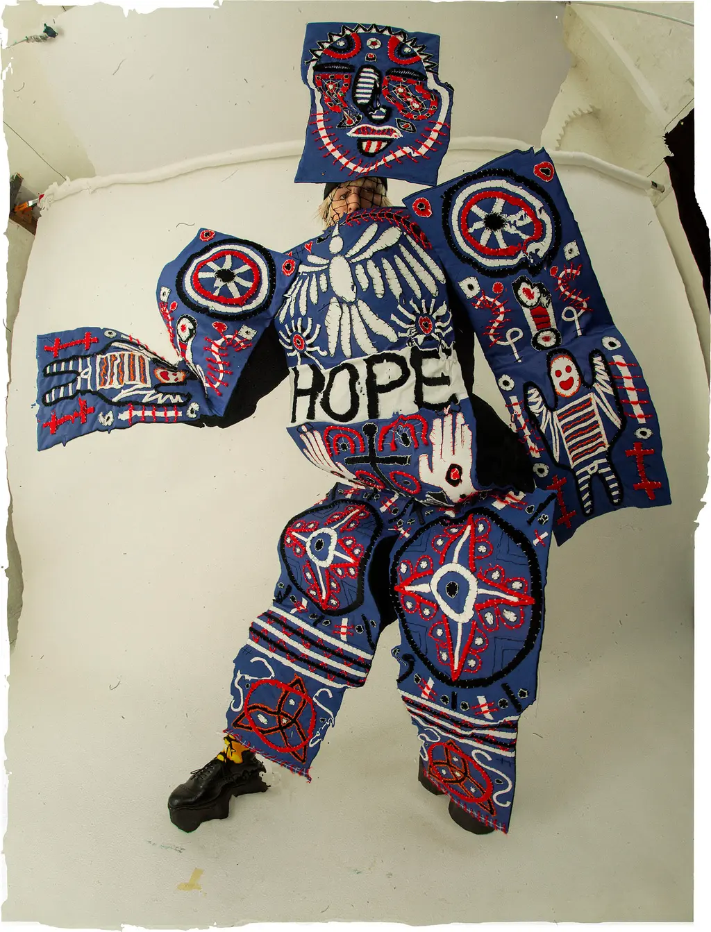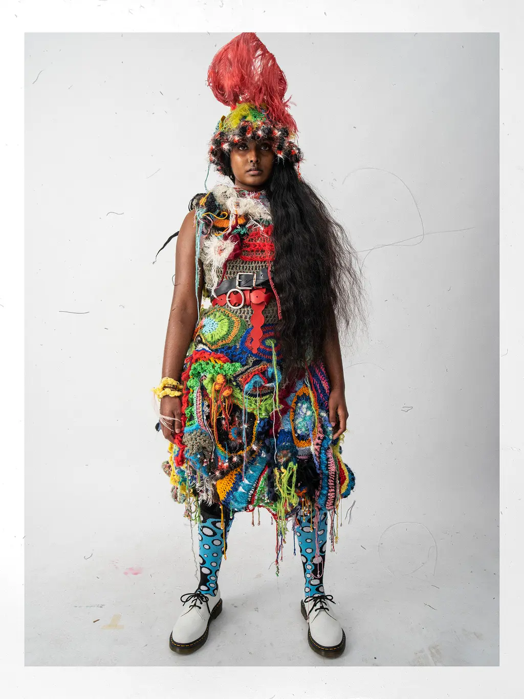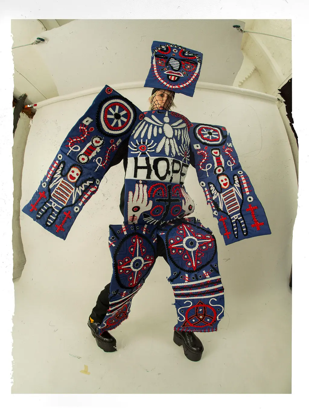 Jeffrey characterises collective suffering through sharp silhouettes, combative lines and spiky detailing like heavy chains and fishnet tights. For him, it was paramount to speak for his community in this collection. “There’s a duty in being a designer, especially when you’re coming from the community that we come from,” he explains. “To some extent, people look up to the work as a “healing” – there’s a responsibility there.”