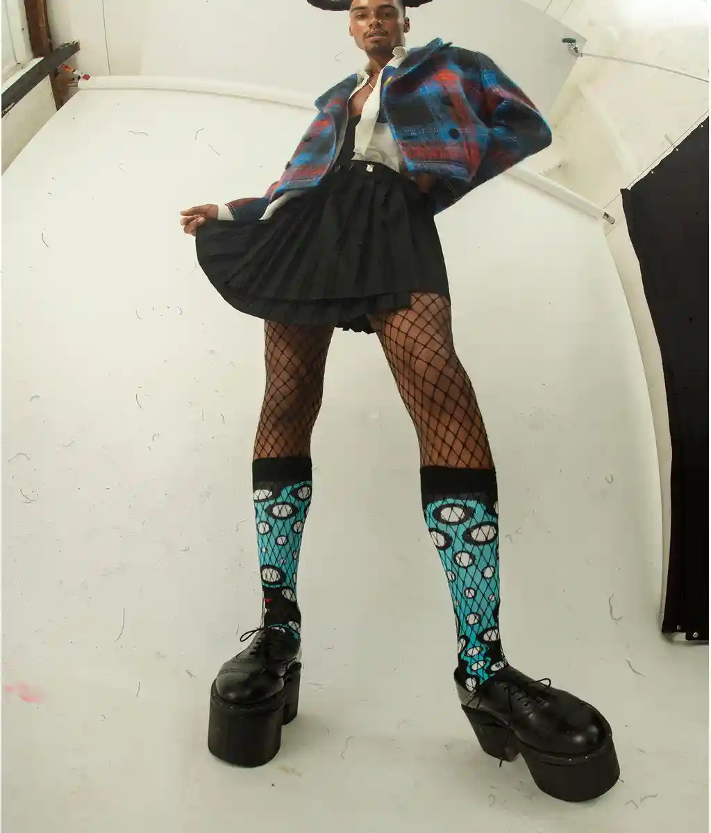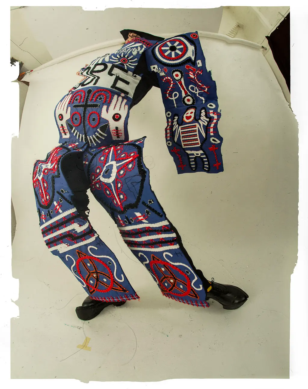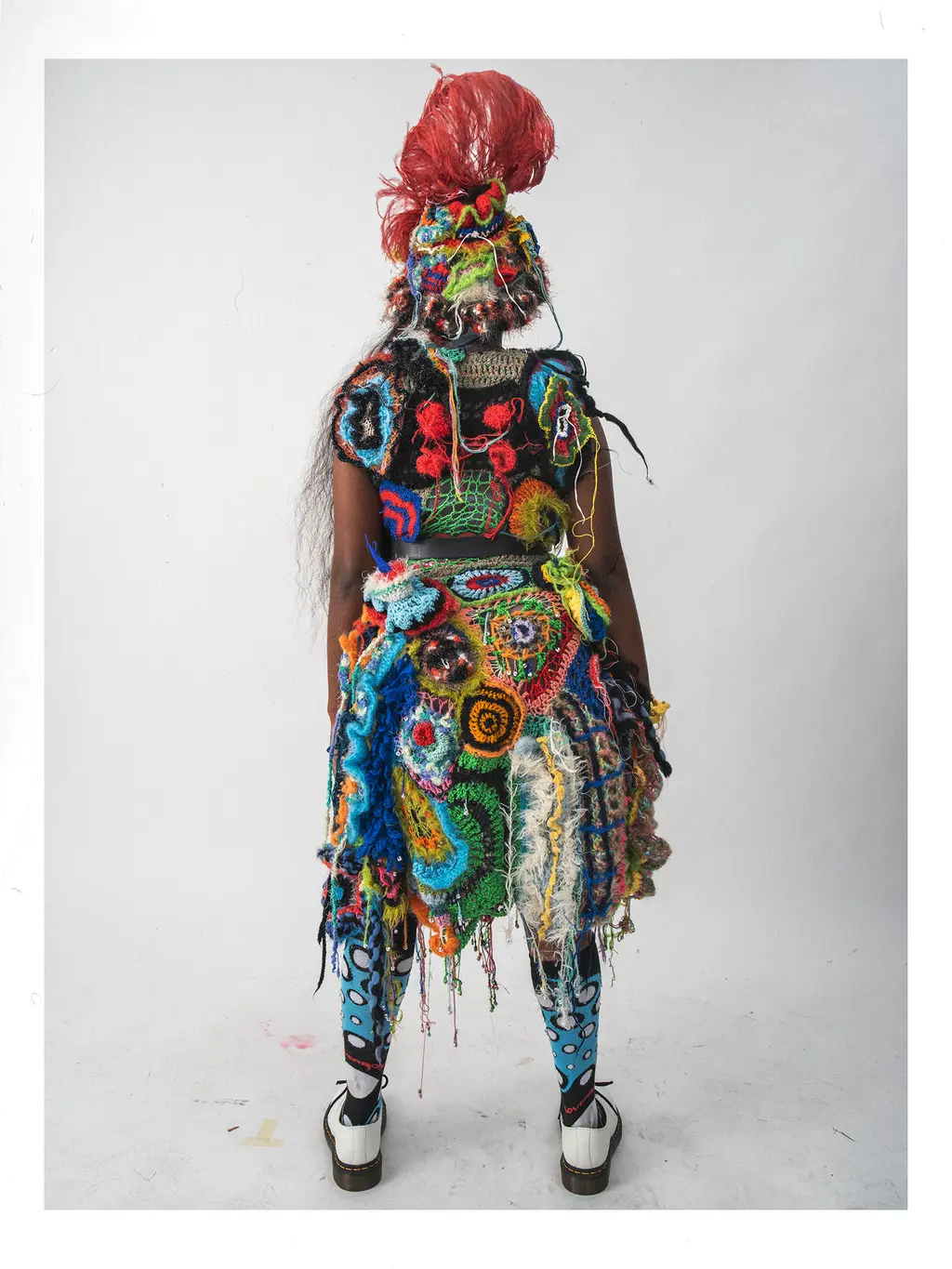 Jeffrey characterises collective suffering through sharp silhouettes, combative lines and spiky detailing like heavy chains and fishnet tights. For him, it was paramount to speak for his community in this collection. “There’s a duty in being a designer, especially when you’re coming from the community that we come from,” he explains. “To some extent, people look up to the work as a “healing” – there’s a responsibility there.”