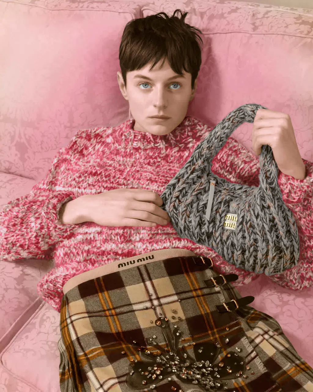 Upcycled leather jackets are imbued with flower motifs, kilts have been given a new lease of life and nan-friendly jumpers have received the Miuccia treatment. Few besides Emma Corrin could make a knitted bag look so swanky, so it was a no-brainer to enlist the Miu Miu ambassador for this campaign (spot them in the latest holiday ad too).