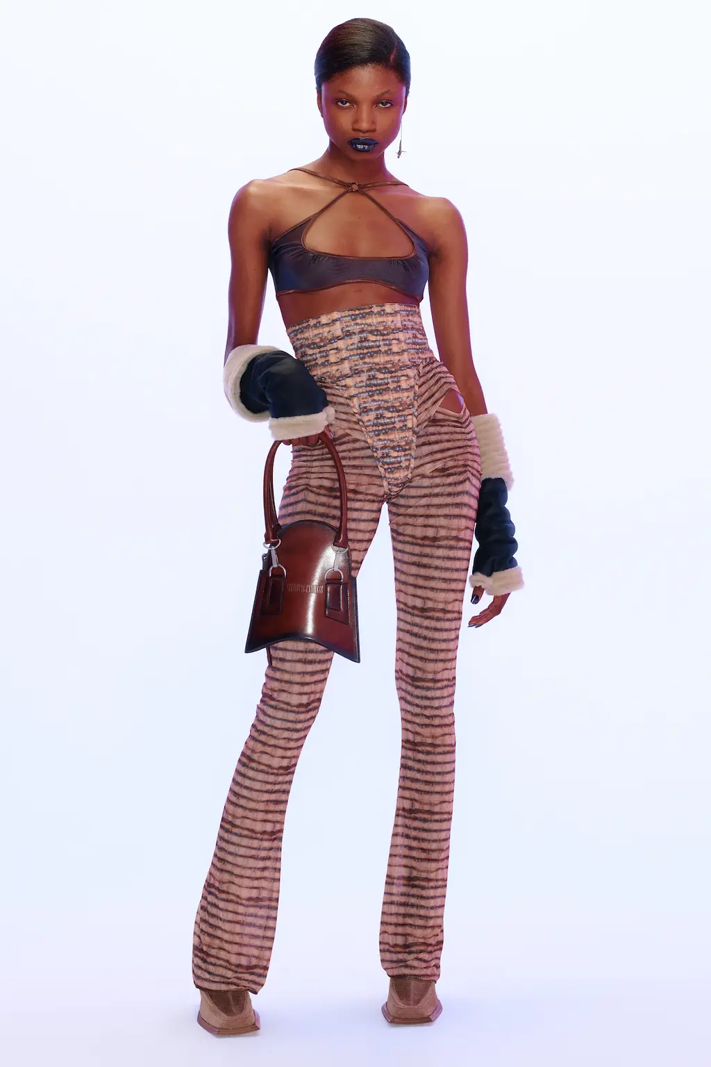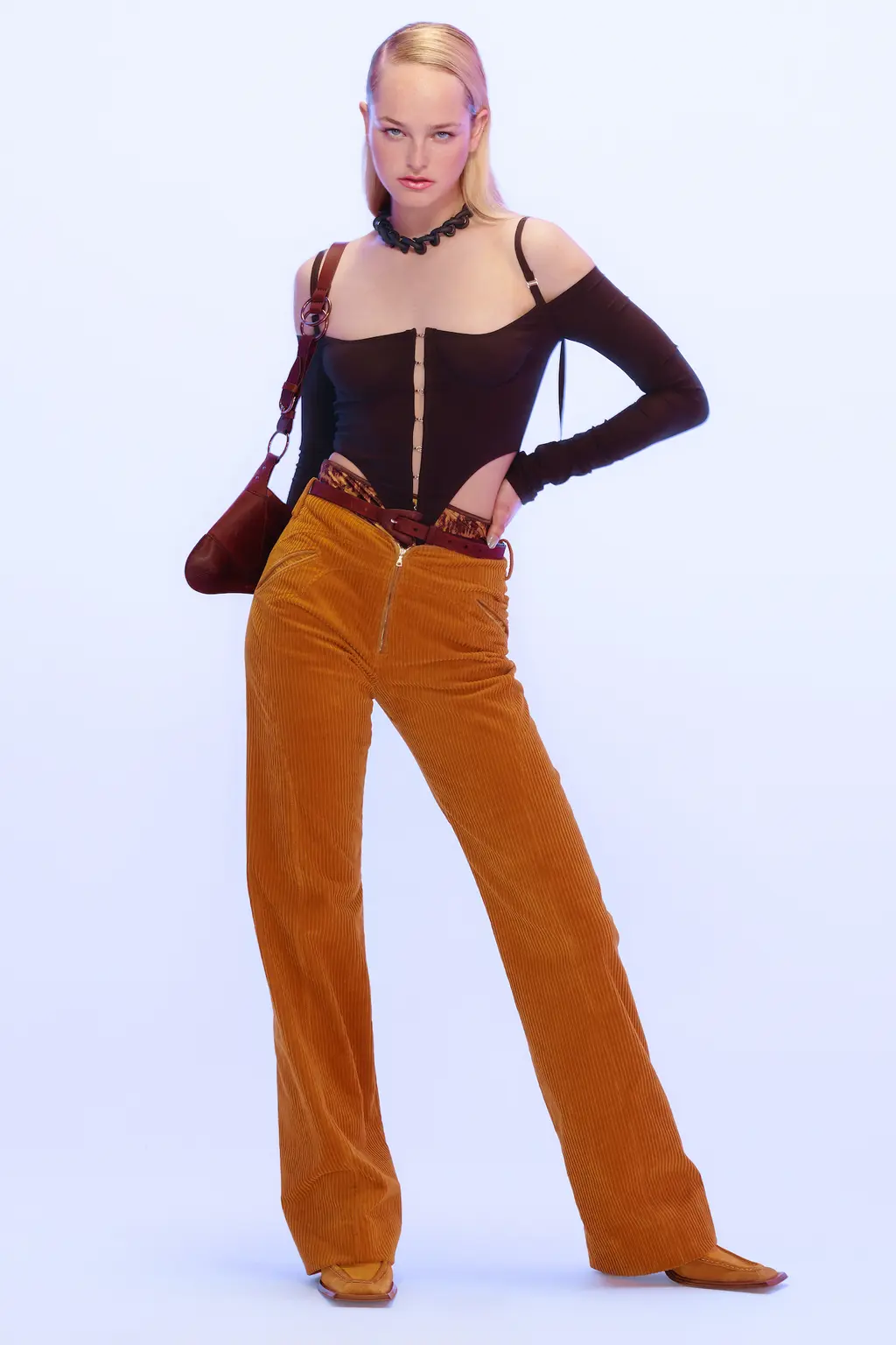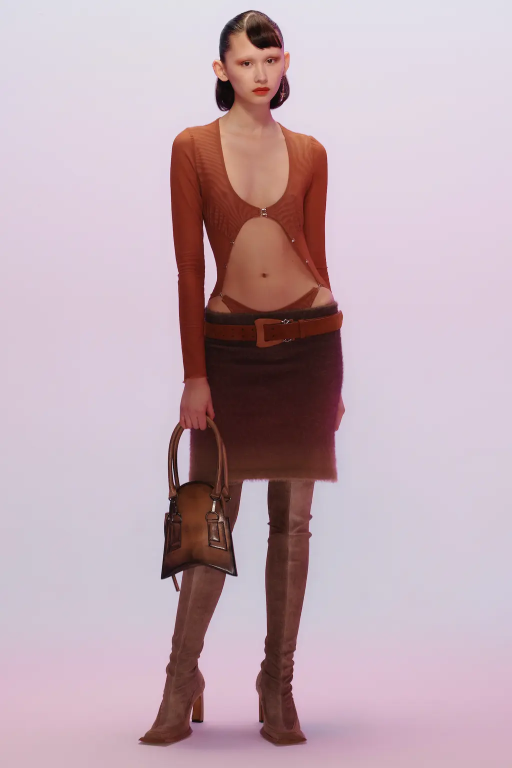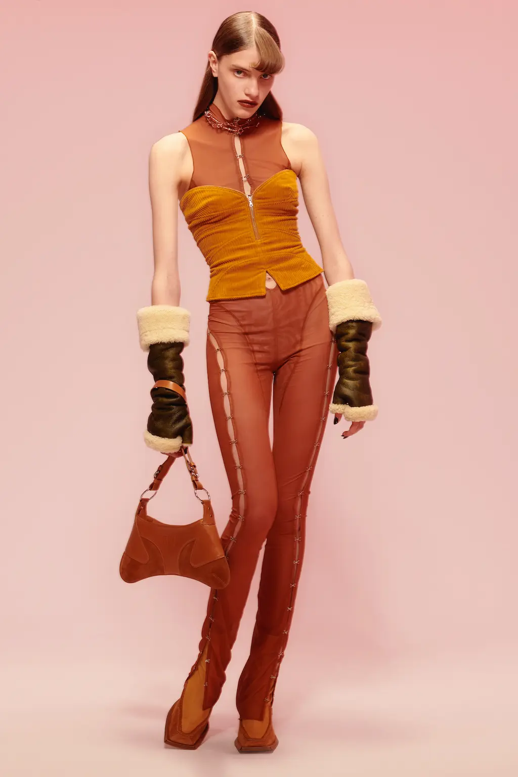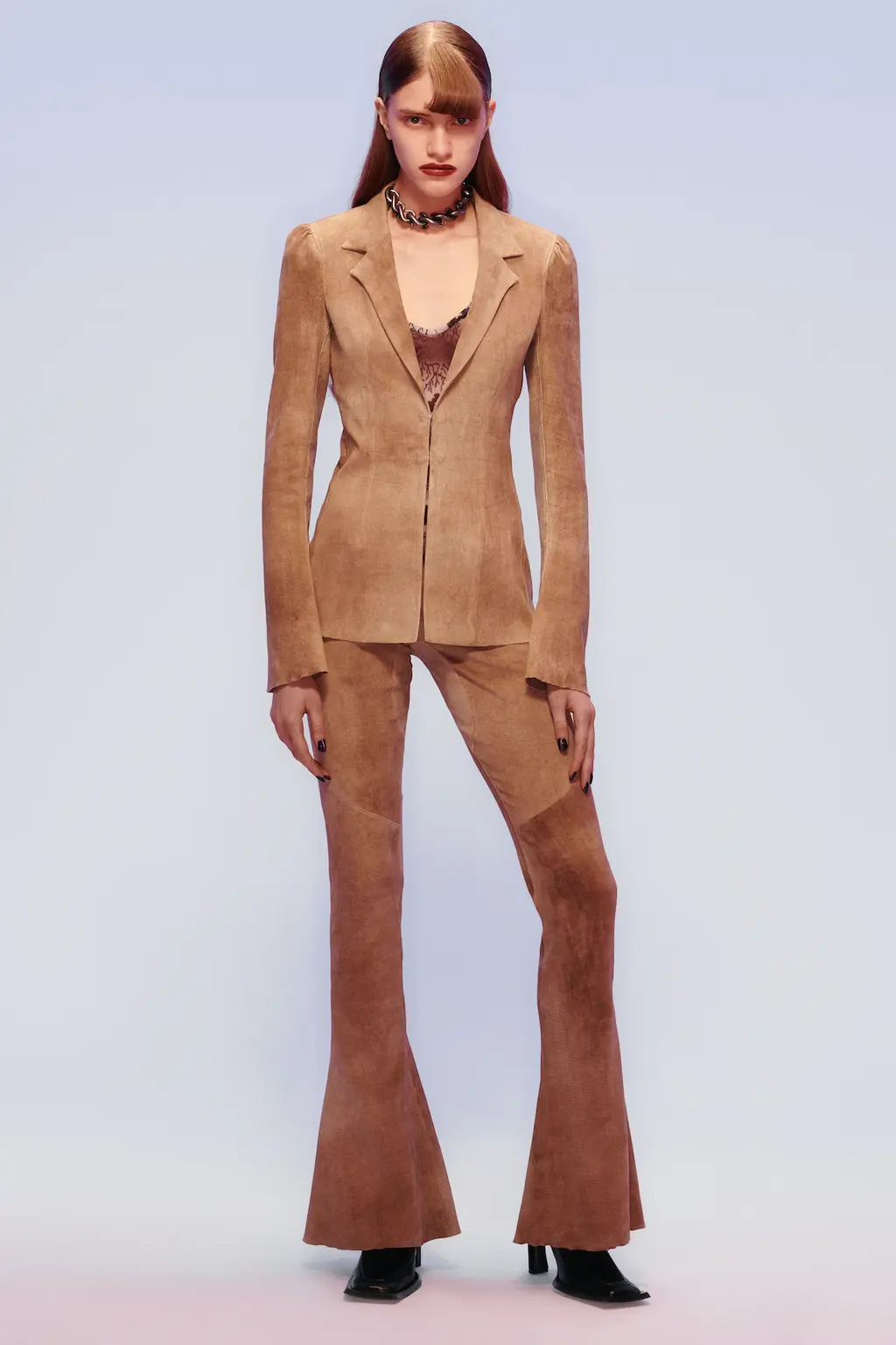 For all the collection’s quiet luxury and sophistication, it was also important for Knowles and Arsenault that the garments feel accessible. Fluffy knits, tan suede suits, and terracotta cord corsetry pointing to the ’00s put a casual, streetwise spin on signature pieces. Ultimately, KNWLS is operating in the same universe, but with a sharper, more daring perspective, broadening its horizons with every passing season.