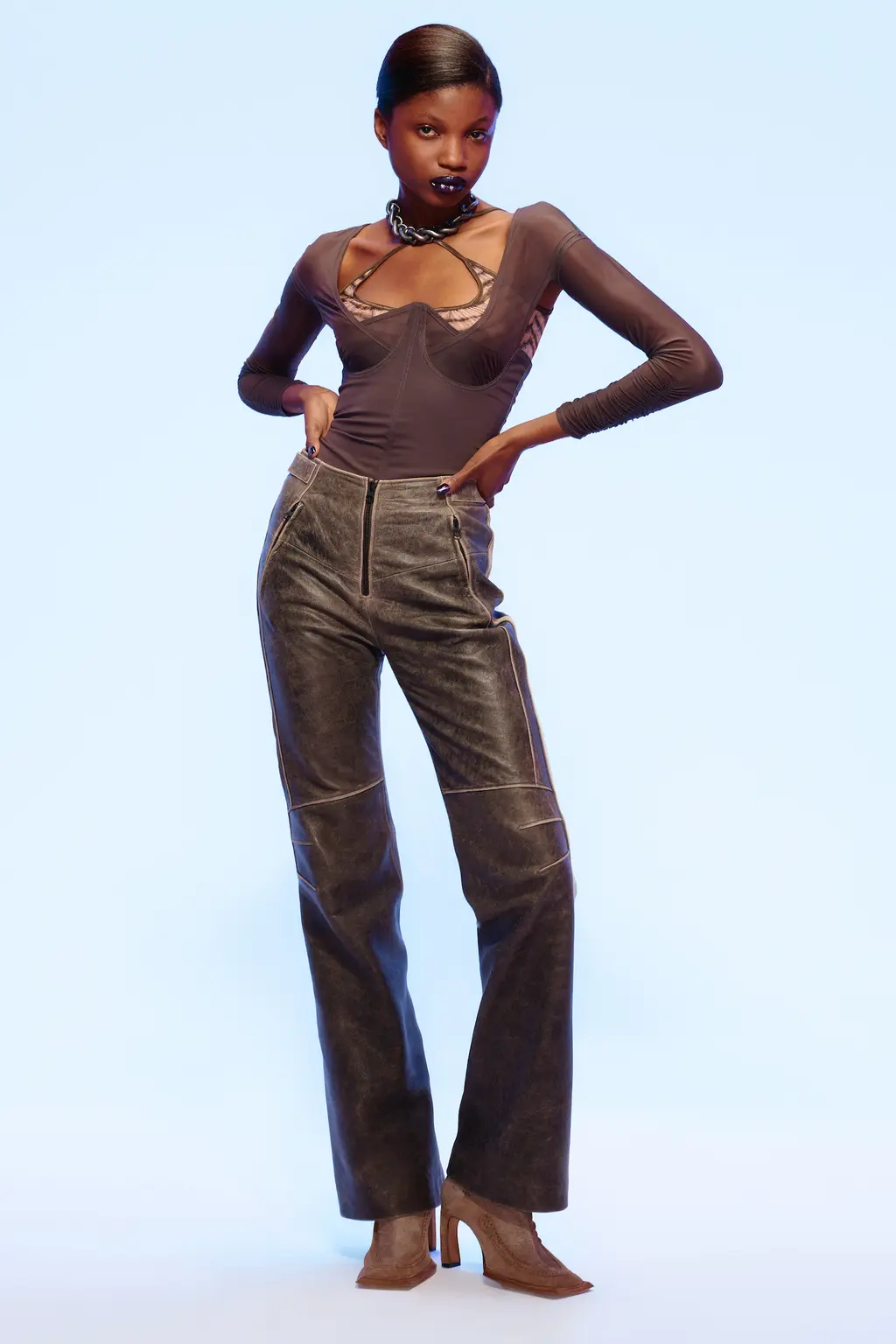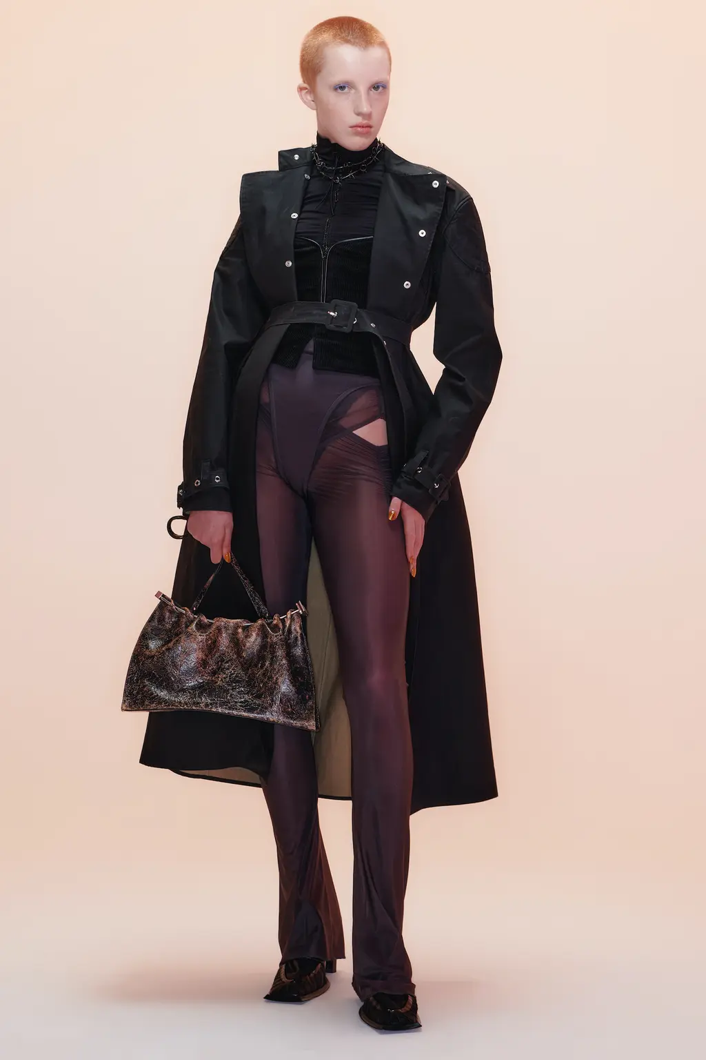 These elements are compounded by Knowles and Arsenault’s use of black – a first since the former’s graduate show. Shearling fingerless gloves, coats and vests with corset points at the bottom give way to sleek, acid-wash trench coats with cinched in waists worn over sheer, skin-tight flares. And leather biker jackets with sharp shoulder pads are amped up to look decidedly Knowles-esque – fitted and sexy, from “biker” to “bourgeois”.