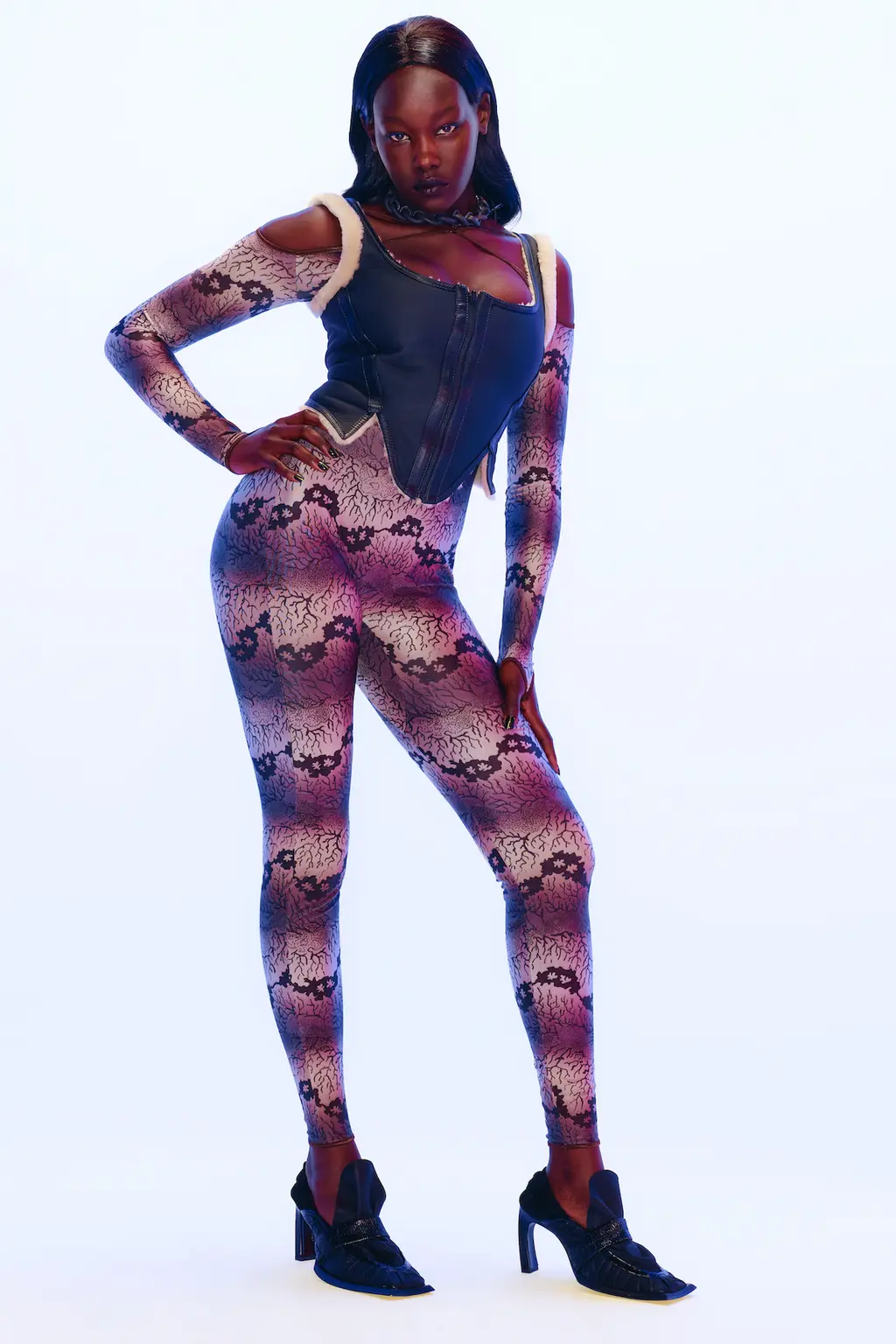 Each garment seamlessly morphs into the next, which speaks to the feline energy that Knowles and Arsenault wanted to instill throughout the collection. It felt crucial to convey this without being too literal about it, though: “It’s very aloof and sexy” Arsenault says, “like a cat slinking into the night.”
