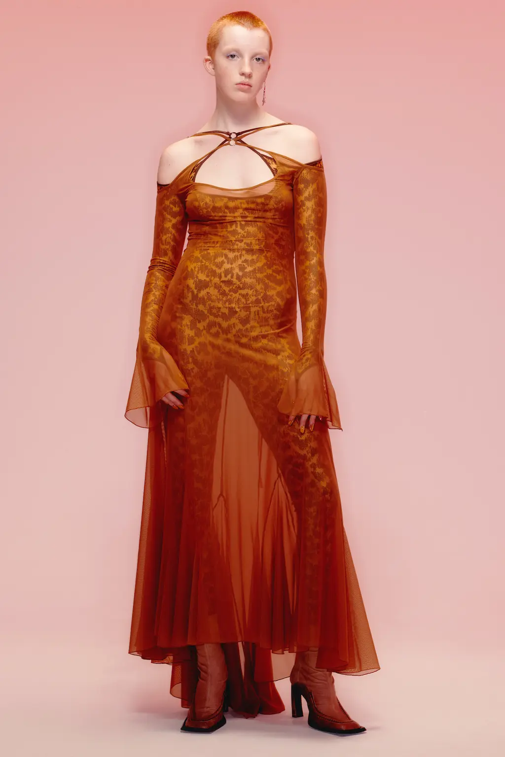Orange-hued, flowing floor-length dresses with billowing sleeves are relaxed, yet intricately detailed with straps woven around the collarbone in a combination of halter-neck and keyhole necklines. Luxurious sunset-coloured mesh is draped over a figure-hugging bodysuit to create a lean, elongated silhouette, evoking a woman that feels “elegant, a bit untouchable, but also tough and dangerous,” as Knowles puts it.