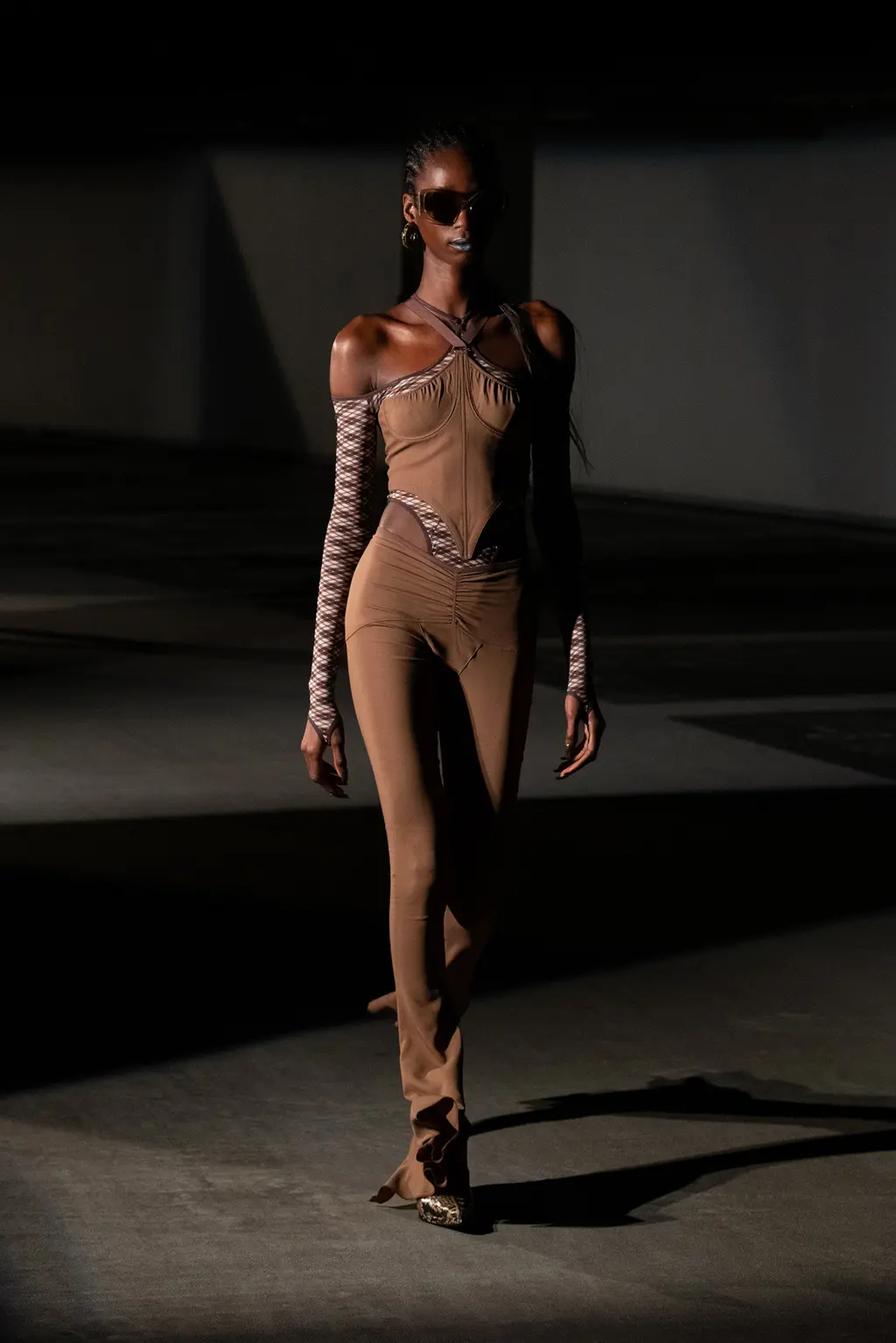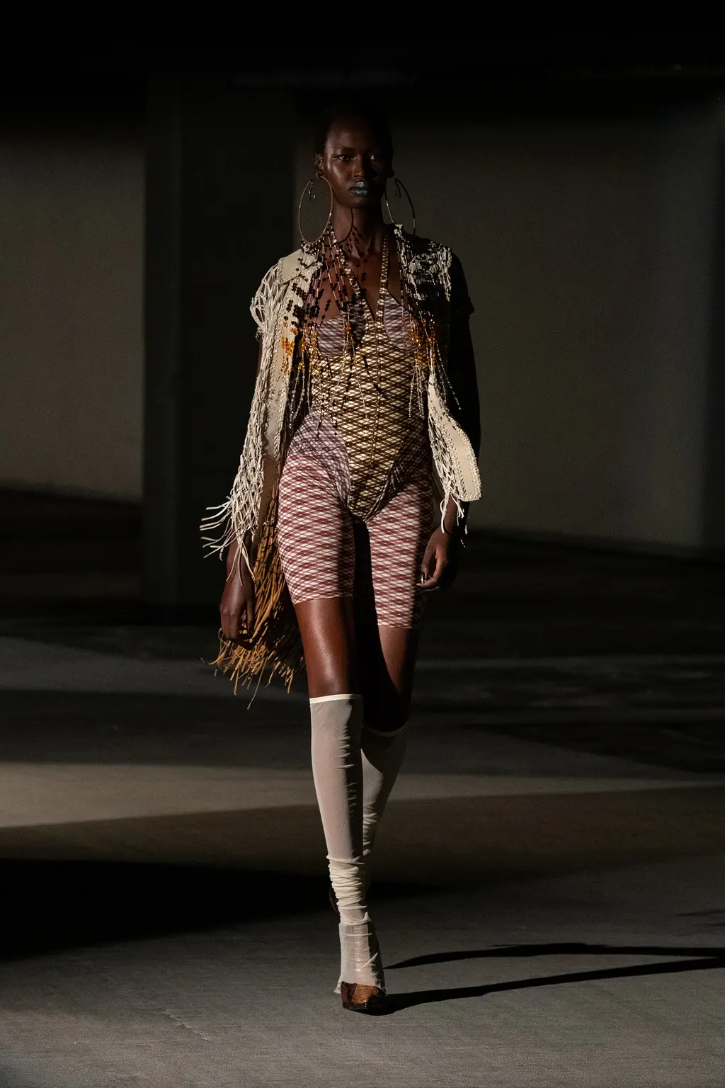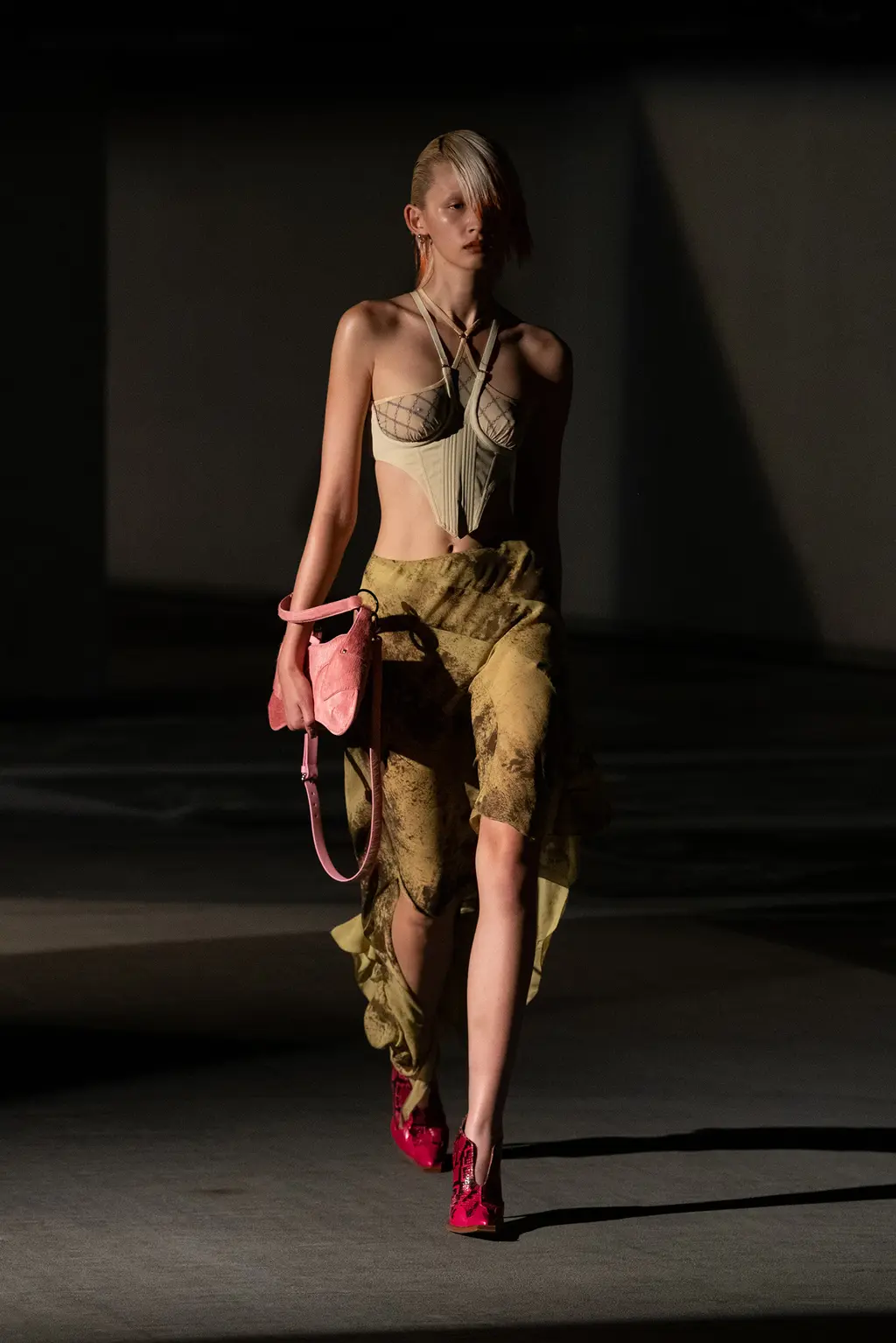 Since launching their label in 2017, Charlotte Knowles and partner Alexandre Arsenault have been exploring their unique, raw and rugged brand of sexy by creating clothes and shaping trends that women instinctively want to wear – and SS22 was no exception. Illuminated sporadically by triangles of bright white light, KNWLS’ models stomped through the subterranean show space soundtracked by ground-shattering industrial techno, dressed as though ready to reign the city’s underworld with intrepid gusto.