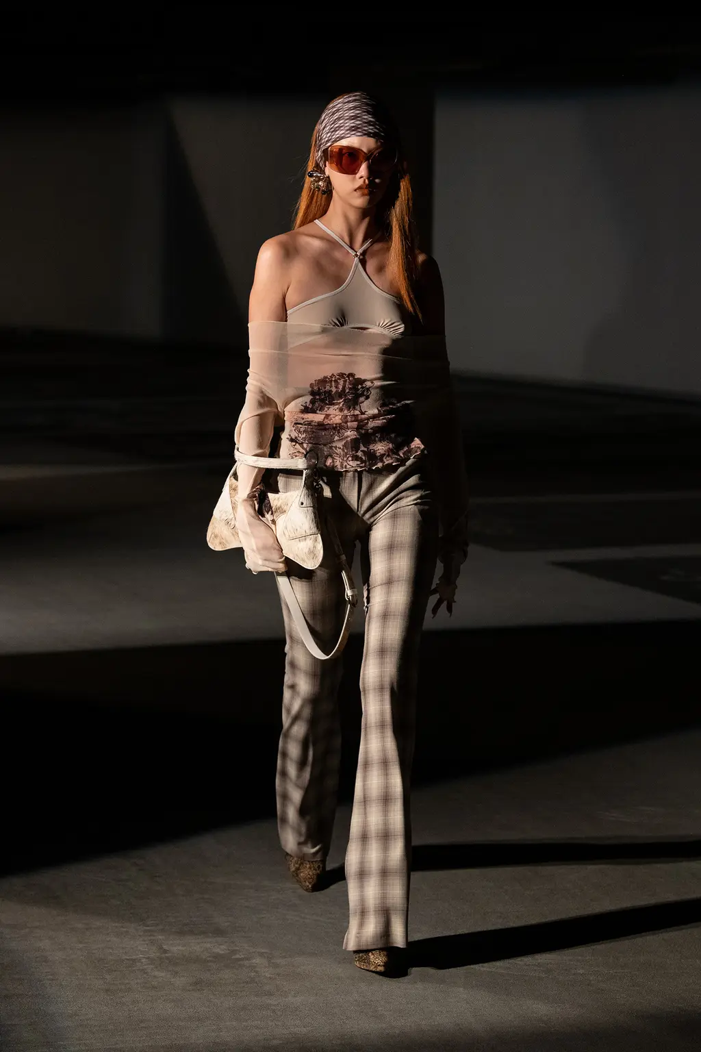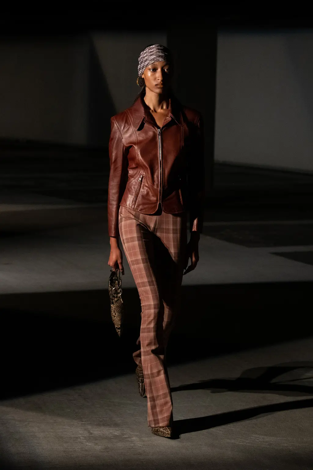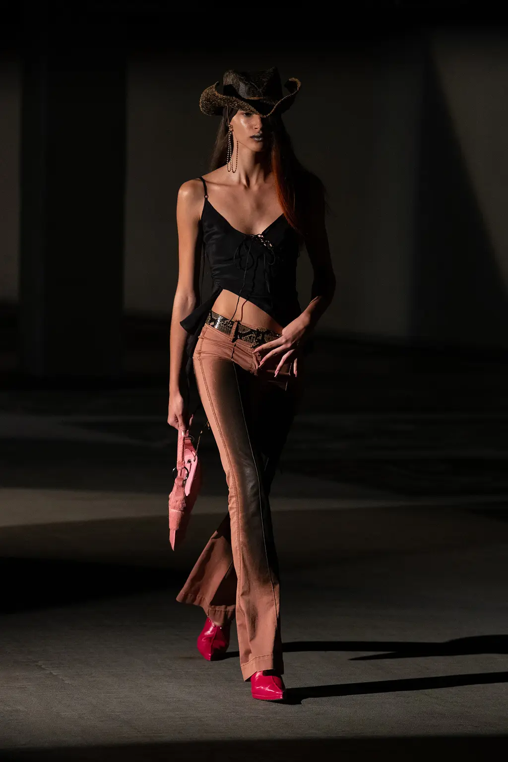 Hot pink accents – striking python boots, compact shoulder bags and sculptural cut-out heels – injected fresh energy into the label’s typically earthy color palette, while additional accessories came in the shape of dipped-down cowgirl hats, bug-eyed sunglasses, and head scarves tied around straightened hair with flame-orange ends.