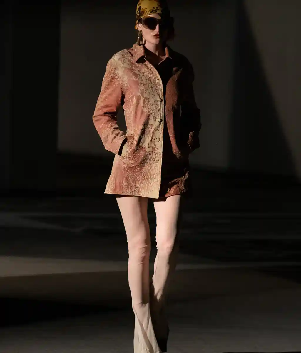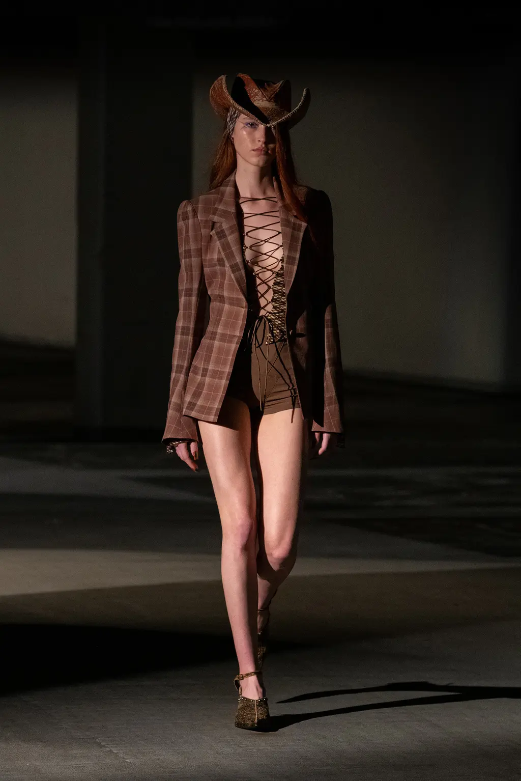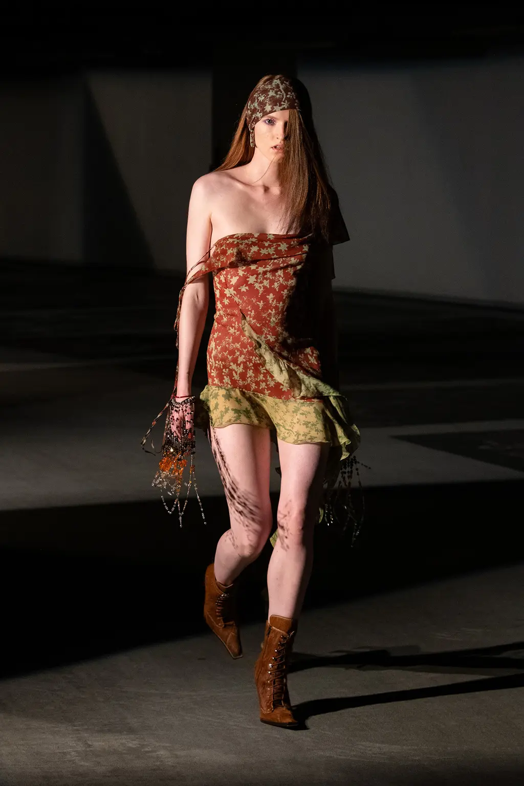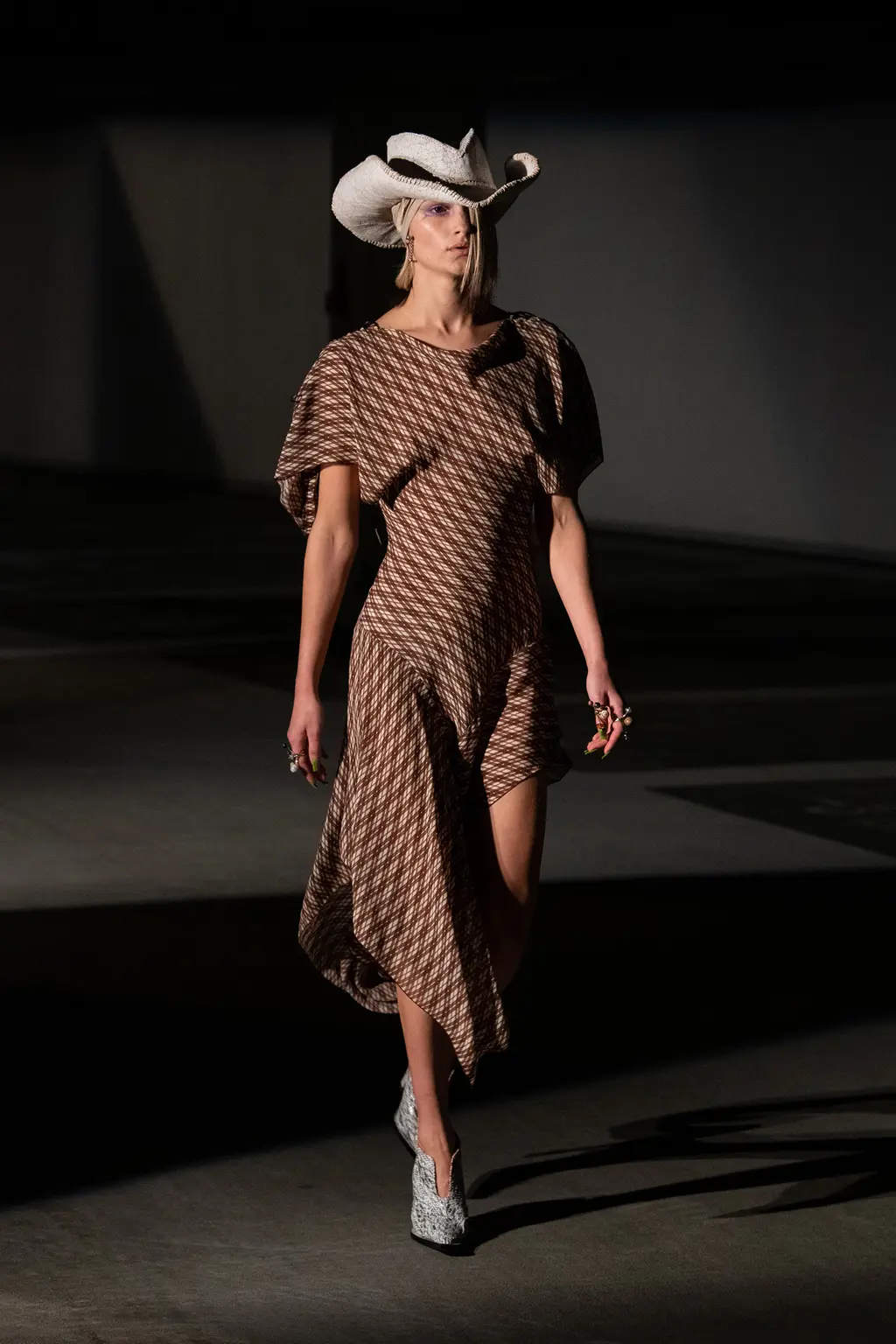 Hot pink accents – striking python boots, compact shoulder bags and sculptural cut-out heels – injected fresh energy into the label’s typically earthy color palette, while additional accessories came in the shape of dipped-down cowgirl hats, bug-eyed sunglasses, and head scarves tied around straightened hair with flame-orange ends.