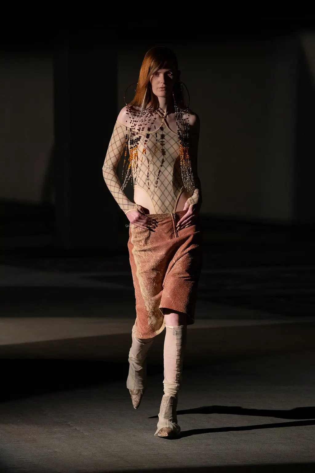 As ever, body-hugging bustier tops, underwear as outerwear, lace-up one pieces and low-rise, printed mesh pants were on the agenda, alongside new, stand out additions: a leather bomber jacket with ribbed detail that accentuated the waist; front-laced tops in bleached florals; jeans with spray-painted bums; leather trousers that could well have been dragged across hot tarmac; swishy skirts with lace-up hips; hand-crocheted, fringed suede trousers; and a series of smoking hot minidresses meticulously crafted from panels of leather.