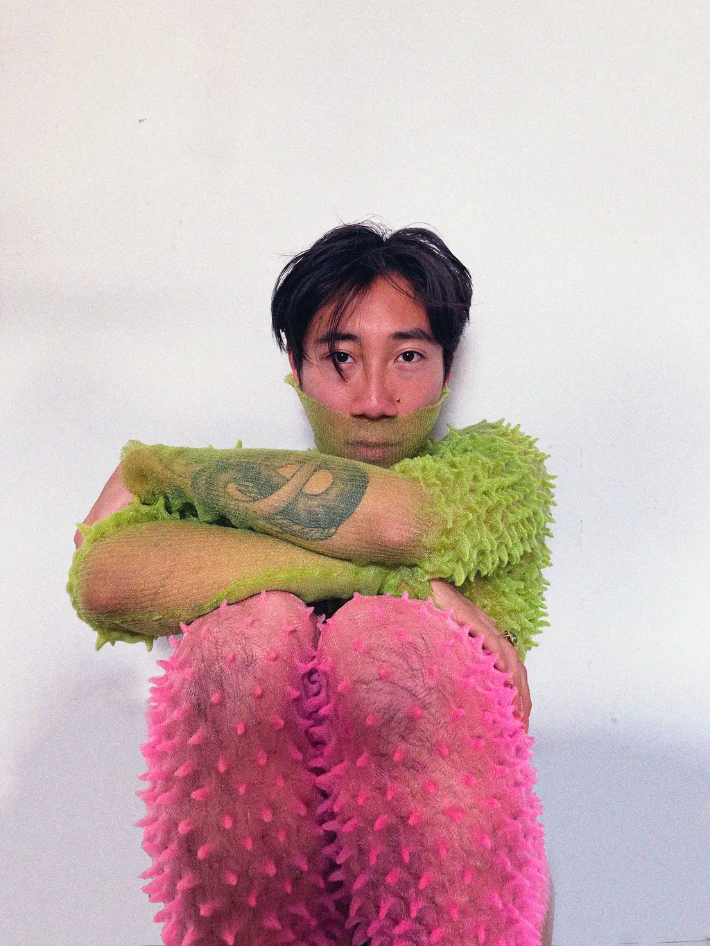 Lo studied knitwear at Central Saint Martins. Since graduating last year, he’s been hard at work forging a signature style of figure hugging, spiky knitted corsets, dresses, legwarmers, high-neck sleeveless tops and boleros inspired by the curious durian fruit, and made from monofilament yarn.