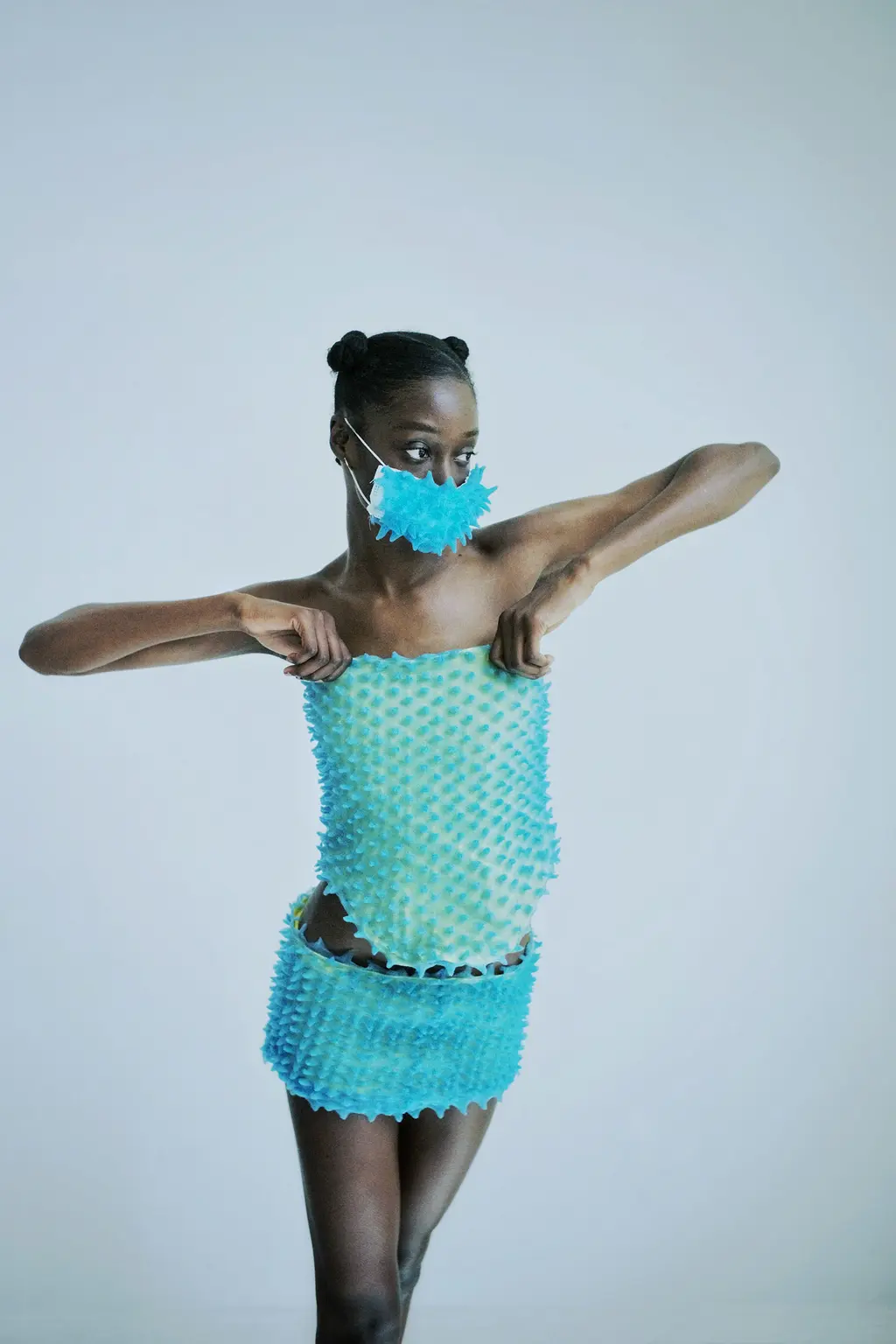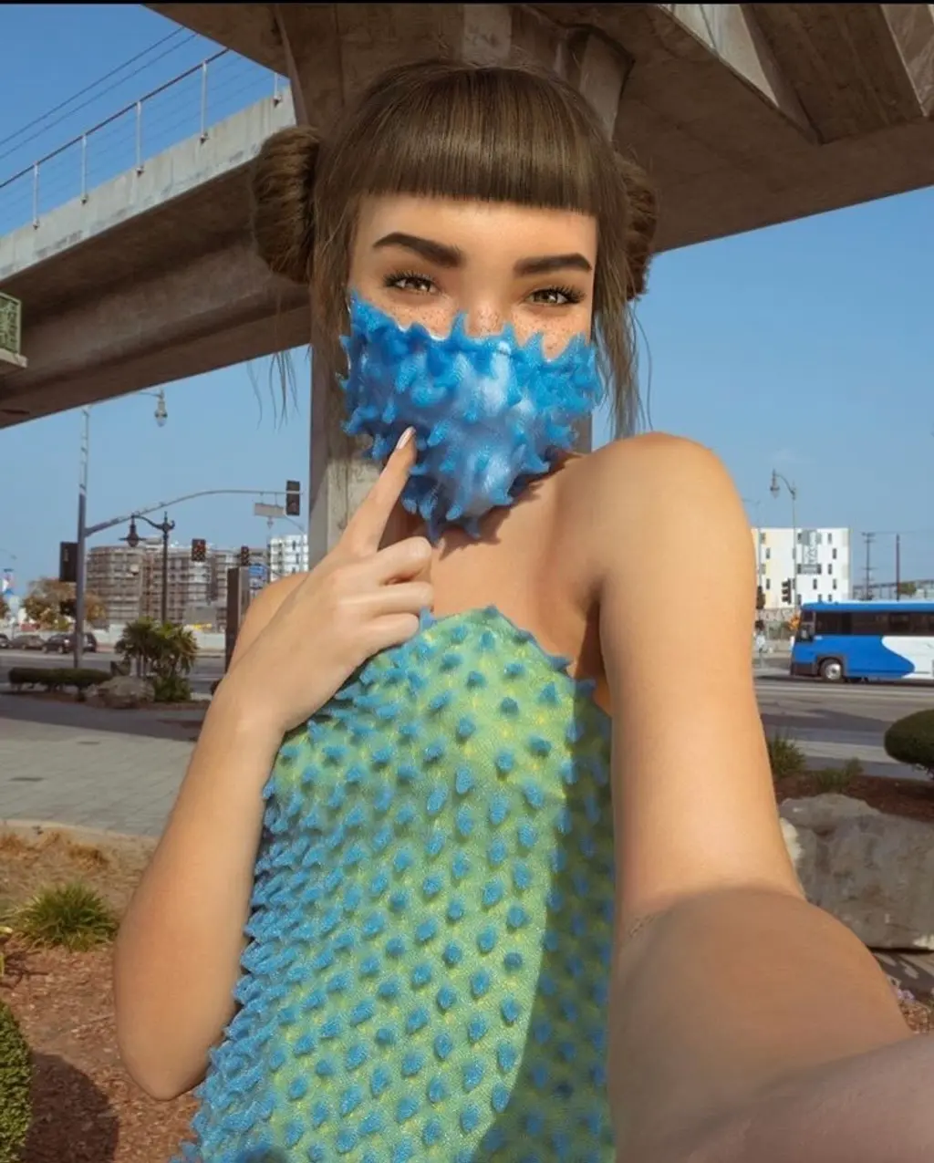 “It’s basically like a really thin fishing wire,” the 23-year-old designer explains. “It’s very difficult to knit with because it’s so unpredictable, but I somehow managed to force it to go up in spikes and take on a 3D effect.” Pushing himself to tackle the more technical side of design is all part of the fun for Lo, though. It defines his design DNA: playful, experimental, and boundary-breaking, so much so that CGI influencer Lil Miquela had to bag herself a piece or two.