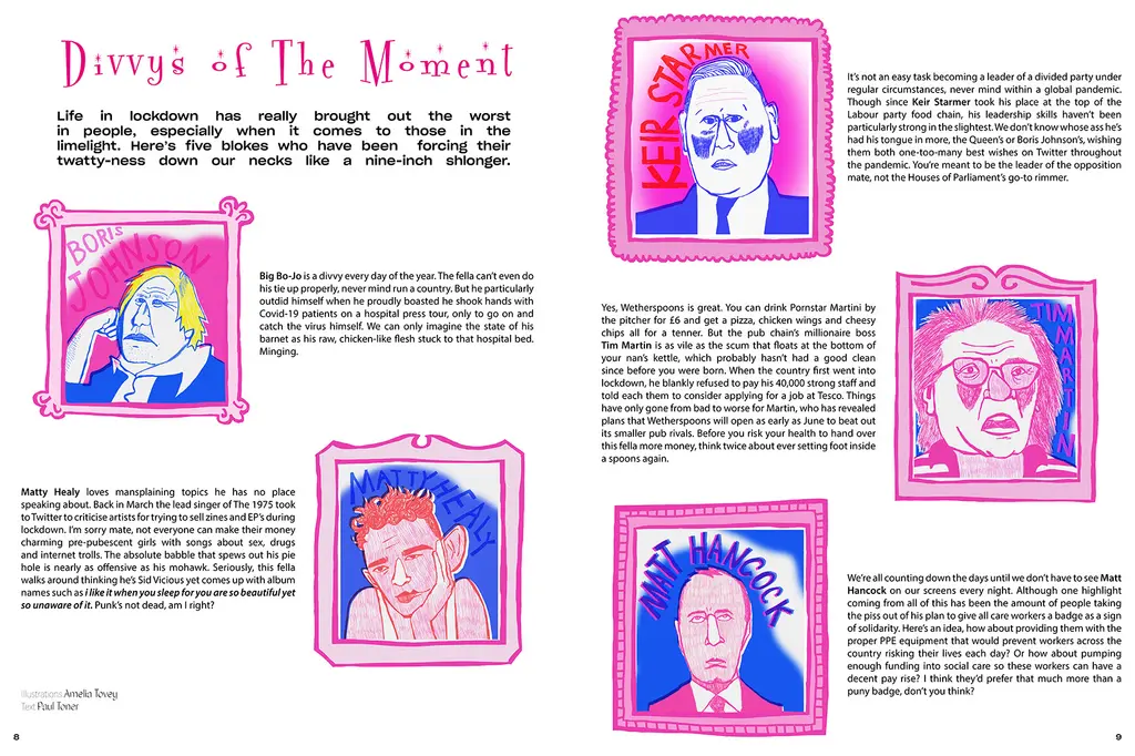 The features on the pages of Clobber include Divvy’s of the Moment: a round-up of the “fives blokes that have forced their twatty-ness down our throats like a nine-inch schlonger” (for example: BoJo, Matt Hancock and Tim Martin) and Trackie Trumps – an observation on the humble tracksuit during lockdown, where Toner rates the best trackies on the market, “Top Trumps style”. There’s also a Glasto-less Scouser “how to get the look”, where Toner dissects a Liverpudlian at the Worthy Farm festival. Apparently you can spot ’em a mile away.