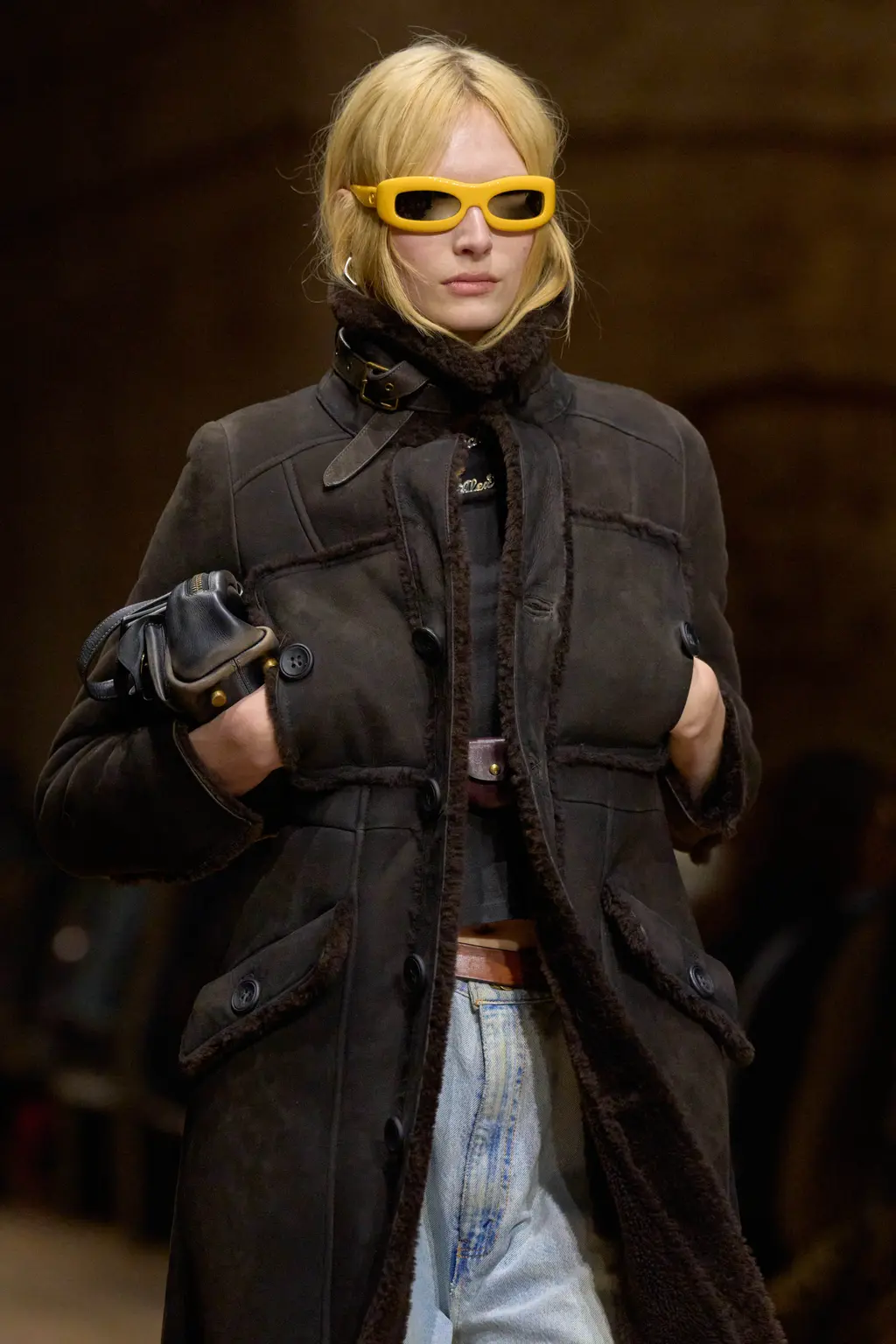 It soon became clear that fun-sized sunnies were a pivotal part of Coach’s ready-to-wear this season: they came in shades of burnt tomato, aubergine, grey and yolk-yellow. Yum. Coats were roomy and long, with button-detail throat latches on buttoned and peg and loop styles in espresso, ochre, navy and black.