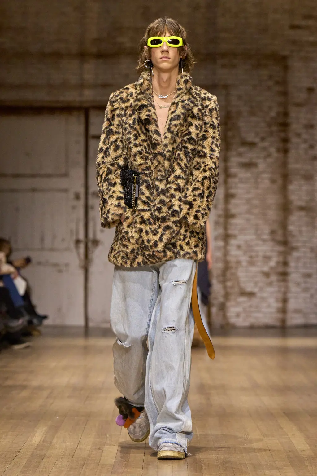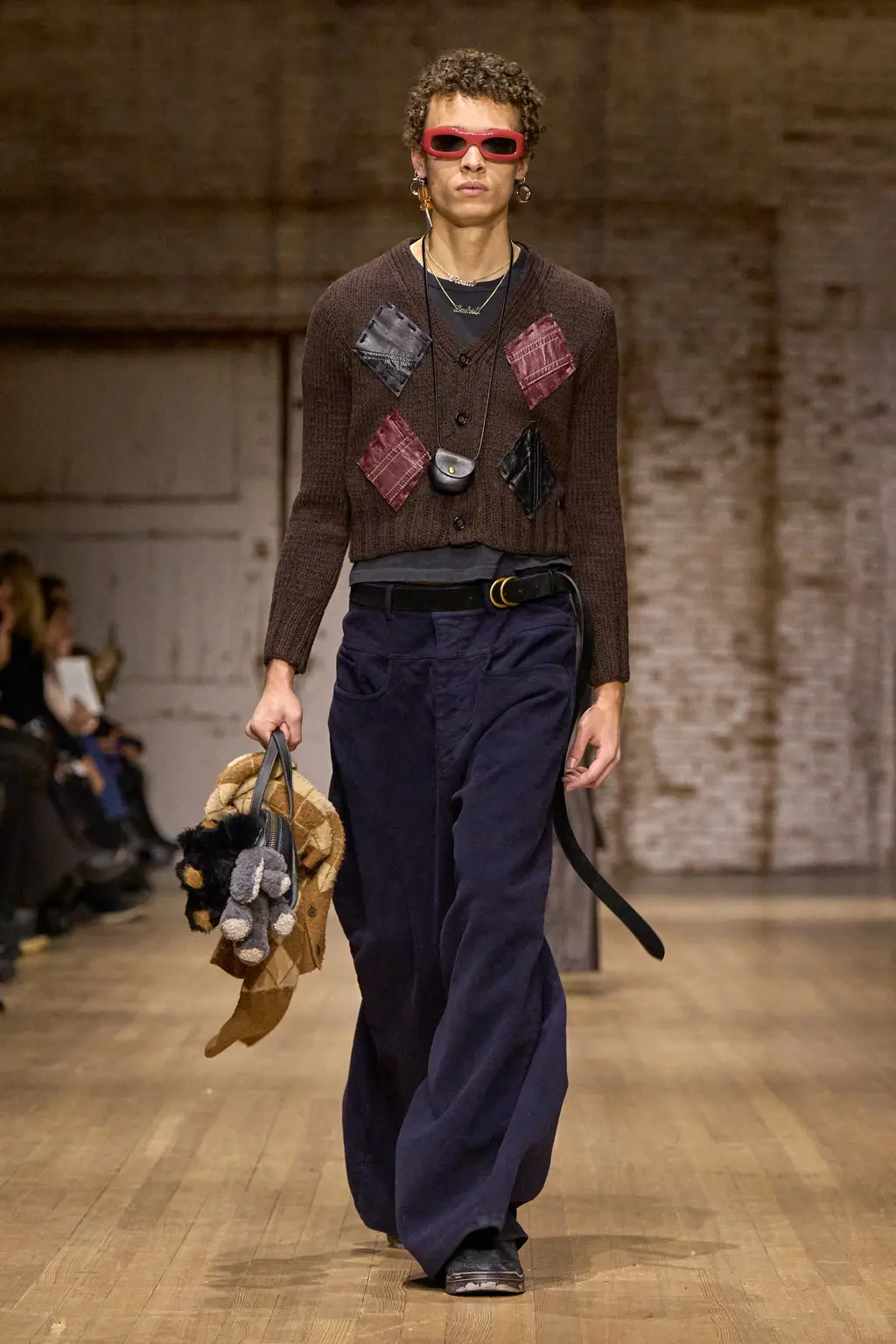 A stand-out look worn by former FACE cover star Alex Consani consisted of a dark, ankle-grazing coat lined with shearling, a pair of hypnotic shades, light-wash jeans and trainers. It was a take on the everyday New Yorker’s casual uniform, with oomph. For the maximalists at the table, tiny purses swung from side to side around models’ necks, cardigans featured patchwork leather squares, and bags were loaded with fuzzy toy animals. Rabbits, elephants, carrots: nothing was off the table. Tool kit earrings, meanwhile, put us in a silly, goofy mood.