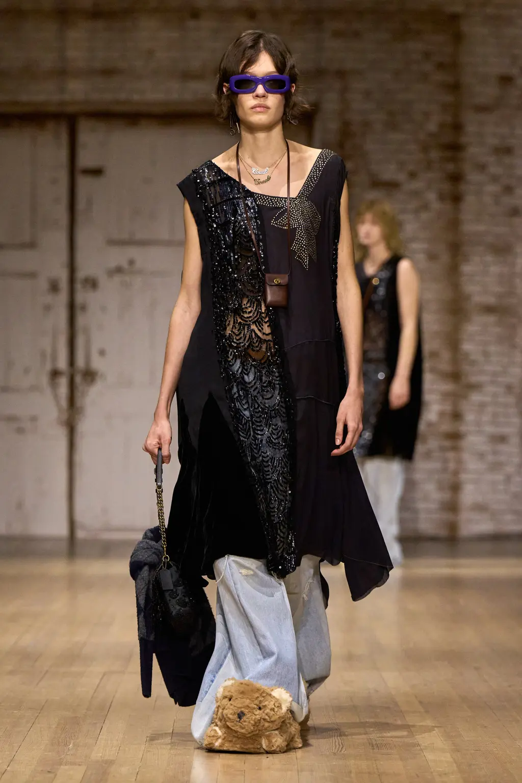 For the second season, Coach’s pre-loved leather Soho sneakers made an appearance. Then things got really crazy: there were bunny slippers – with proper soles, so you can wear them to the offie or the next Coach soirée. Trainers got the big charm treatment, and clusters of stuffed toys enveloped footwear so you couldn’t see where the laces began and ended. As the show came to a close, things got a little glitzier as we got a taste of dance floor-appropriate dresses that were rife with twinkling details. On one side of the dresses were a smattering of beads, and on the other side of them were jewels that made up ribbon illustrations. Meanwhile sequin-covered bags slotted in perfectly.