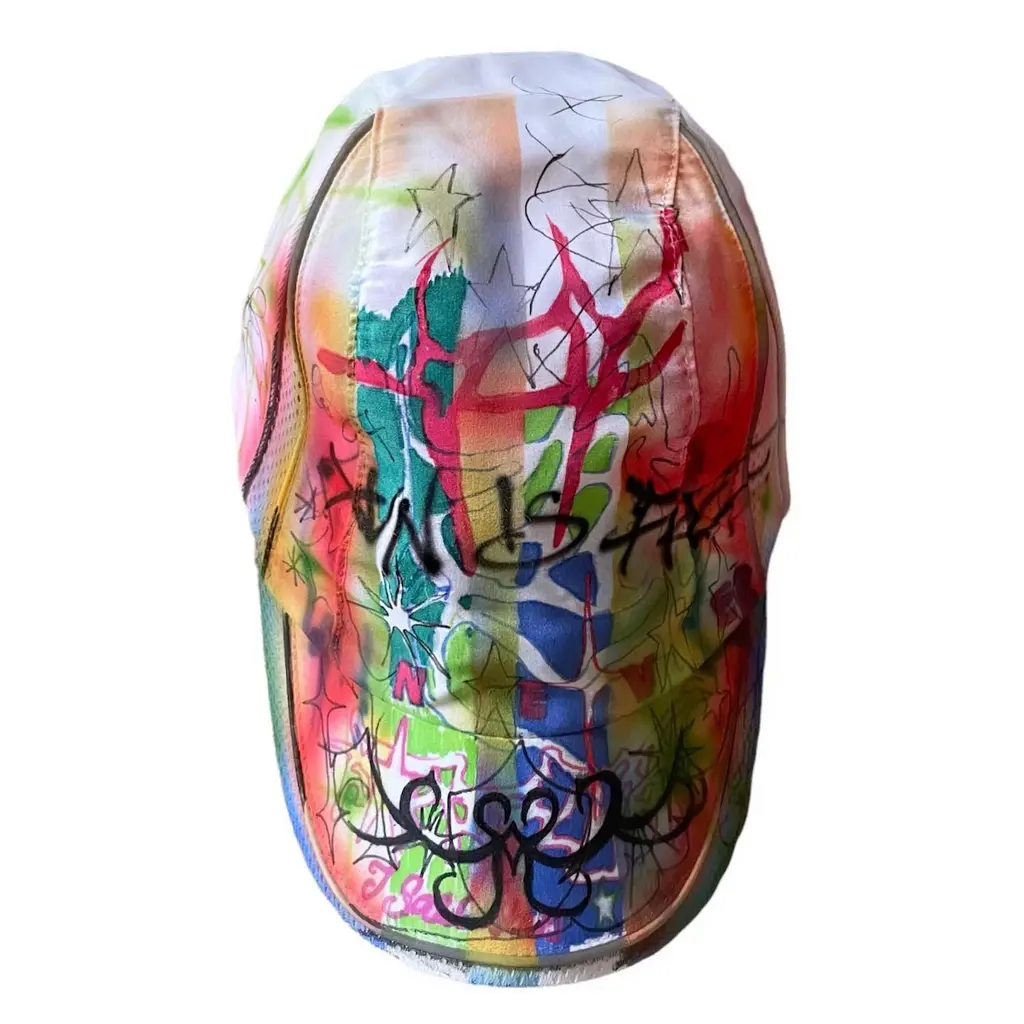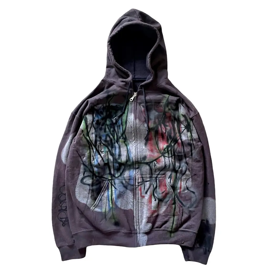 Francesca scours eBay and vintage shops for the original garments, before running riot with her fully-loaded airbrush. Most of the prints, while instinctual and rarely planned-out, are influenced by her love of graffiti found in old photos of ’80s-era New York City. “I’ve always been really fascinated by that whole underground scene,” she says. “Airbrushing clothes felt like a natural progression for me – you can mimic that style, but on clothes and on a much smaller scale.”