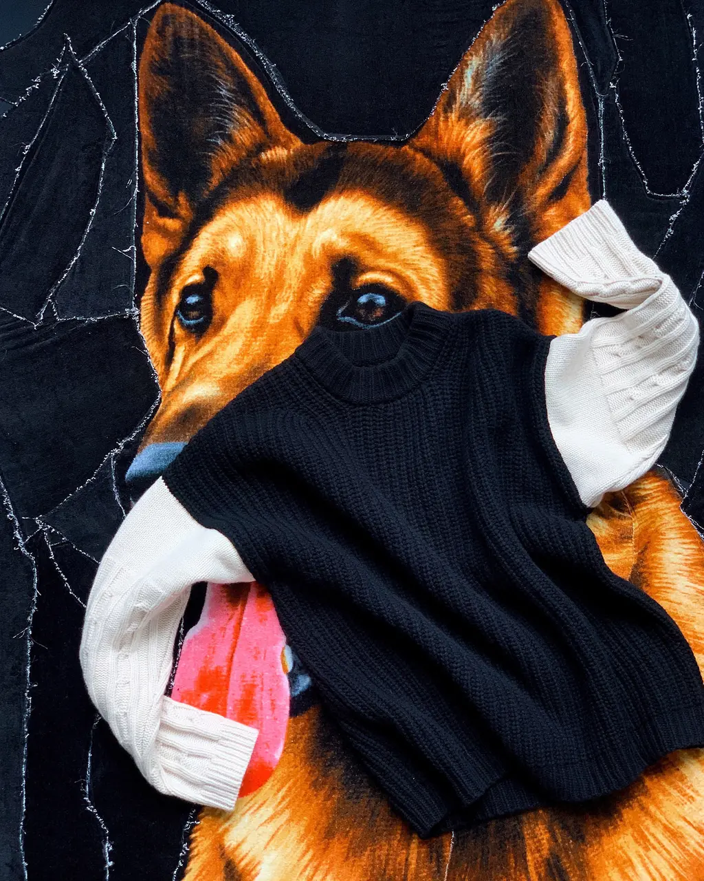 Rather than make face masks like many other ateliers and factories, Knitster’s co-founders Emma McClelland and Aysen Bayram established Commuknitty and decided to put their knitwear skills to good use, working with designers Ahluwalia, Daniel Fletcher, Stefan Cook, Carlota Barrera, Paolina Russo, Kepler and Berthold in making one-off pieces for auction. “As soon as Covid-19 happened, we knew we wanted to find a meaningful way to help,” says the fun-loving, pun-loving Emma McClelland.