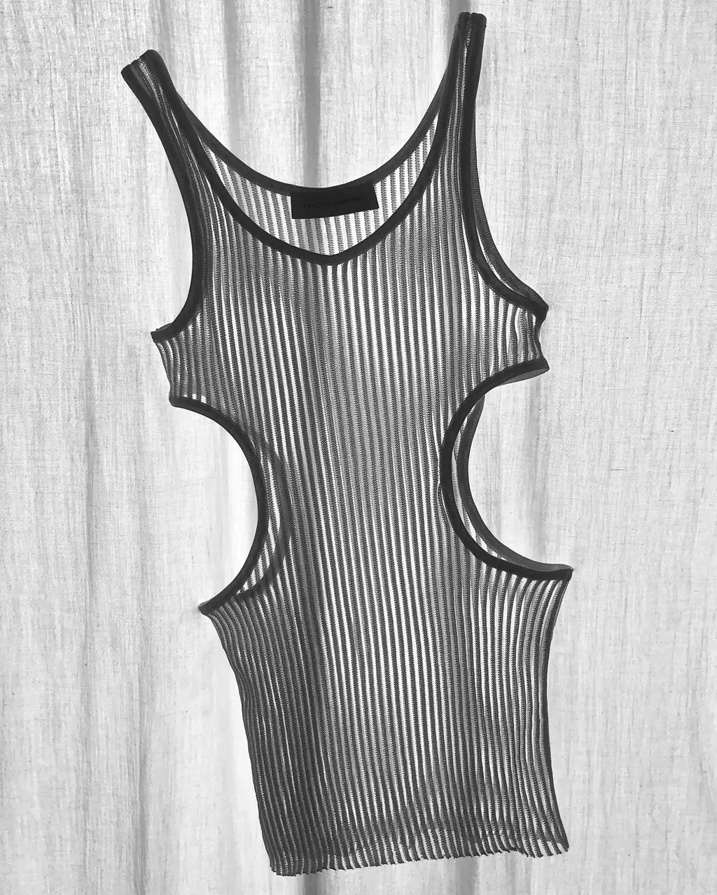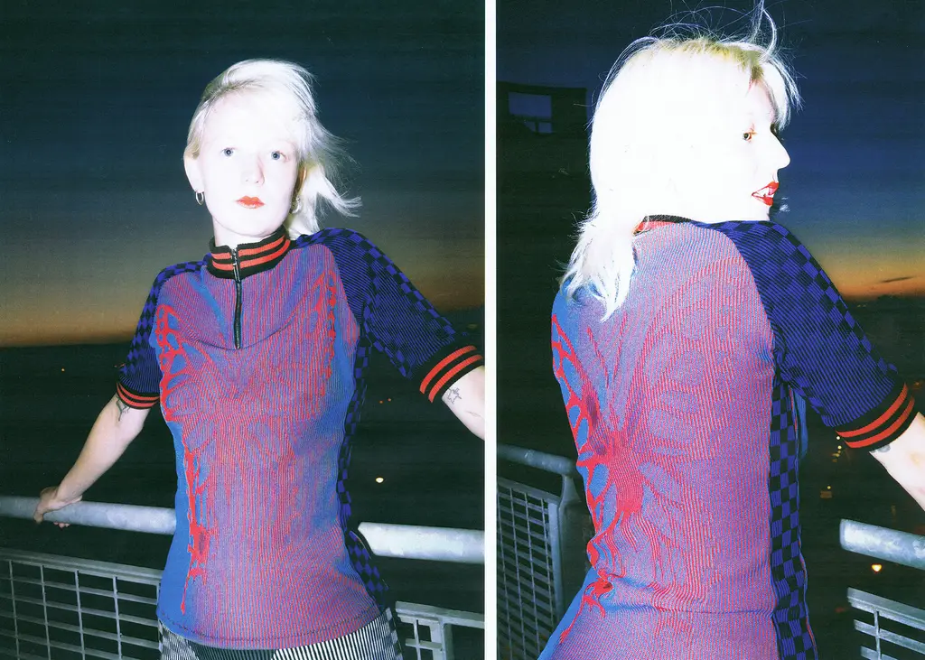 A monochrome stars and stripes sweater by Fiorucci’s artistic director of menswear Daniel Fletcher, a low-neck, waist-bearing vest courtesy of luxury designer Carlota Barrera and a rave-ready pullover complete with racing track checks thanks to rising CMS graduate Paolina Russo. Mega.