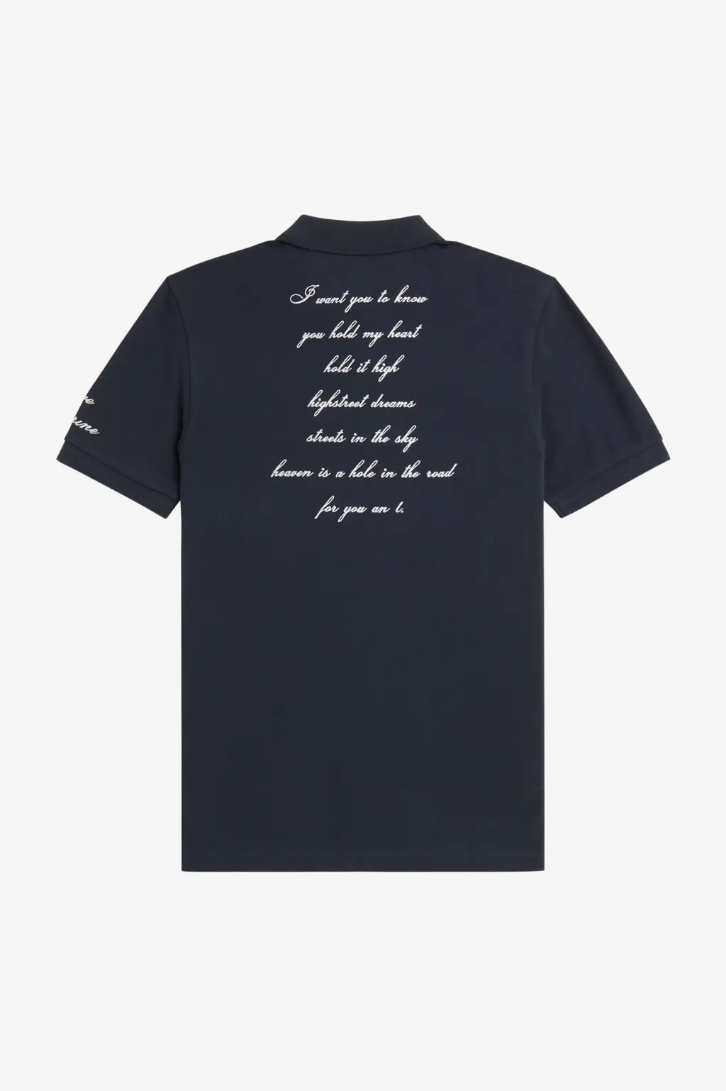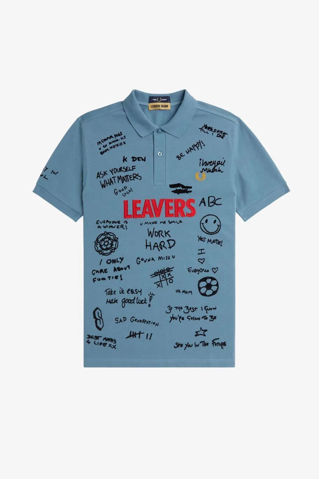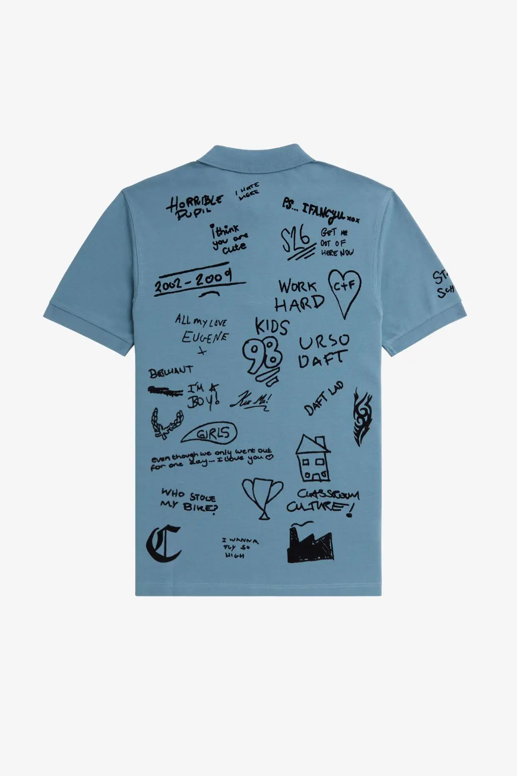 Oh, God! I don’t think I still have my shirt. I don’t remember what people wrote on it, [but it was] probably similar to what we used to write online. Leavers’ shirts are such a shared experience across the country that everyone knows. I asked my friends to send me some messages for the Fred Perry one, so I used some of those. The original draft had more things on it – like a lot of cocks drawn on it – which we couldn’t get on the final one, but it ended up being the way it is, and I love it.