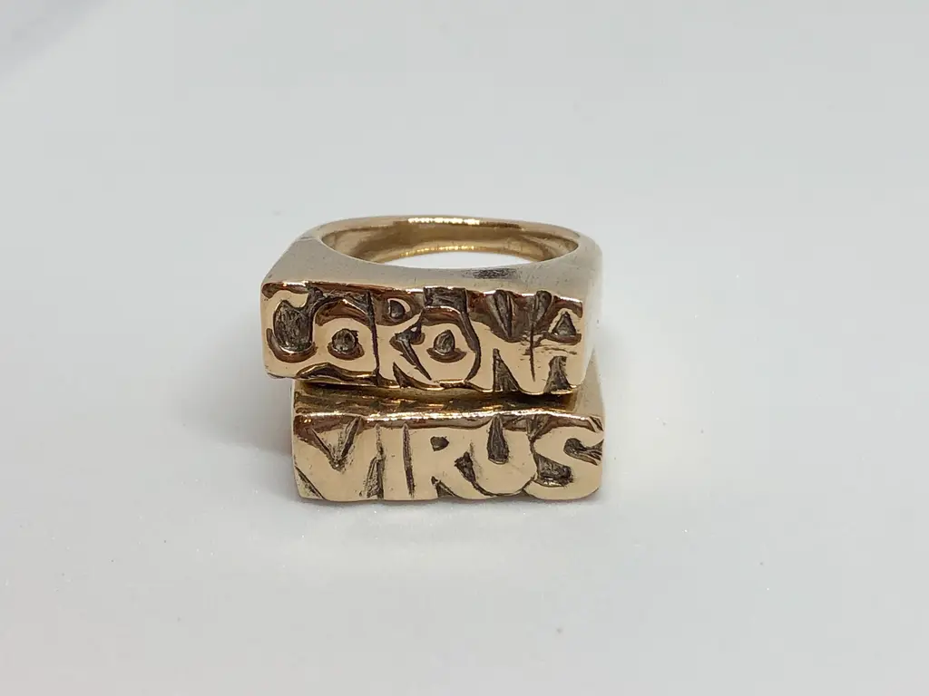 There’s a bathroom-tap shaped signet ring imploring us to wash our hands, a chain with a virus shaped pendant (reminiscent of a medieval mace and Gogo Yubari’s weapon in her legendary fight against Beatrix Kiddo, Kill Bill: Vol.1) and another spelling out the name of the global enemy we find ourselves fighting: Coronavirus.