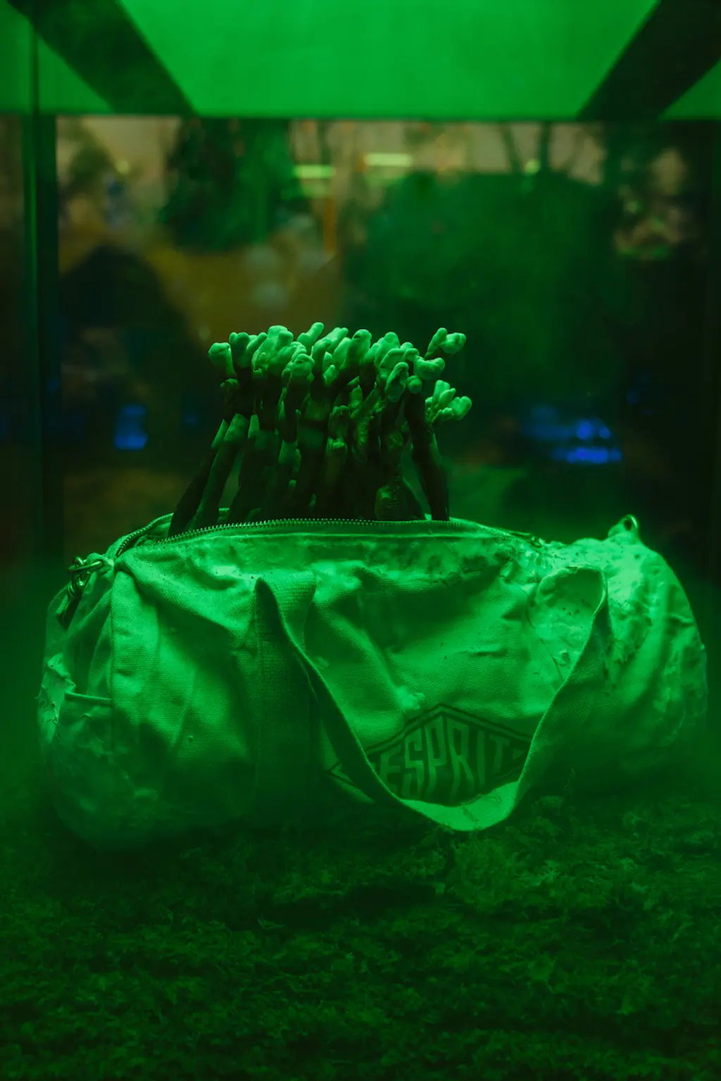To toast these plans, Esprit threw a “Laboratory of Nature” event in Berlin’s former electrical substation, E‑Werk, DJed by Honey Dijon. Guests could peer into glass cabinets filled with bags and T‑shirts given the mycelium treatment: oyster mushrooms and skinny varieties sprouting happily from preloved items. Old Esprit pieces were given a second life, too: the brand screen-printed psychedelic designs onto plain stockroom garments. Naturally, food at the event was all about the shrooms as much as the clothes, in the form of chanterelle and portobello canapés.