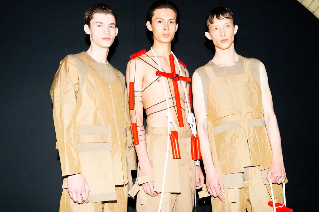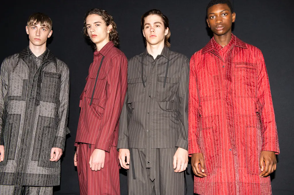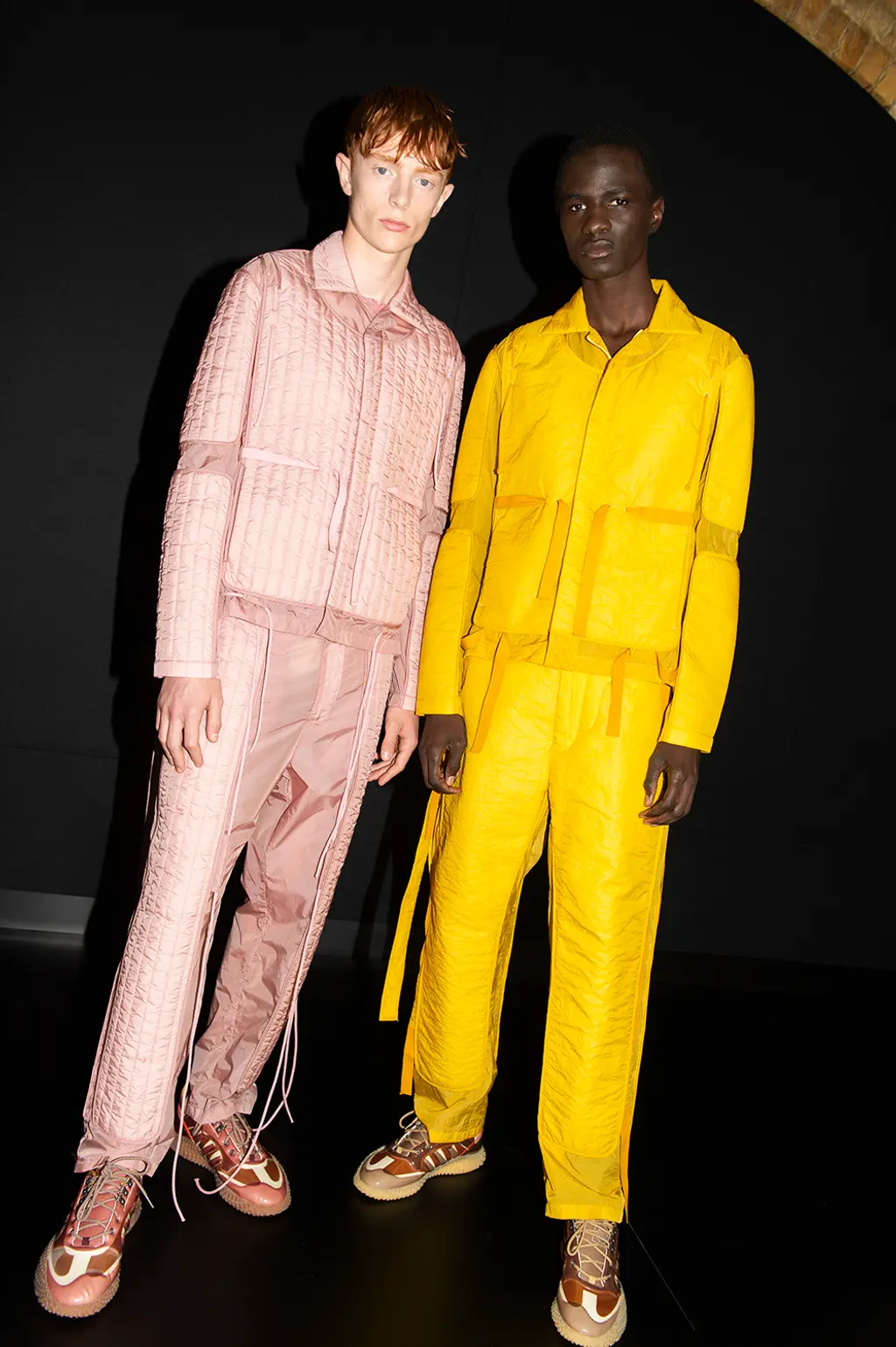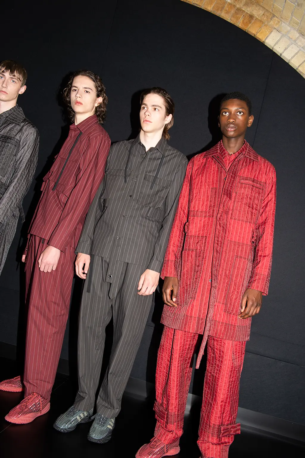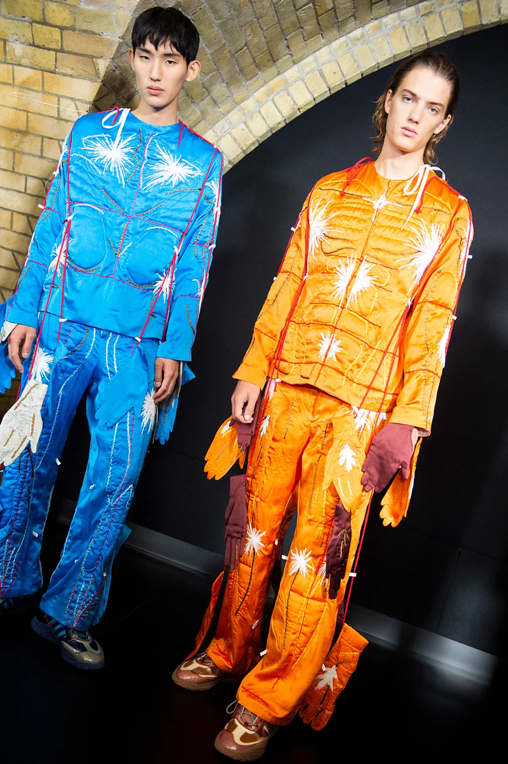 Backstage, Craig explained that he’d been down a rabbit hole watching YouTube mystery videos (you know, the ‘5 Unsolved Mysteries’ type) while working on SS20, many of which were focussed on Egypt, a theme that was subtly woven into the collection. He was also thinking about skin and the idea of protection. The show opened with two all black, all leather looks (with multiple pockets and double waist belts), before moving into a series of intricately embroidered ‘dream suits’ (more on these later), signature padded workwear-inspired uniforms in delicate silks, four loosely tailored gingham looks and ending with a rainbow of eight ‘lantern men’ wearing laser-cut paper doll-like looks inspired by Mexican Easter flags, which Craig explains are a nod to transformation, and the idea of a mirror being “full of possibilities”.