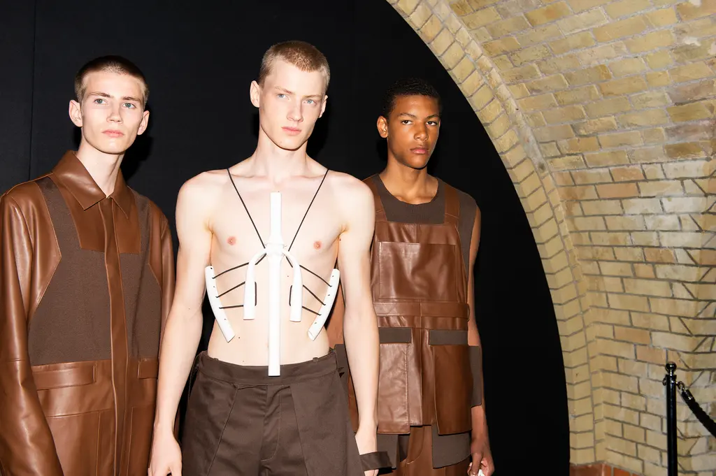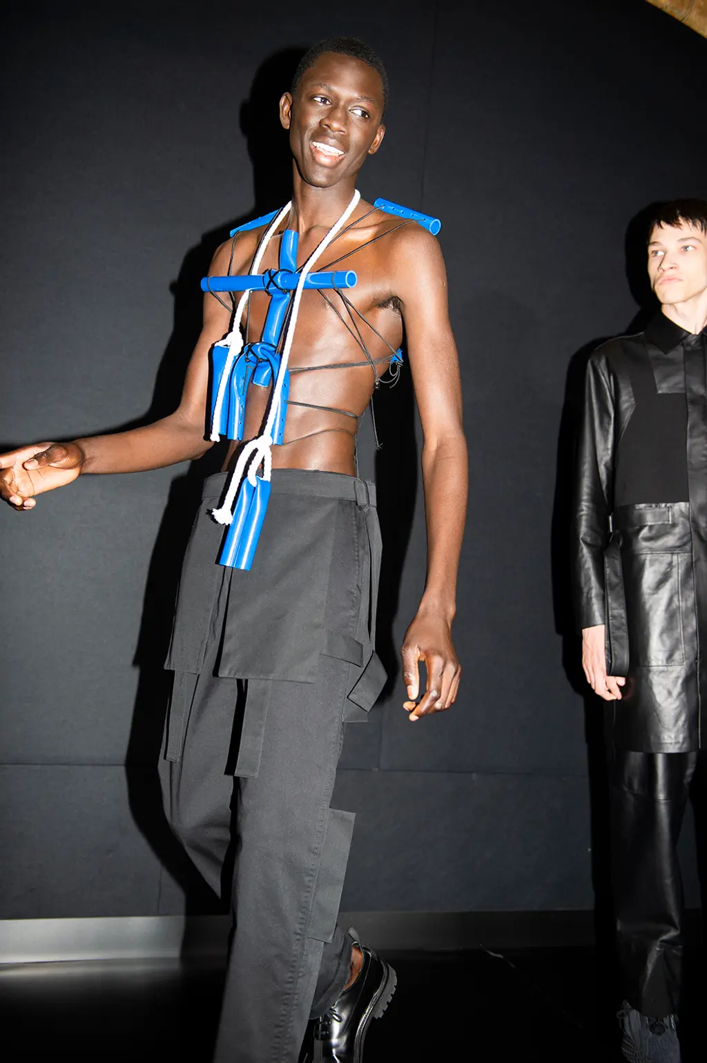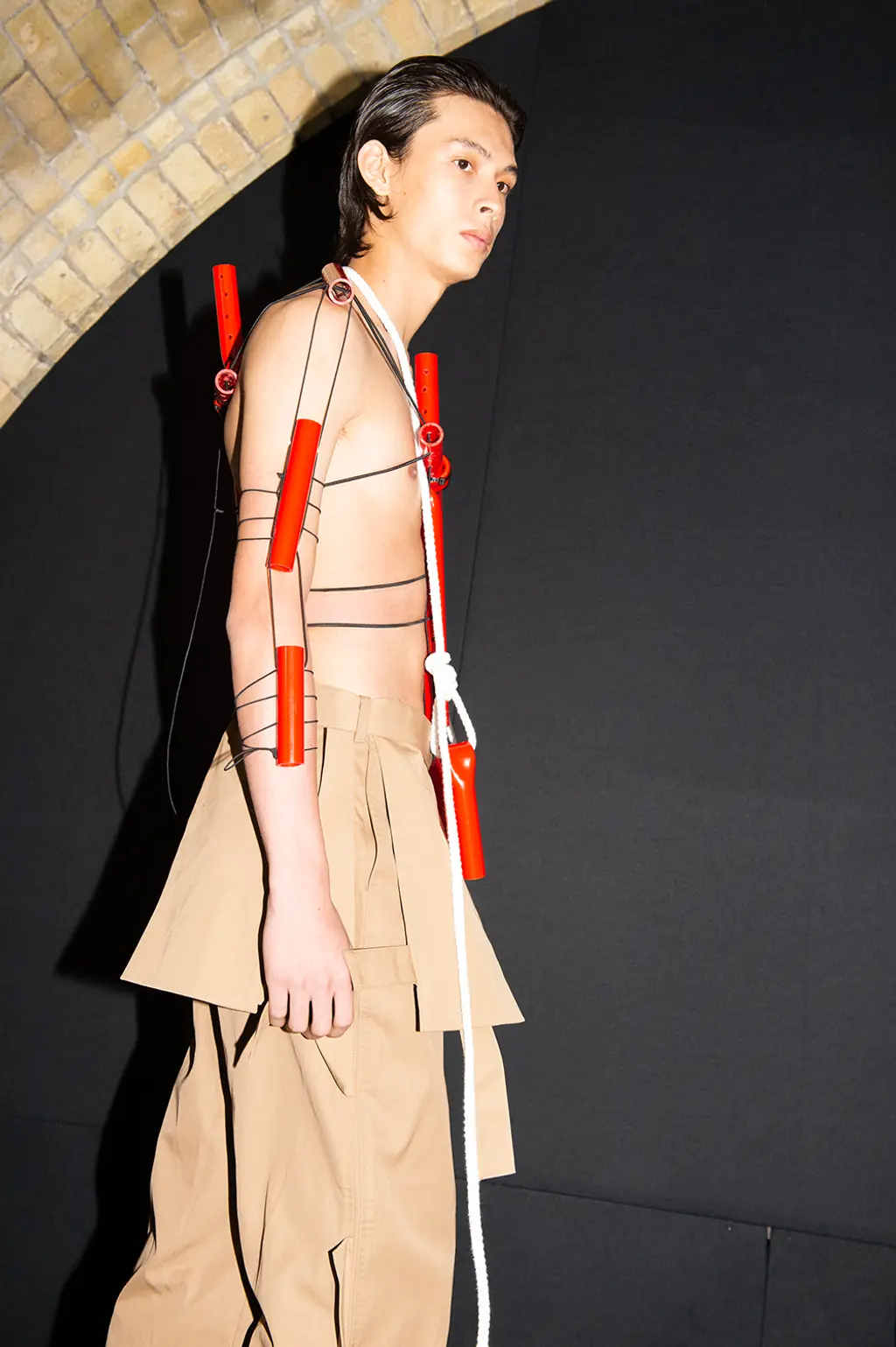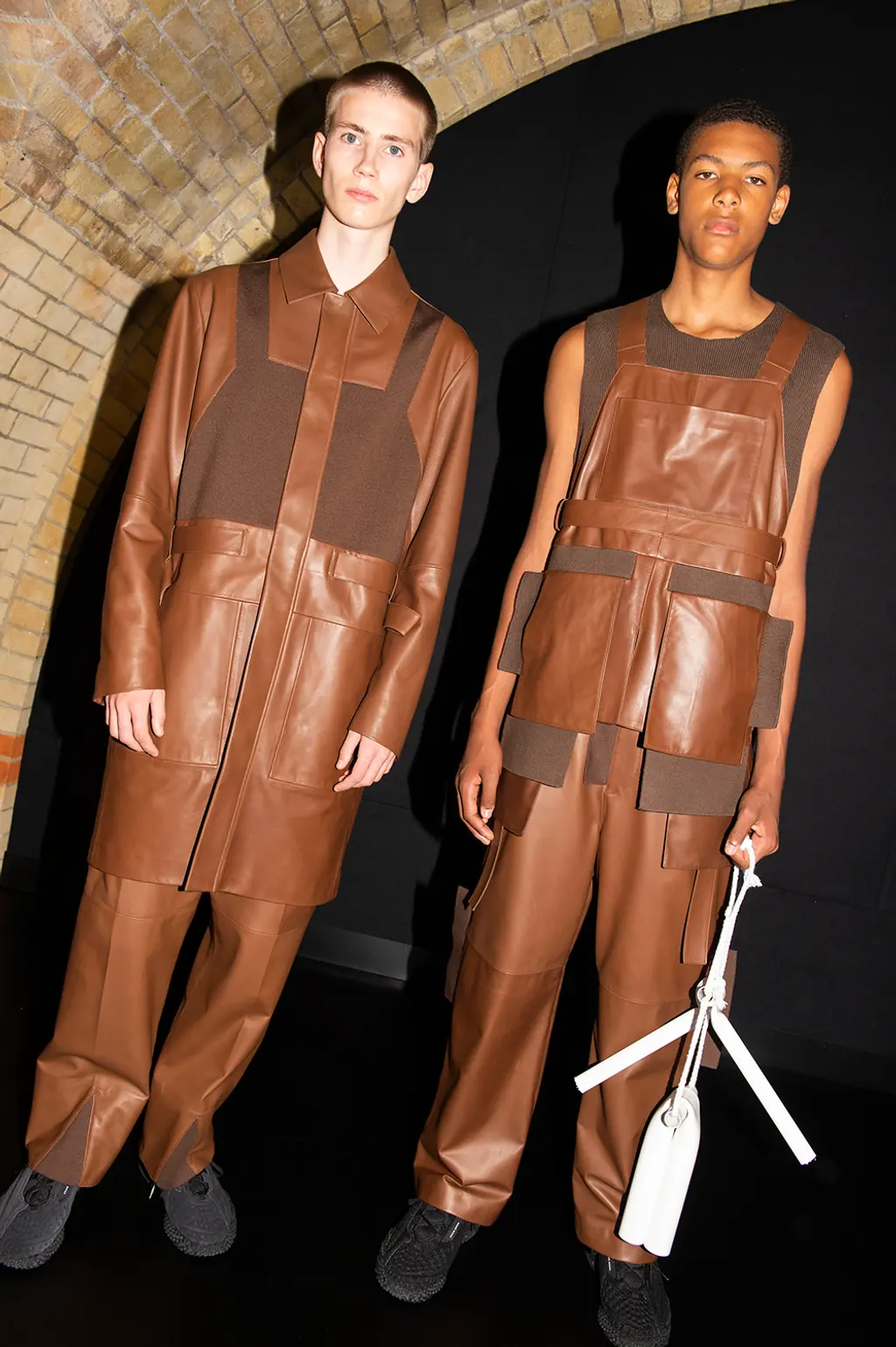 “In the beginning we were thinking a lot about skin – as a protector and as a layer that you can take off. I always feel like leather is a weird thing that you would wear to protect yourself when you’re motorcycling, but actually it’s skin and there’s something kinda disgusting about it. So the first section was leather and rib, and then it changed to a brown paper bag kind of material. I was also thinking about how in Ancient Egypt people were buried with their worldly possessions, which I think is such a strange thing, that when you pass you get put into a tomb or a coffin or a box to protect you, but [for your] whole life you’re never that protected. I think it’s such a strange thing. So it was about lightness and skin.”