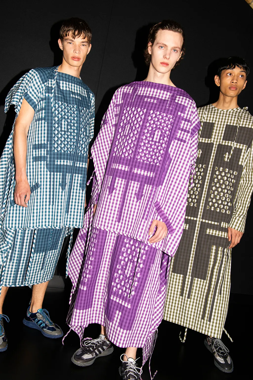 The prints that appeared on the gingham pieces were inspired by Marie Kondo, taken from those used by machinery designed to fold clothes. “I like the idea that you fold away your body,” explains Craig. “Without sounding too dark, I like the way that they look like recycling bags. Recycling bags for your body.”