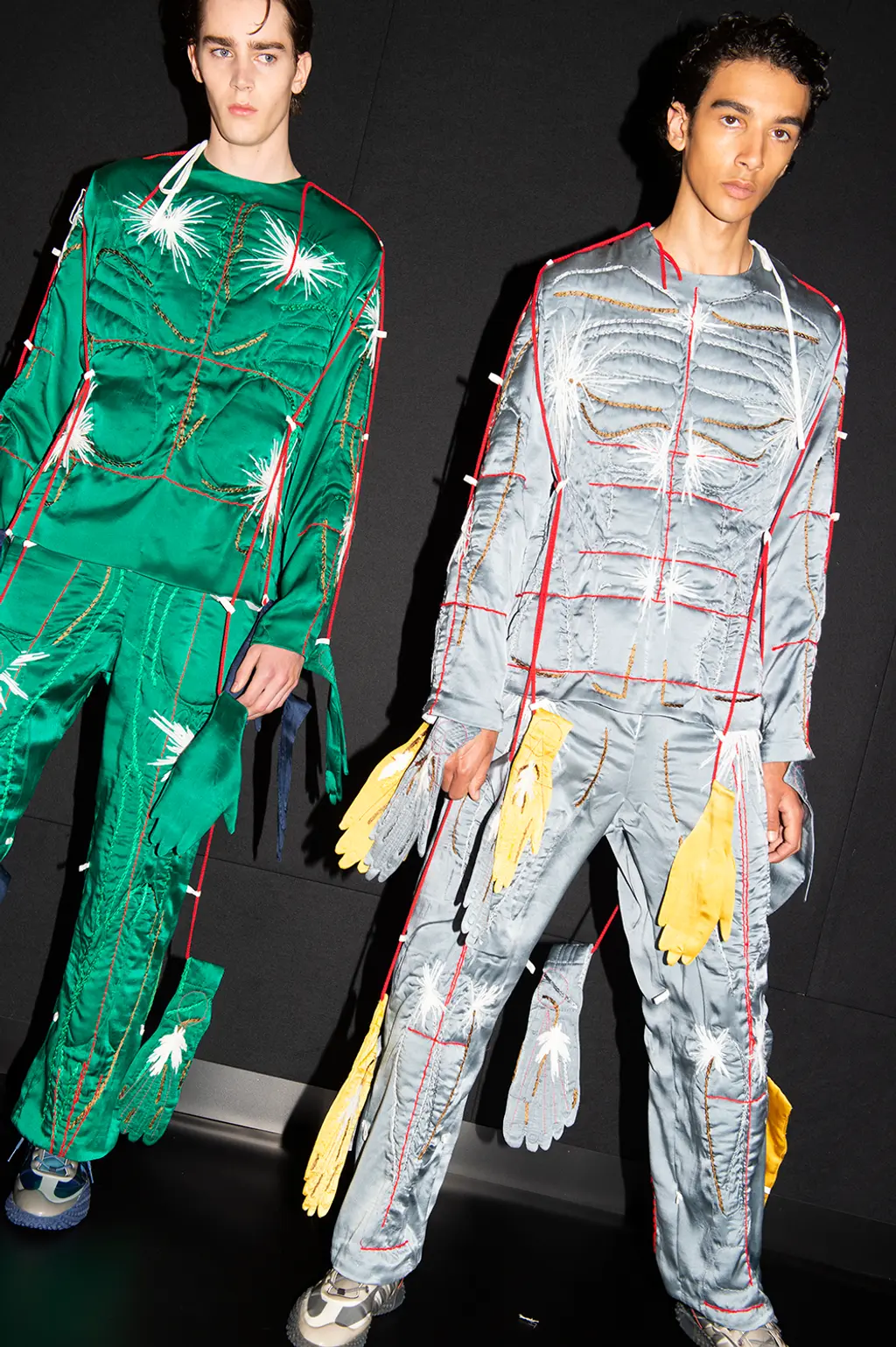 Yes – Craig’s ‘dream suits’, complete with external fabric hands suspended via string. As he explains, “We wanted to make a suit that looked like something you would wear to dream in. They’re hand-embroidered on padded silk bodily shapes and inspired by anatomical drawings of bodies where the muscles almost look like flowers. I saw an image on the BBC that showed what a woman looks like when you strip back her skin (which is an image you never see) – it’s almost like the muscles and the glands inside the breast are like flowers. It was taken from that idea.”