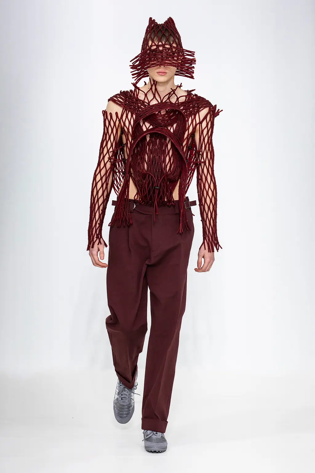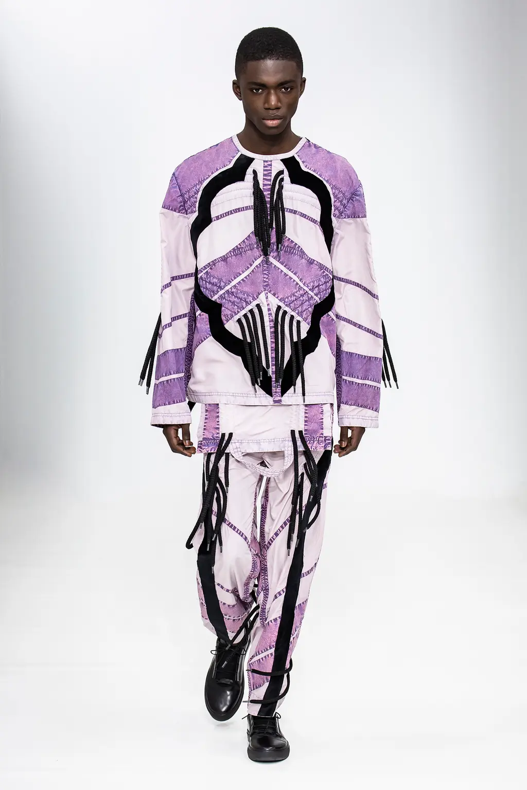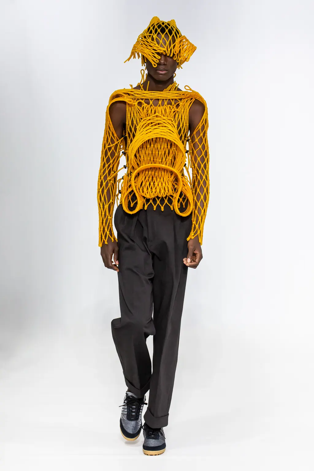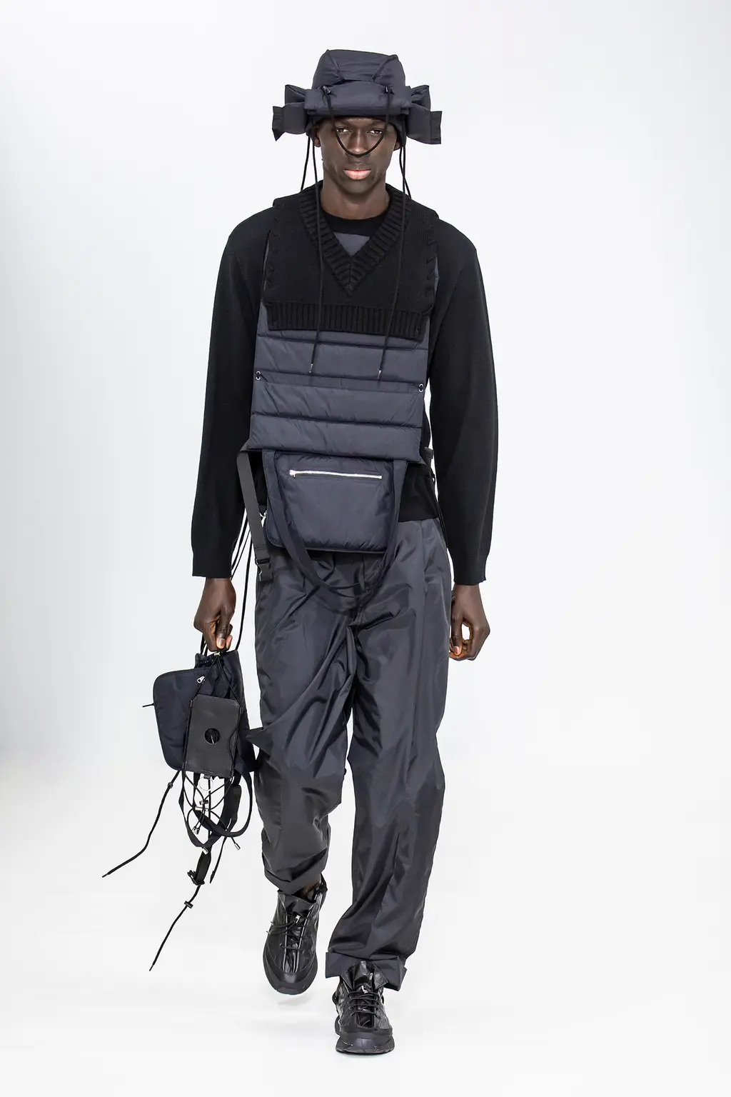 Whilst the wackiest, jaw-dropping looks always grab the headlines (and probably provoke the most scorn for people who like to laugh at fashion), there’s always the highly wearable stuff: the trousers, the accessories, the adidas-collab trainers. And there are audacious pieces that the more fashion-forward can’t resist: the mini V‑neck collar knits, the roll-down blind hats and the multi-lace separates (the one with lilac and acid-washed purple denim being the stand-out).