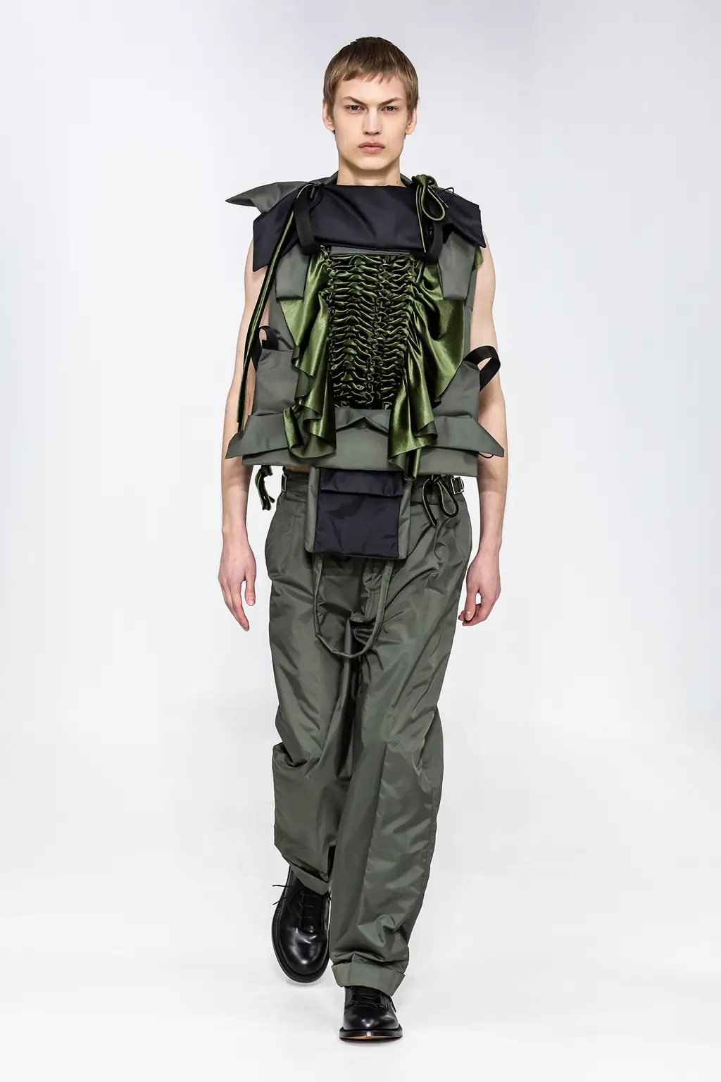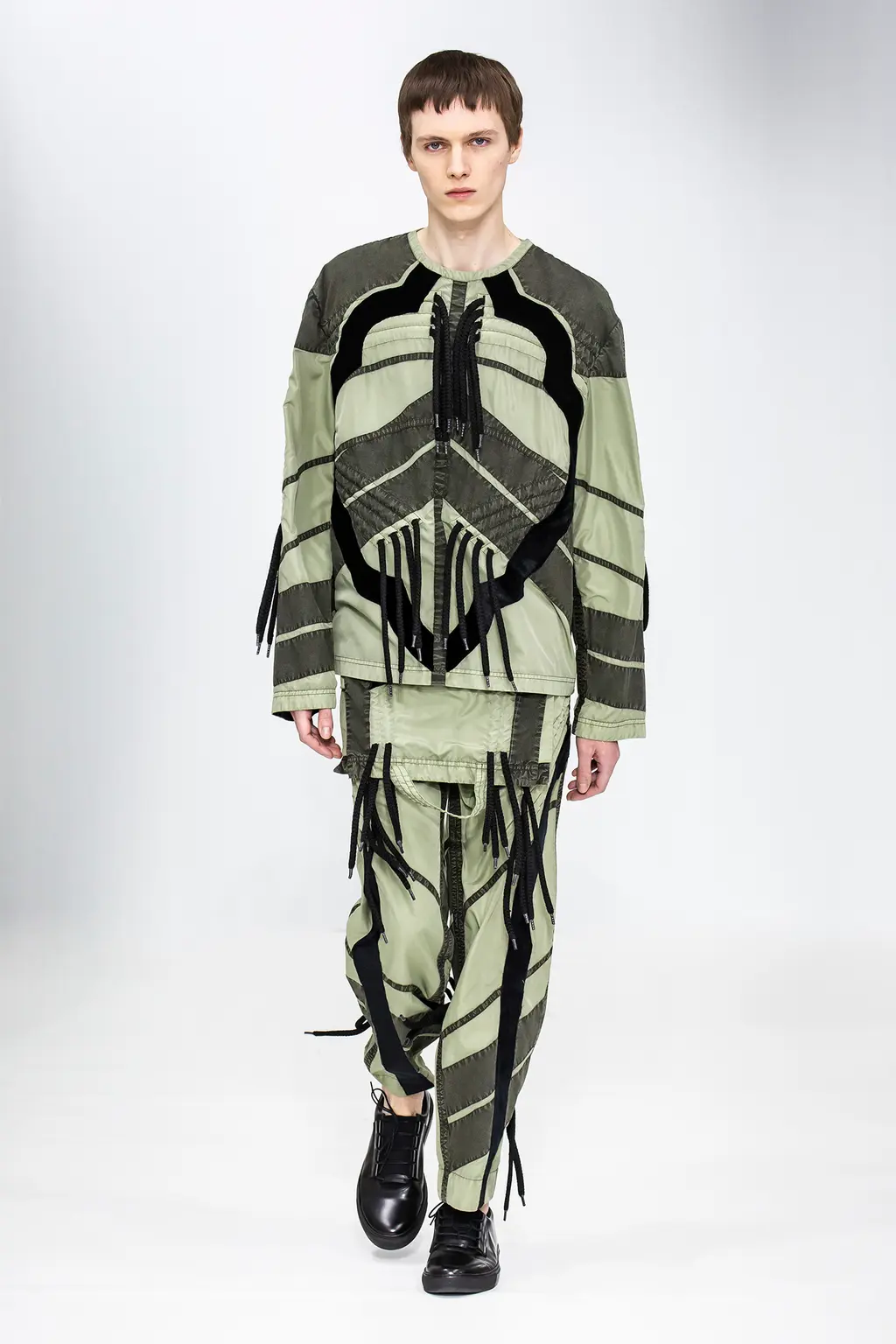 With his quilting and laces, Craig Green has a signature that his fans can’t get enough of. Somehow he manages to manipulate his familiar designs to conjure up different characters and images: this time monks, bomb disposal experts, kids’ kites and fruit protecting foam.