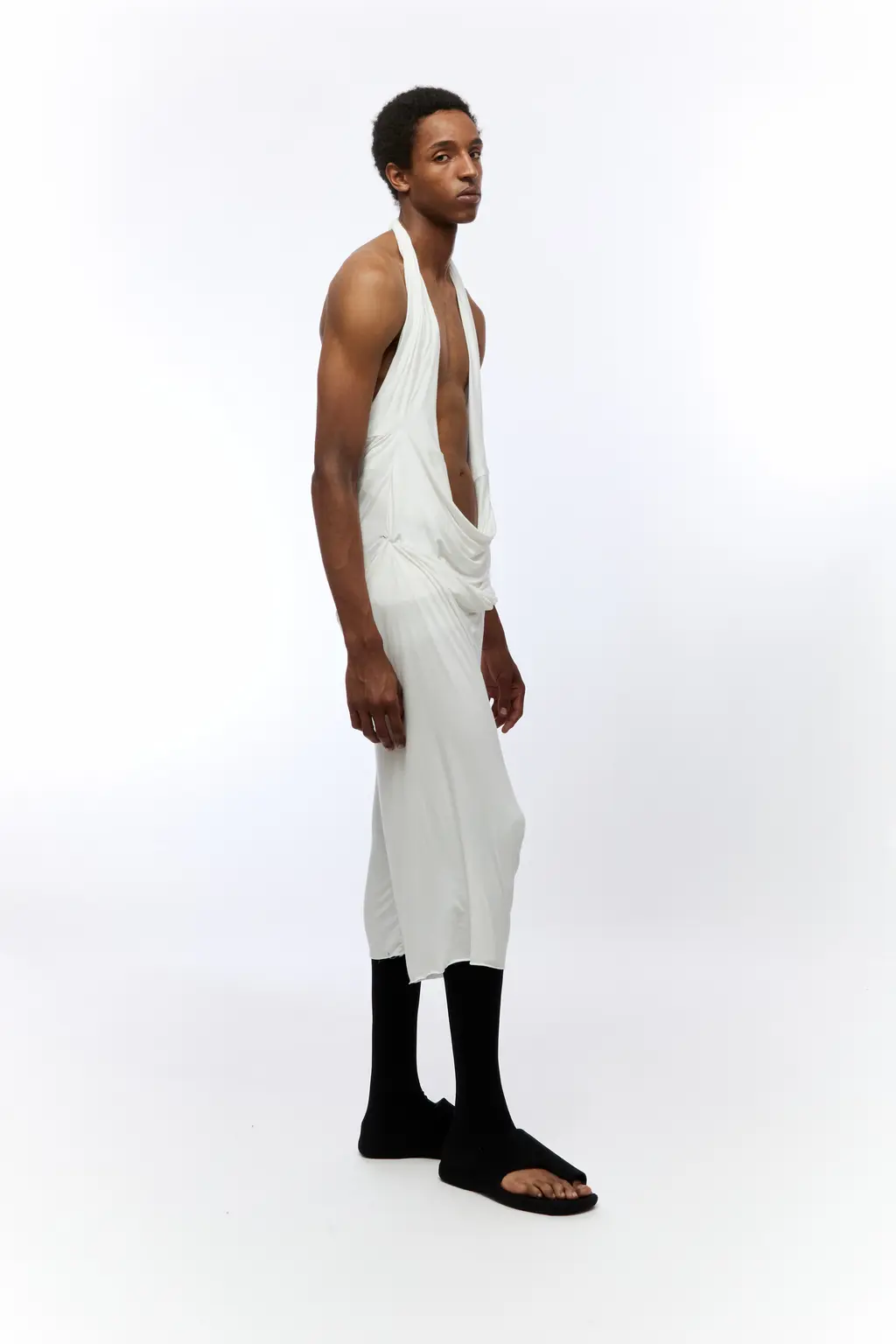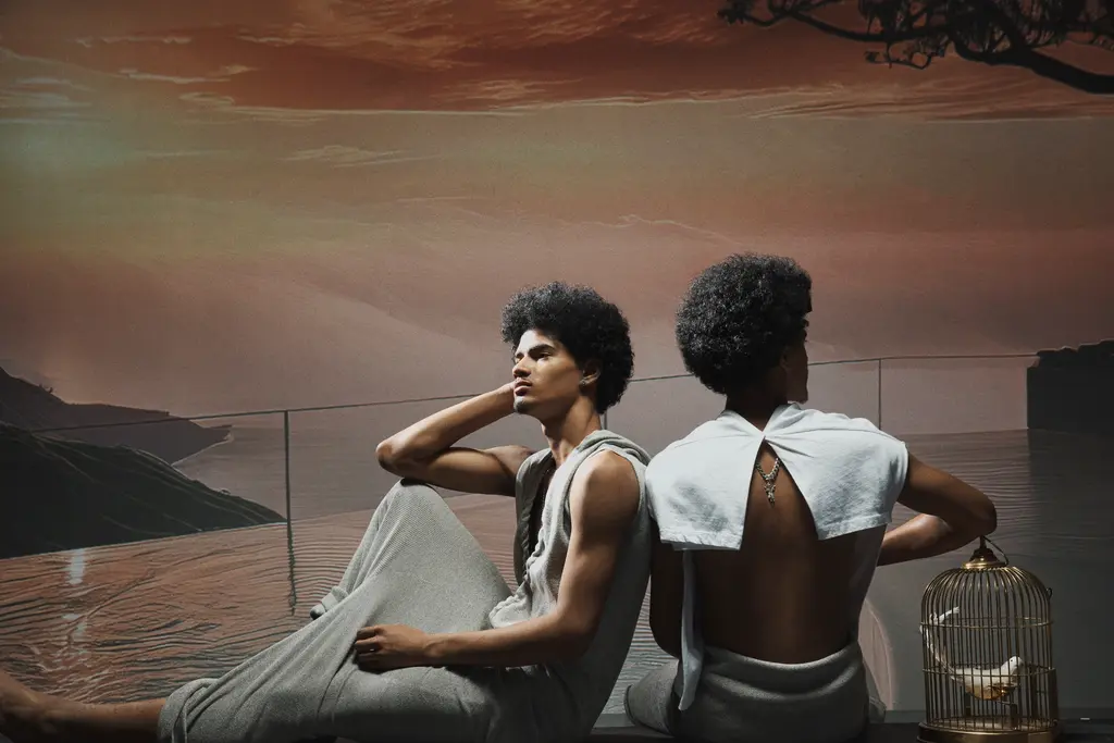 Inspired by a utopian world with no restraint or policing around Black men’s self-expression, DJ’s first collection features 25 looks, from hooded jumpsuits to halterneck dresses and drop crotch denim. Those six years of collecting references and affixing them to a binder helped DJ to consider what he wanted to offer. “I was thinking of doing just six to nine couture gowns. And everybody looked at me sideways. It became more about ‘what do we need in menswear right now?’ And then I just made a bunch of shit.”
