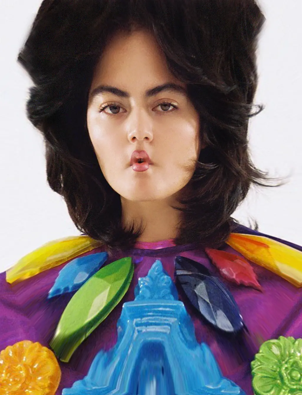 Born and raised in California’s San Gabriel Valley, the Taiwanese-American has a knack for repurposing materials to captivating effect. Her most recent collection’s overarching theme centres around the use of recycled plastic, featuring hand-painted bijoux earrings moulded from vintage chandelier and furniture pieces, hand-feathered hats, colour-changing lenticular bags and a cow print cropped suit, hyper-coloured, garish and incorporating unique textures such as holographic rubber.