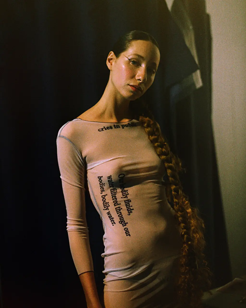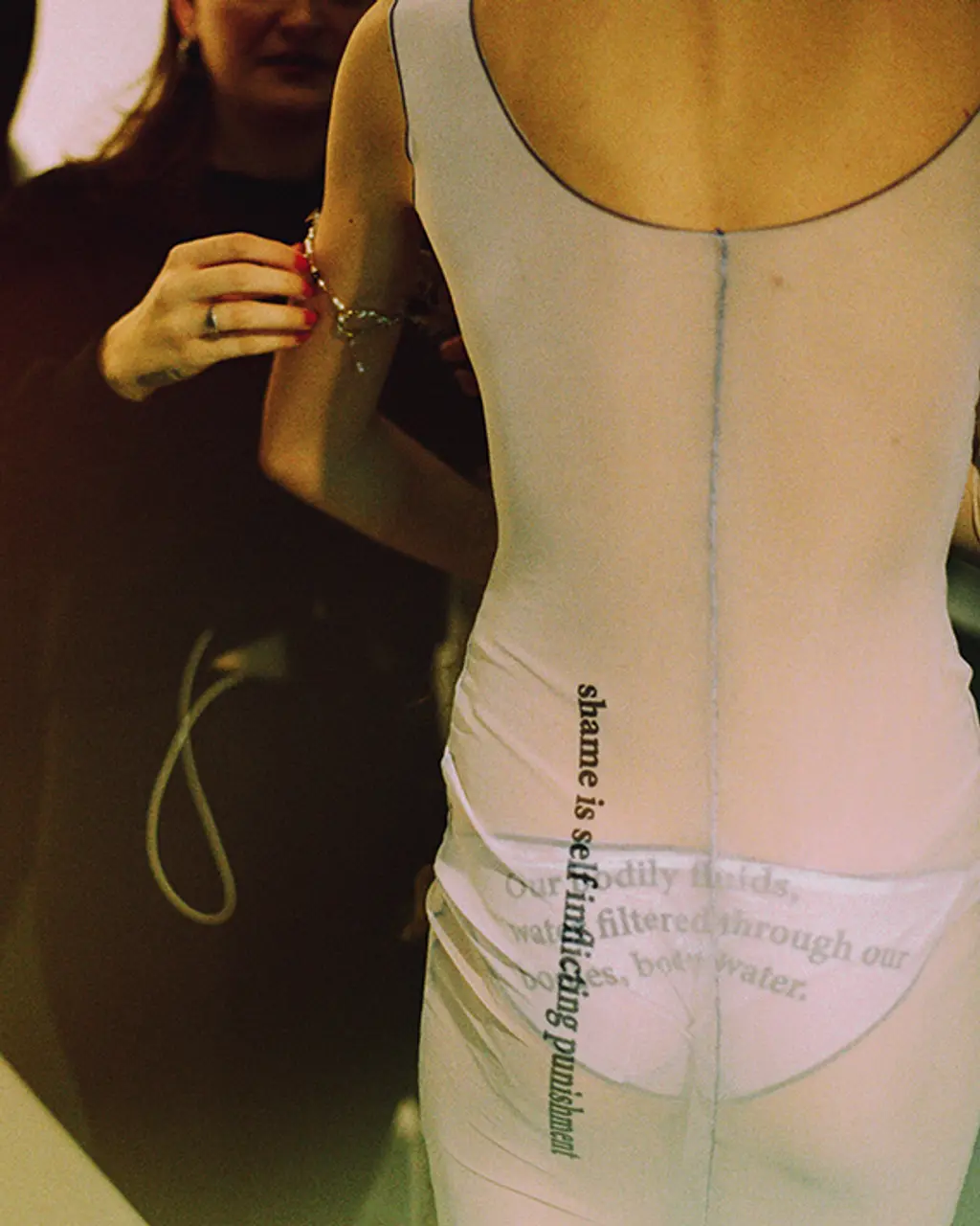 When designing the “soaked” dresses, Petsa had been envisioning a woman with a wet vagina walking down the street “fully accepting that she is constantly wet”. Petsa later points out that, for women, wetness is something that “distinguishes if they’ll have sex or not”. Intimacy is something else that heavily influences Petsa’s work: “I’ve always had a very deep connection with strangers – I’ll meet someone new and they’ll tell me their deepest secrets.”