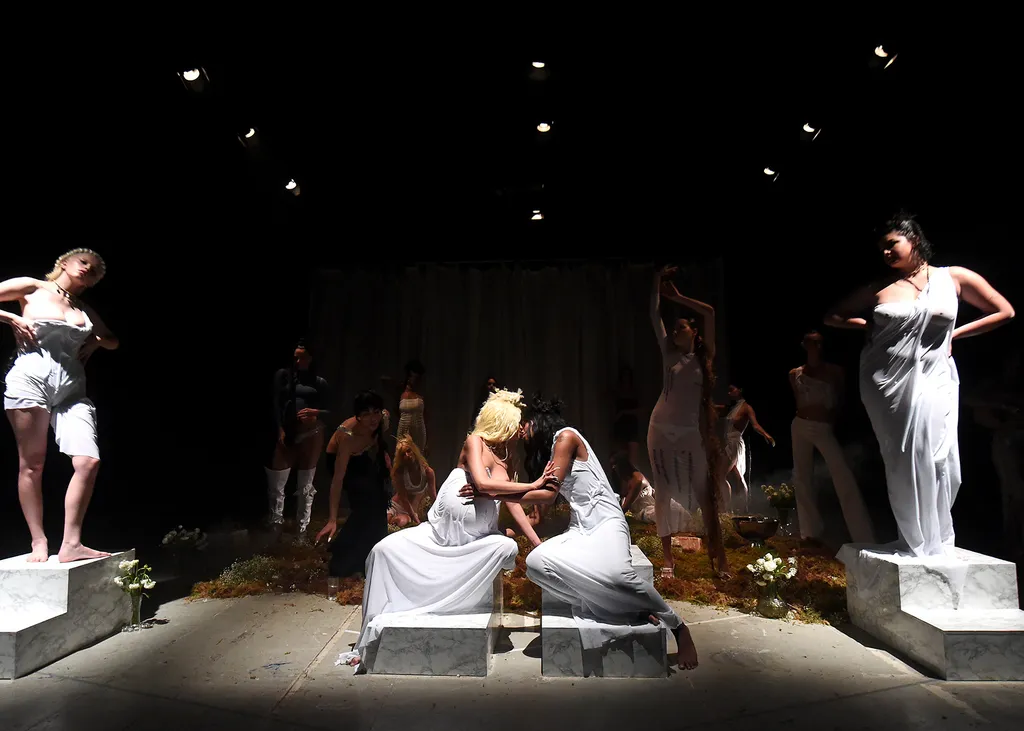A make-shift pond was placed in one corner – that models dipped their hands in and out of – surrounded by an abundance of blooming flowers, marble steps and miniature Greek columns. Petsa herself stood front and centre, involved in the performance.