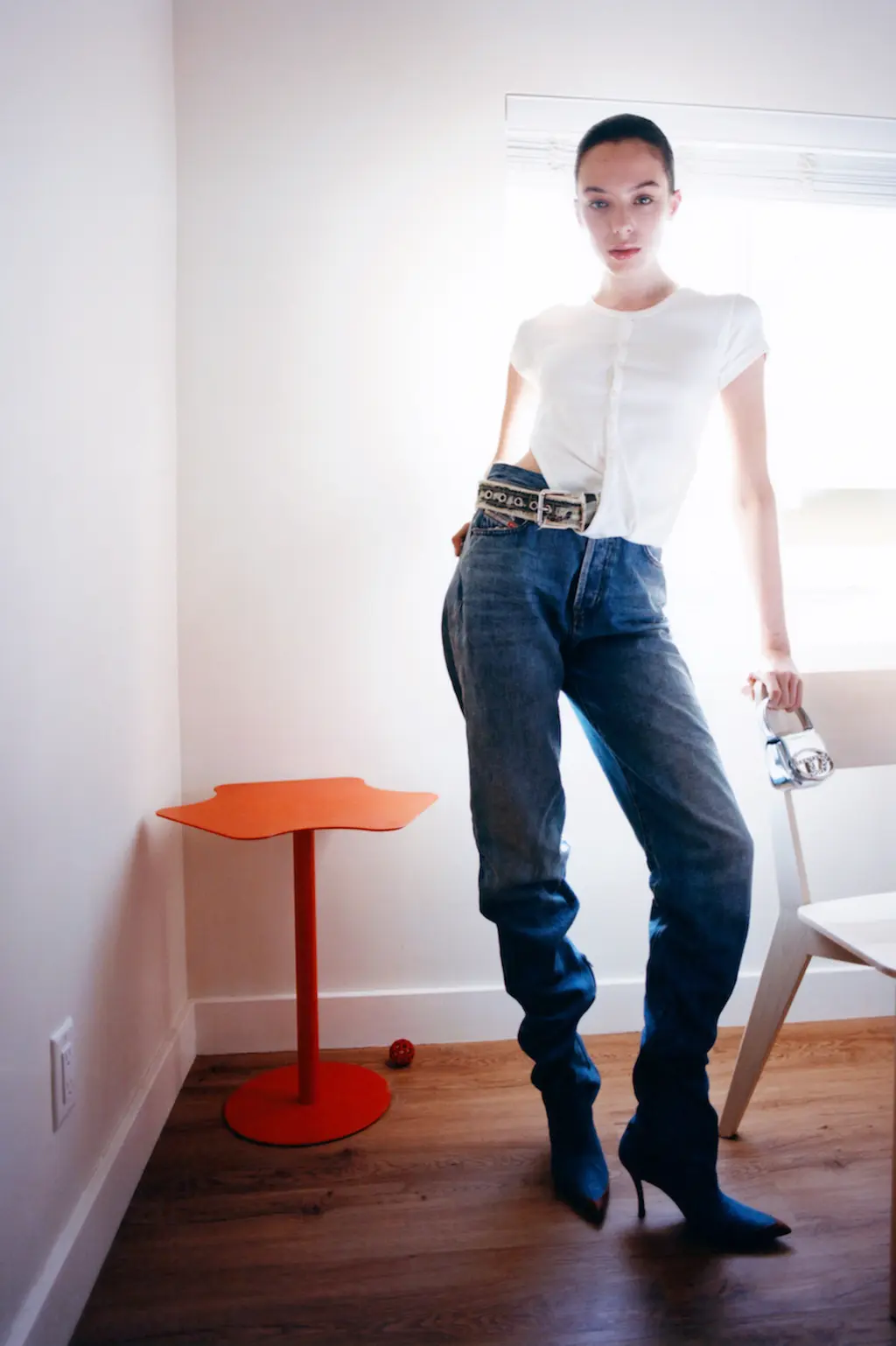 Ella wears Diesel Library 2002 5 Pocket, B-1DR Belt and Nille Bag