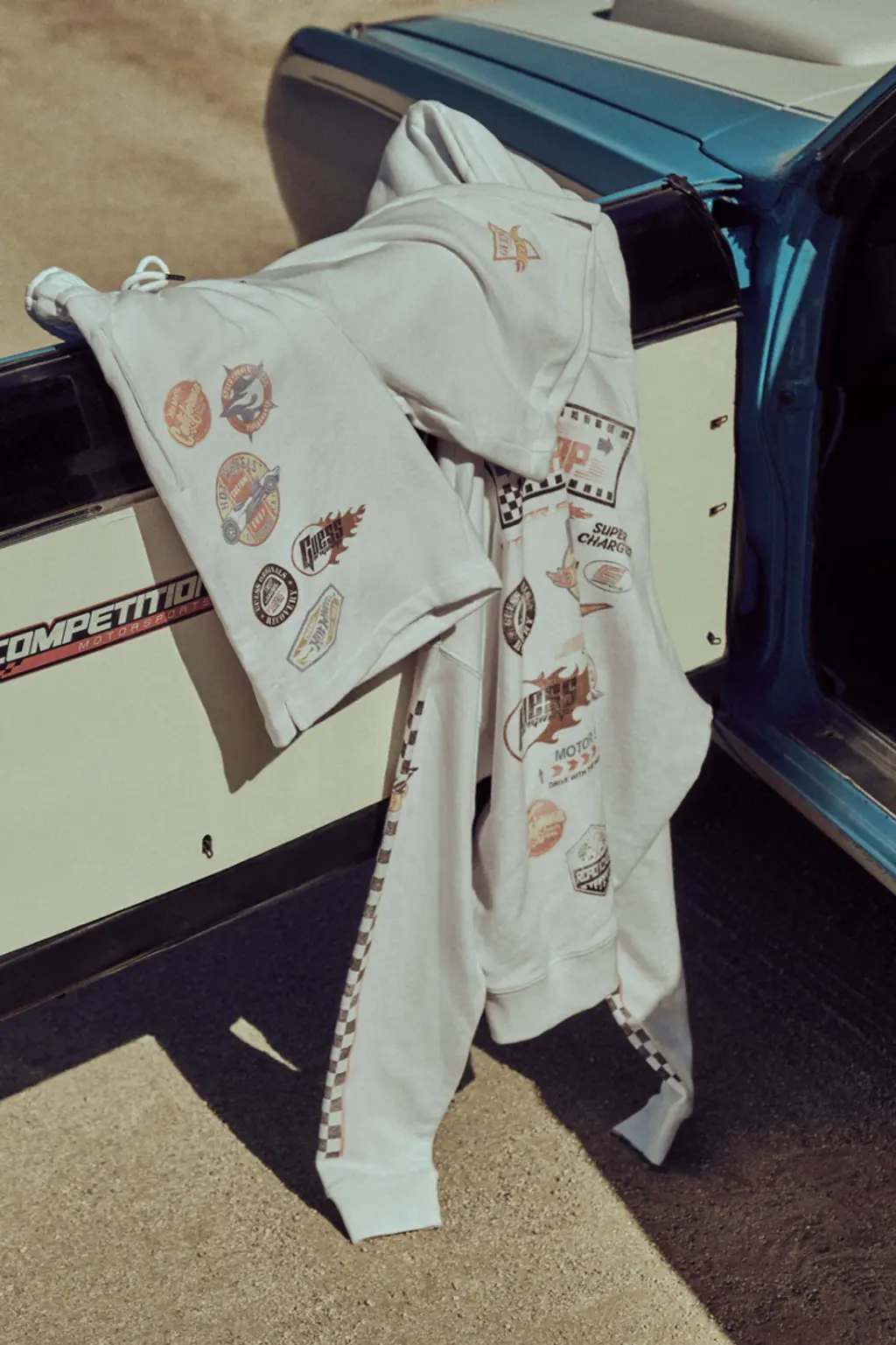 Foot on the pedal for this one: Guess Originals has teamed up with Hot Wheels for its summer capsule collection, getting all nostalgic with the toy cars to compliment a limited-edition collection inspired by old-school racing. Featuring 14 pieces, Guess’ seasonal offering is a bold one. Expect an embroidered racing jacket, a slick patchwork print hoodie, vintage-washed graphic tees, tank tops and a killer track cap. Vroooom.
